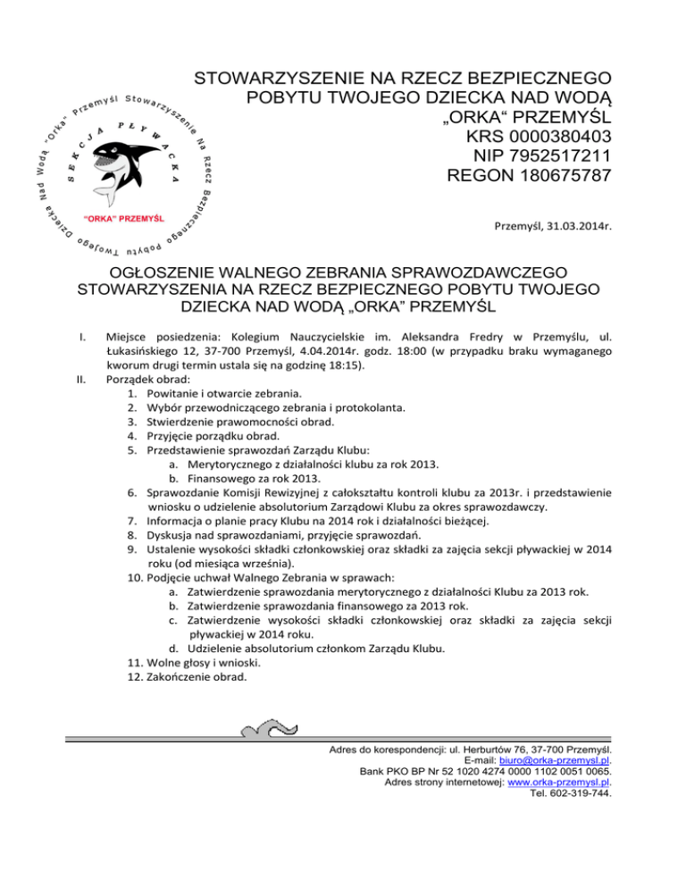 STOWARZYSZENIE NA RZECZ BEZPIECZNEGO POBYTU TWOJEGO DZIECKA NAD WODĄ „ORKA“ PRZEMYŚL KRS 0000380403 NIP 7952517211 REGON 180675787 Przemyśl, 31.03.2014r. OGŁOSZENIE WALNEGO ZEBRANIA SPRAWOZDAWCZEGO STOWARZYSZENIA NA RZECZ BEZPIECZNEGO POBYTU TWOJEGO DZIECKA NAD WODĄ „ORKA” PRZEMYŚL I. II. Miejsce posiedzenia: Kolegium Nauczycielskie im. Aleksandra Fredry w Przemyślu, ul. Łukasińskiego 12, 37-700 Przemyśl, 4.04.2014r. godz. 18:00 (w przypadku braku wymaganego kworum drugi termin ustala się na godzinę 18:15). Porządek obrad: 1. Powitanie i otwarcie zebrania. 2. Wybór przewodniczącego zebrania i protokolanta. 3. Stwierdzenie prawomocności obrad. 4. Przyjęcie porządku obrad. 5. Przedstawienie sprawozdań Zarządu Klubu: a. Merytorycznego z działalności klubu za rok 2013. b. Finansowego za rok 2013. 6. Sprawozdanie Komisji Rewizyjnej z całokształtu kontroli klubu za 2013r. i przedstawienie wniosku o udzielenie absolutorium Zarządowi Klubu za okres sprawozdawczy. 7. Informacja o planie pracy Klubu na 2014 rok i działalności bieżącej. 8. Dyskusja nad sprawozdaniami, przyjęcie sprawozdań. 9. Ustalenie wysokości składki członkowskiej oraz składki za zajęcia sekcji pływackiej w 2014 roku (od miesiąca września). 10. Podjęcie uchwał Walnego Zebrania w sprawach: a. Zatwierdzenie sprawozdania merytorycznego z działalności Klubu za 2013 rok. b. Zatwierdzenie sprawozdania finansowego za 2013 rok. c. Zatwierdzenie wysokości składki członkowskiej oraz składki za zajęcia sekcji pływackiej w 2014 roku. d. Udzielenie absolutorium członkom Zarządu Klubu. 11. Wolne głosy i wnioski. 12. Zakończenie obrad. Adres do korespondencji: ul. Herburtów 76, 37-700 Przemyśl. E-mail: [email protected]. Bank PKO BP Nr 52 1020 4274 0000 1102 0051 0065. Adres strony internetowej: www.orka-przemysl.pl. Tel. 602-319-744.