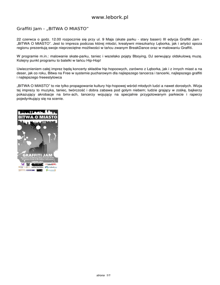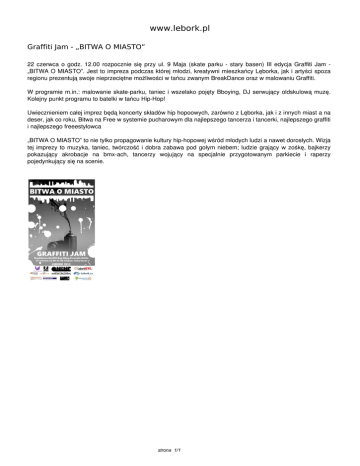 www.lebork.pl Graffiti Jam - „BITWA O MIASTO” 22 czerwca o godz. 12.00 rozpocznie się przy ul. 9 Maja (skate parku - stary basen) III edycja Graffiti Jam „BITWA O MIASTO”. Jest to impreza podczas której młodzi, kreatywni mieszkańcy Lęborka, jak i artyści spoza regionu prezentują swoje nieprzeciętne możliwości w tańcu zwanym BreakDance oraz w malowaniu Graffiti. W programie m.in.: malowanie skate-parku, taniec i wszelako pojęty Bboying, DJ serwujący oldskulową muzę. Kolejny punkt programu to batelki w tańcu Hip-Hop! Uwiecznieniem całej imprez będą koncerty składów hip hopoowych, zarówno z Lęborka, jak i z innych miast a na deser, jak co roku, Bitwa na Free w systemie pucharowym dla najlepszego tancerza i tancerki, najlepszego graffiti i najlepszego freeestylowca „BITWA O MIASTO” to nie tylko propagowanie kultury hip-hopowej wśród młodych ludzi a nawet dorosłych. Wizja tej imprezy to muzyka, taniec, twórczość i dobra zabawa pod gołym niebem; ludzie grający w zośkę, bajkerzy pokazujący akrobacje na bmx-ach, tancerzy wojujący na specjalnie przygotowanym parkiecie i raperzy pojedynkujący się na scenie. strona 1/1 Powered by TCPDF (www.tcpdf.org)