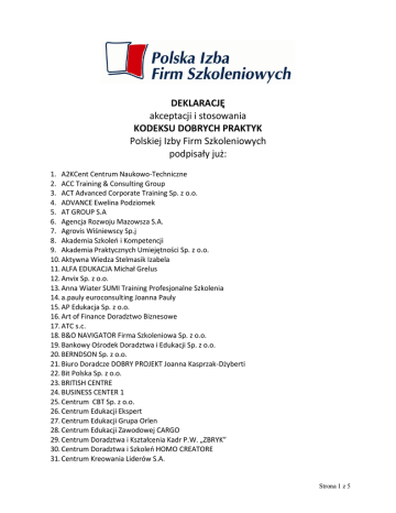 DEKLARACJĘ akceptacji i stosowania KODEKSU DOBRYCH PRAKTYK Polskiej Izby Firm Szkoleniowych podpisały już: 1. A2KCent Centrum Naukowo-Techniczne 2. ACC Training & Consulting Group 3. ACT Advanced Corporate Training Sp. z o.o. 4. ADVANCE Ewelina Podziomek 5. AT GROUP S.A 6. Agencja Rozwoju Mazowsza S.A. 7. Agrovis Wiśniewscy Sp.j 8. Akademia Szkoleń i Kompetencji 9. Akademia Praktycznych Umiejętności Sp. z o.o. 10. Aktywna Wiedza Stelmasik Izabela 11. ALFA EDUKACJA Michał Grelus 12. Anvix Sp. z o.o. 13. Anna Wiater SUMI Training Profesjonalne Szkolenia 14. a.pauly euroconsulting Joanna Pauly 15. AP Edukacja Sp. z o.o. 16. Art of Finance Doradztwo Biznesowe 17. ATC s.c. 18. B&O NAVIGATOR Firma Szkoleniowa Sp. z o.o. 19. Bankowy Ośrodek Doradztwa i Edukacji Sp. z o.o. 20. BERNDSON Sp. z o.o. 21. Biuro Doradcze DOBRY PROJEKT Joanna Kasprzak-Dżyberti 22. Bit Polska Sp. z o.o. 23. BRITISH CENTRE 24. BUSINESS CENTER 1 25. Centrum CBT Sp. z o.o. 26. Centrum Edukacji Ekspert 27. Centrum Edukacji Grupa Orlen 28. Centrum Edukacji Zawodowej CARGO 29. Centrum Doradztwa i Kształcenia Kadr P.W. „ZBRYK” 30. Centrum Doradztwa i Szkoleń HOMO CREATORE 31. Centrum Kreowania Liderów S.A. Strona 1 z 5 32. Centrum Kształcenia i Szkolenia Sp. z o.o. 33. Centrum Rozwiązań Menedżerskich S.A. 34. Centrum Rozwoju Coaching i Szkolenia 35. Centrum Szkoleniowo-Doradcze "KREATOR" Alina Plata 36. Centrum Szkolenia Zawodowego Sp. z o.o. 37. Centrum Tłumaczeń, Doradztwa i Edukacji PRAGMATIC 38. KORA Centrum Szkoleń 39. Centrum Szkolenia i Promocji „Prestige” 40. Centrum Szkoleniowe MENTOR 41. Centrum Szkoleń i Innowacji Grzegorz Miszczak 42. Certes Sp. z o.o. 43. CoachWise S.A. 44. COMARTIN - Szkolenia, Konsulting, Badania Rynku 45. Communication One Consulting Sp. z o.o. 46. Conart Sp. z o.o. 47. CONSULTING Firma Doradczo-Szkoleniowa Julita Orłowska-Szczepańska 48. Consultor Sp. Z o.o. 49. Consulman Pl Sp. z o.o. 50. CS Szkolenie I Doradztwo Sp. z o.o. 51. CE2 Centrum Edukacji M. Dziewa, E. Tarnas-Szwed Sp.j. 52. Creator Sp. z o.o. 53. Deinde Sp. z o.o. 54. DOOR GROUP S.A. 55. DOSCO Sp. z o.o. 56. DOSKAM Sp. z o.o. 57. CEDEGO 58. EMT-SYSTEMS Grzegorz Wszołek 59. English Unlimited Sp. z o.o. 60. ETTA Monika Chutnik 61. Europejski Instytut Edukacji Informatycznej 62. Europejski Instytut Psychologii Biznesu sp.j. 63. Europejskie Centrum Kształcenia "Eureka" Sp. z o.o. 64. Eurotraining - szkolenia i doradztwo Katarzyna Gieniec-Sarna 65. Eurocentrum Innowacji i Przedsiębiorczości 66. EXBIS Eksperci Biznesmenom - Szopa i Szóstak Sp. J. 67. Danish Technological Institute Polska Sp. z o.o. (dawniej FIRMA 2000 Sp. z o.o.) 68. Firma Szkoleniowa TRAKT 69. Fundacja Edukacja Bez Granic 70. Fundacja Nauki Języków Obcych „Linguae Mundi” 71. Fundacja Rozwoju Bankowości Spółdzielczej we Wrocławiu 72. Fundacja „Wałbrzych 2000” 73. Fundacja Warszawski Instytut Bankowości 74. GB Resources Polska Sp. z o.o. 75. Grupa Doradcza Projekt Sp. z o.o. 76. Grupa EK’s Polska 77. Grupa OSB s.c. Strona 2 z 5 78. Halibut Grupa Szkoleniowa Jakub Pałczyński 79. HEIDTMAN&PIASECKI 80. Konsorcjum doradczo - szkoleniowe S.A 81. HRP Czernecka, Jaszczyński sp.j. 82. Human Partner 83. Human Solutions E. Borowska, E. Pytlak Sp.j. 84. IDES Consultants Polska Sp. z o.o. 85. IMPACT POLSKA Sp. z o.o. 86. INCEPT Adam Tittinger i Wspólnik Spółka Jawna 87. INSPIRE Centrum Rozwoju Umiejętności s.c. Jakub Poradzisz, Lidia Poradzisz 88. Instytut Samorządu i Administracji Sp. z o.o. 89. INTEGRA Consulting 90. "INFO-BIZ" Profesjonalna Edukacja Mariola Wiśniewska 91. Inventi Consulting s.c. 92. Invento Marta Kowalczyk 93. INVICTUS Sp. z o.o. Ośrodek Konsultingowo Szkoleniowy 94. IRP Inwestycje-Rozwój-Personel Jarosław Niemczyk 95. J.G. Training Jadwiga Gwóźdź 96. JGL Logistics Wojtysiak Spółka Jawna 97. KDK INFO Sp. z o.o. 98. Centrum "TROP" Sp. z o.o. 99. Kontekst HR Sp. z o.o. 100. Kontrakt-OSH J.Gut, W.Haman, R.Zych Sp. J 101. Korporacja Umiejętności - ARKA Marcin Rogowski 102. Lauren Peso Polska S.A 103. Learn UP Sp. z o.o. 104. LEBIEDŹ CONSULTING Tomasz Lebiedź 105. Lechaa Consulting Sp. z o.o. 106. LP Products - Centrum Szkoleń i Kalibracji s.c Edward Lupa 107. Szkoła Języków Obcych MANDRAGORA Małgorzata Krawczyk 108. M&M Centrum Kształcenia Pielęgniarek s.c. 109. Mazowieckie Centrum Szkoleń Sp. z o.o. 110. Marzena Biuro Reklamowo – Handlowe Zbigniew Banaszek 111. Meditor Ośrodek Kształcenia Ustawicznego 112. MEDIATOR Ośrodek Szkoleń i Doradztwa Gospodarczego Małgorzata Wierzęć 113. Miedziowe Centrum Kształcenia Kadr Sp. z o.o. 114. MIĘDZYNARDOWA SZKOŁA BANKOWOŚCI I FINANSÓW Sp. z o.o. 115. MindLab Sp. z o.o. 116. MODERATOR s.c. 117. MPM Productivity Management Sp. z o.o. 118. MTD Marek Dziduszko 119. Nowe Motywacje Sp. z o.o. 120. OSI CompuTrain SA 121. Ośrodek Doradztwa i Treningu Kierowniczego Spółdzielnia 122. Ośrodek Kształcenia Zawodowego „Elpro” Sp. z o.o. 123. Ośrodek Pomocy i Edukacji Psychologicznej INTRA Strona 3 z 5 124. 125. 126. 127. 128. 129. 130. 131. 132. 133. 134. 135. 136. 137. 138. 139. 140. 141. 142. 143. 144. 145. 146. 147. 148. 149. 150. 151. 152. 153. 154. 155. 156. 157. 158. 159. 160. 161. 162. 163. 164. 165. 166. 167. 168. 169. Ośrodek Szkoleń i Informacji EFFECT Ośrodek Szkolenia Technicznego Sp. z o.o. O.K. Centrum Języków Obcych Sp. z o.o. PAIZ Konsulting Sp. z o o. PDC Consensus Pegaz Group Sp. z o.o. Personel Profit Sp. z o.o. Perspektywa Tomasz Tynderenda P.H.U. „QT SYSTEM” PM – Doradztwo Gospodarcze Sp. z o.o. PM GROUP LAAX Sp. z o.o. Sp. k. (dawniej PM GROUP Zubrycki, Panasewicz Sp.j.) Podkarpacka Akademia Przedsiębiorczości Katarzyna Podraza Polska Akademia Rachunkowości S.A. Polska Izba Przemysłu Farmaceutycznego i Wyrobów Medycznych „POLFARMED” Polskie Centrum Certyfikacji Sp. z o.o. Pomorska Akademia Kształcenia Zawodowego w Słupsku Sp. z o.o. Praxis s.c. PRO BUSINESS SOLUTIONS Adam Beniowski PROGRESA Sp.