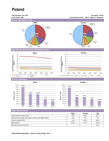 Poland Total population: 38,211,000 Total deaths: 374,000 Income group: High Life expectancy at birth: Total:77 Males:73 Females:81 Cancer Mortality Profile Males Females Trachea, bronchus, lung 16.2% Trachea, bronchus, lung 31.0% Other 37.9% 53,300 No data available Breast 12.7% 42,300 No data available Other 47.3% Deaths Deaths Colorectum 11.8% Colorectum 11.9% Bladder 4.8% Stomach 6.3% Prostate 8.0% Pancreas 5.7% Ovary 6.4% Age-Standardized Cancer Mortality Trends Females 80 age-standardized death rate per 100,000 age-standardized death rate per 100,000 Males 80 70 60 50 40 No data available 30 20 10 0 2000 2002 2004 2006 Trachea, bronchus, lung Colorectum Stomach Bladder 2008 2010 70 60 50 40 No data available 30 20 10 0 2012 2000 Prostate 2002 Trachea, bronchus, lung 2004 Breast 2006 Colorectum 2008 2010 Ovary 2012 Pancreas Cancer Incidence Females Males 20,000 17,905 18,000 18,000 16,000 16,000 14,000 11,072 12,000 11,029 No data available 10,000 8,000 6,113 6,000 3,936 Number of cases Number of cases 20,000 14,000 12,000 No data available 8,366 8,325 10,000 8,000 5,912 6,000 4,000 4,000 2,000 2,000 0 17,259 4,456 0 Lung Colorectum Prostate Bladder Stomach Breast Colorectum Lung Corpus uteri Ovary Adult Risk Factors Males Females Total Current tobacco smoking (2011) 38% 26.8% 32.1% Total alcohol per capita consumption, in litres of pure alcohol (2010) 19.8 5.8 12.5 Physical inactivity (2010) 14.4% 26.0% 20.5% Obesity (2014) 24.8% 29.1% 27.0% - - 0.0% Household solid fuel use (2012) World Health Organization - Cancer Country Profiles, 2014. Cancer Plans, Monitoring and Surveillance Has an operational cancer policy/strategy/action plan Yes Has a cancer registry Scope Yes Population-based and Hospital-based Coverage National Last year of data 2011 Cancer Primary Prevention Policies Tobacco control Has an operational policy, strategy or action plan to reduce the burden of tobacco use Smoke-free legislation Tobacco dependence treatment Warning labels Bans on advertising, promotion and sponsorship Tobacco taxes Yes Up to two public places completely smoke-free NRT and/or some cessation services (at least one of which is cost-covered) Medium size warnings missing some appropriate characteristics OR large warnings missing many appropriate characteristics Ban on national television, radio and print media as well as on some but not all other forms of direct and/or indirect advertising >75% of retail price is tax* Overweight and obesity prevention and control Has an operational policy, strategy or action plan for reducing overweight/obesity Yes Physical inactivity prevention and control Has an operational policy, strategy or action plan to reduce physical inactivity and/or promote physical activity Yes Harmful use of alcohol prevention and control Has an operational policy, strategy or action plan to reduce the harmful use of alcohol Yes National immunization Human Papillomavirus vaccination schedule Hepatitis B vaccination schedule ... Birth, +2 months, +7 months Hepatitis B vaccination coverage, infants 96% Cancer Screening and Early Detection Cervical cancer Cervical cytology (PAP) Generally available at the public primary health care level Acetic acid visualization (VIA) Generally available at the public primary health care level Breast cancer Breast palpation / clinical breast exam (CBE) Generally available at the public primary health care level Mammogram Generally available at the public primary health care level Colorectal cancer Faecal occult blood test or faecal immunological test Generally available at the public primary health care level Bowel cancer screening by exam or colonoscopy Generally available at the public primary health care level Cancer Treatment and Palliative Care Radiotherapy Generally available in the public health system Total high energy teletherapy units / million inhabitants 2.7 Number of radiotherapy centres 31 Number of radiation oncologists 422 Chemotherapy (medicines not specified) Generally available in the public health system Oral morphine (formulation not specified) DK Non-methadone morphine equivalent consumption per cancer death (mg) Community/home care for people with advanced stage cancer and other NCDs * Indicates highest possible level of achievement World Health Organization - Cancer Country Profiles, 2014. 12,036.9 Generally available … = No data available DK = Country responded "don't know"