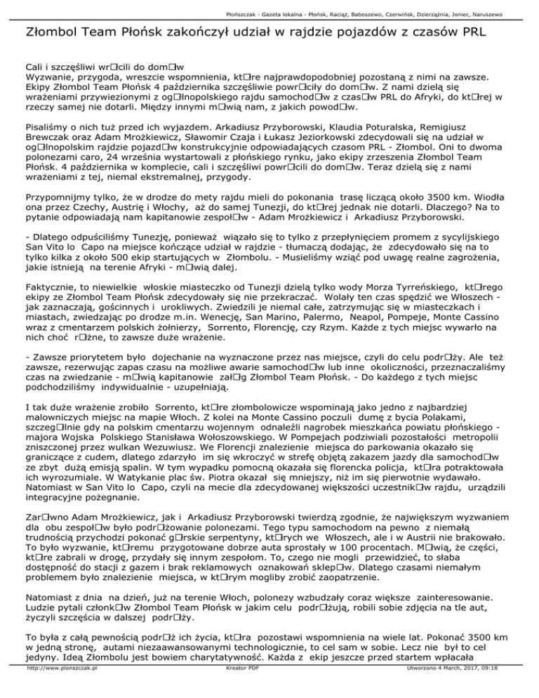 Płońszczak - Gazeta lokalna - Płońsk, Raciąż, Baboszewo, Czerwińsk, Dzierzążnia, Joniec, Naruszewo Złombol Team Płońsk zakończył udział w rajdzie pojazdów z czasów PRL Cali i szczęśliwi wrÃłcili do domÃłw Wyzwanie, przygoda, wreszcie wspomnienia, ktÃłre najprawdopodobniej pozostaną z nimi na zawsze. Ekipy Złombol Team Płońsk 4 października szczęśliwie powrÃłciły do domÃłw. Z nami dzielą się wrażeniami przywiezionymi z ogÃłlnopolskiego rajdu samochodÃłw z czasÃłw PRL do Afryki, do ktÃłrej w rzeczy samej nie dotarli. Między innymi mÃłwią nam, z jakich powodÃłw. Pisaliśmy o nich tuż przed ich wyjazdem. Arkadiusz Przyborowski, Klaudia Poturalska, Remigiusz Brewczak oraz Adam Mrożkiewicz, Sławomir Czaja i Łukasz Jeziorkowski zdecydowali się na udział w ogÃłlnopolskim rajdzie pojazdÃłw konstrukcyjnie odpowiadających czasom PRL - Złombol. Oni to dwoma polonezami caro, 24 września wystartowali z płońskiego rynku, jako ekipy zrzeszenia Złombol Team Płońsk. 4 października w komplecie, cali i szczęśliwi powrÃłcili do domÃłw. Teraz dzielą się z nami wrażeniami z tej, niemal ekstremalnej, przygody. Przypomnijmy tylko, że w drodze do mety rajdu mieli do pokonania trasę liczącą około 3500 km. Wiodła ona przez Czechy, Austrię i Włochy, aż do samej Tunezji, do ktÃłrej jednak nie dotarli. Dlaczego? Na to pytanie odpowiadają nam kapitanowie zespołÃłw - Adam Mrożkiewicz i Arkadiusz Przyborowski. - Dlatego odpuściliśmy Tunezję, ponieważ wiązało się to tylko z przepłynięciem promem z sycylijskiego San Vito lo Capo na miejsce kończące udział w rajdzie - tłumaczą dodając, że zdecydowało się na to tylko kilka z około 500 ekip startujących w Złombolu. - Musieliśmy wziąć pod uwagę realne zagrożenia, jakie istnieją na terenie Afryki - mÃłwią dalej. Faktycznie, to niewielkie włoskie miasteczko od Tunezji dzielą tylko wody Morza Tyrreńskiego, ktÃłrego ekipy ze Złombol Team Płońsk zdecydowały się nie przekraczać. Wolały ten czas spędzić we Włoszech jak zaznaczają, gościnnych i urokliwych. Zwiedzili je niemal całe, zatrzymując się w miasteczkach i miastach, zwiedzając po drodze m.in. Wenecję, San Marino, Palermo, Neapol, Pompeje, Monte Cassino wraz z cmentarzem polskich żołnierzy, Sorrento, Florencję, czy Rzym. Każde z tych miejsc wywarło na nich choć rÃłżne, to zawsze duże wrażenie. - Zawsze priorytetem było dojechanie na wyznaczone przez nas miejsce, czyli do celu podrÃłży. Ale też zawsze, rezerwując zapas czasu na możliwe awarie samochodÃłw lub inne okoliczności, przeznaczaliśmy czas na zwiedzanie - mÃłwią kapitanowie załÃłg Złombol Team Płońsk. - Do każdego z tych miejsc podchodziliśmy indywidualnie - uzupełniają. I tak duże wrażenie zrobiło Sorrento, ktÃłre złombolowicze wspominają jako jedno z najbardziej malowniczych miejsc na mapie Włoch. Z kolei na Monte Cassino poczuli dumę z bycia Polakami, szczegÃłlnie gdy na polskim cmentarzu wojennym odnaleźli nagrobek mieszkańca powiatu płońskiego majora Wojska Polskiego Stanisława Wołoszowskiego. W Pompejach podziwiali pozostałości metropolii zniszczonej przez wulkan Wezuwiusz. We Florencji znalezienie miejsca do parkowania okazało się graniczące z cudem, dlatego zdarzyło im się wkroczyć w strefę objętą zakazem jazdy dla samochodÃłw ze zbyt dużą emisją spalin. W tym wypadku pomocną okazała się florencka policja, ktÃłra potraktowała ich wyrozumiale. W Watykanie plac św. Piotra okazał się mniejszy, niż im się pierwotnie wydawało. Natomiast w San Vito lo Capo, czyli na mecie dla zdecydowanej większości uczestnikÃłw rajdu, urządzili integracyjne pożegnanie. ZarÃłwno Adam Mrożkiewicz, jak i Arkadiusz Przyborowski twierdzą zgodnie, że największym wyzwaniem dla obu zespołÃłw było podrÃłżowanie polonezami. Tego typu samochodom na pewno z niemałą trudnością przychodzi pokonać gÃłrskie serpentyny, ktÃłrych we Włoszech, ale i w Austrii nie brakowało. To było wyzwanie, ktÃłremu przygotowane dobrze auta sprostały w 100 procentach. MÃłwią, że części, ktÃłre zabrali w drogę, przydały się innym zespołom. To, czego nie mogli przewidzieć, to słaba dostępność do stacji z gazem i brak reklamowych oznakowań sklepÃłw. Dlatego czasami niemałym problemem było znalezienie miejsca, w ktÃłrym mogliby zrobić zaopatrzenie. Natomiast z dnia na dzień, już na terenie Włoch, polonezy wzbudzały coraz większe zainteresowanie. Ludzie pytali członkÃłw Złombol Team Płońsk w jakim celu podrÃłżują, robili sobie zdjęcia na tle aut, życzyli szczęścia w dalszej podrÃłży. To była z całą pewnością podrÃłż ich życia, ktÃłra pozostawi wspomnienia na wiele lat. Pokonać 3500 km w jedną stronę, autami niezaawansowanymi technologicznie, to cel sam w sobie. Lecz nie był to cel jedyny. Ideą Złombolu jest bowiem charytatywność. Każda z ekip jeszcze przed startem wpłacała http://www.plonszczak.pl Kreator PDF Utworzono 4 March, 2017, 09:18 Płońszczak - Gazeta lokalna - Płońsk, Raciąż, Baboszewo, Czerwińsk, Dzierzążnia, Joniec, Naruszewo wpisowe w wysokości minimum 1500 zł, z przeznaczeniem na pomoc dla domÃłw dziecka. Przypomnijmy tylko, że tych ekip w dziesiątym rajdzie było około 500, co (gdyby przyjąć, że ekipa każdego biorącego udział w rajdzie wpłaciła tylko 1500 zł) daje niebagatelną kwotę 750 tys. zł. Charytatywną działalnością zajmuje się także Złombol Team Płońsk (niezależnie od rajdu). Jeszcze przed wyjazdem członkowie zrzeszenia wspomogli wychowankÃłw płońskiego Domu Dziecka, przekazując im słodycze, kosmetyki, maskotki, a to zaledwie jedna z akcji charytatywnych teamu i początek jego działalności. Obaj kapitanowie płońskich zespołÃłw mÃłwią, że zamierzają rozszerzyć tę działalność na inne sektory, ponieważ ich głowy są 