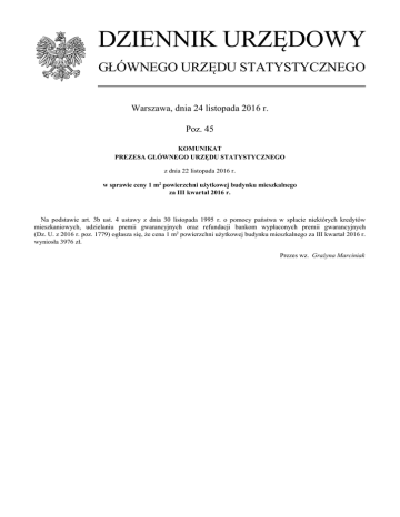 DZIENNIK URZĘDOWY GŁÓWNEGO URZĘDU STATYSTYCZNEGO Warszawa, dnia 24 listopada 2016 r. Poz. 45 KOMUNIKAT PREZESA GŁÓWNEGO URZĘDU STATYSTYCZNEGO z dnia 22 listopada 2016 r. w sprawie ceny 1 m2 powierzchni użytkowej budynku mieszkalnego za III kwartał 2016 r. Na podstawie art. 3b ust. 4 ustawy z dnia 30 listopada 1995 r. o pomocy państwa w spłacie niektórych kredytów mieszkaniowych, udzielaniu premii gwarancyjnych oraz refundacji bankom wypłaconych premii gwarancyjnych (Dz. U. z 2016 r. poz. 1779) ogłasza się, że cena 1 m2 powierzchni użytkowej budynku mieszkalnego za III kwartał 2016 r. wyniosła 3976 zł. Prezes wz. Grażyna Marciniak
