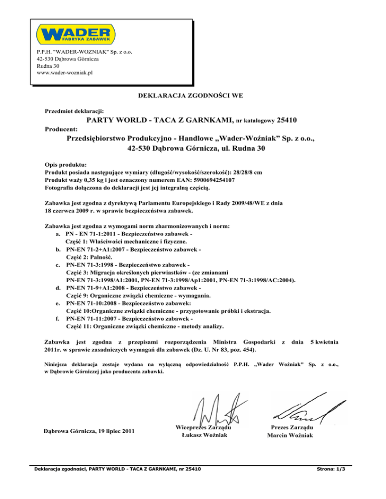 P.P.H. "WADER-WOŹNIAK" Sp. z o.o. 42-530 Dąbrowa Górnicza Rudna 30 www.wader-wozniak.pl DEKLARACJA ZGODNOŚCI WE Przedmiot deklaracji: PARTY WORLD - TACA Z GARNKAMI, nr katalogowy 25410 Producent: Przedsiębiorstwo Produkcyjno - Handlowe „Wader-Woźniak” Sp. z o.o., 42-530 Dąbrowa Górnicza, ul. Rudna 30 Opis produktu: Produkt posiada następujące wymiary (długość/wysokość/szerokość): 28/28/8 cm Produkt waży 0,35 kg i jest oznaczony numerem EAN: 5900694254107 Fotografia dołączona do deklaracji jest jej integralną częścią. Zabawka jest zgodna z dyrektywą Parlamentu Europejskiego i Rady 2009/48/WE z dnia 18 czerwca 2009 r. w sprawie bezpieczeństwa zabawek. Zabawka jest zgodna z wymogami norm zharmonizowanych i norm: a. PN - EN 71-1:2011 - Bezpieczeństwo zabawek Część 1: Właściwości mechaniczne i fizyczne. b. PN-EN 71-2+A1:2007 - Bezpieczeństwo zabawek Część 2: Palność. c. PN-EN 71-3:1998 - Bezpieczeństwo zabawek Część 3: Migracja określonych pierwiastków - (ze zmianami PN-EN 71-3:1998/A1:2001, PN-EN 71-3:1998/Ap1:2001, PN-EN 71-3:1998/AC:2004). d. PN-EN 71-9+A1:2008 - Bezpieczeństwo zabawek Część 9: Organiczne związki chemiczne - wymagania. e. PN-EN 71-10:2008 - Bezpieczeństwo zabawek: Część 10:Organiczne związki chemiczne - przygotowanie próbki i ekstracja. f. PN-EN 71-11:2007 - Bezpieczeństwo zabawek Część 11: Organiczne związki chemiczne - metody analizy. Zabawka jest zgodna z przepisami rozporządzenia Ministra Gospodarki 2011r. w sprawie zasadniczych wymagań dla zabawek (Dz. U. Nr 83, poz. 454). z dnia 5 kwietnia Niniejsza deklaracja zostaje wydana na wyłączną odpowiedzialność P.P.H. „Wader Woźniak" Sp. z o.o., w Dąbrowie Górniczej jako producenta zabawki. Dąbrowa Górnicza, 19 lipiec 2011 Wiceprezes Zarządu Łukasz Woźniak Deklaracja zgodności, PARTY WORLD - TACA Z GARNKAMI, nr 25410 Prezes Zarządu Marcin Woźniak Strona: 1/3 P.P.H. "WADER-WOŹNIAK" Sp. z o.o. 42-530 Dąbrowa Górnicza Rudna 30 www.wader-wozniak.pl DEKLARACJA ZGODNOŚCI WE PARTY WORLD - TACA Z GARNKAMI, nr katalogowy 25410 Deklaracja zgodności, PARTY WORLD - TACA Z GARNKAMI, nr 25410 Strona: 2/3 P.P.H. "WADER-WOŹNIAK" Sp. z o.o. 42-530 Dąbrowa Górnicza Rudna 30 www.wader-wozniak.pl DEKLARACJA ZGODNOŚCI WE PARTY WORLD - TACA Z GARNKAMI, nr katalogowy 25410 Deklaracja zgodności, PARTY WORLD - TACA Z GARNKAMI, nr 25410 Strona: 3/3