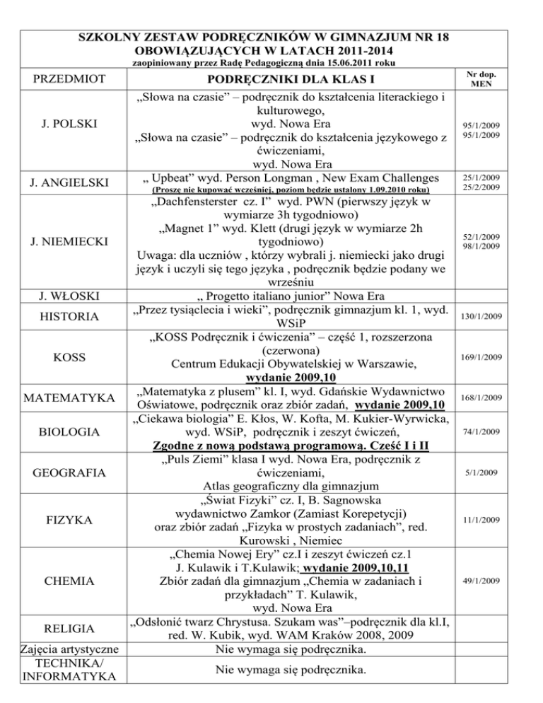 SZKOLNY ZESTAW PODRĘCZNIKÓW W GIMNAZJUM NR 18 OBOWIĄZUJĄCYCH W LATACH 2011-2014 zaopiniowany przez Radę Pedagogiczną dnia 15.06.2011 roku PRZEDMIOT J. POLSKI J. ANGIELSKI PODRĘCZNIKI DLA KLAS I „Słowa na czasie” – podręcznik do kształcenia literackiego i kulturowego, wyd. Nowa Era „Słowa na czasie” – podręcznik do kształcenia językowego z ćwiczeniami, wyd. Nowa Era „ Upbeat” wyd. Person Longman , New Exam Challenges (Proszę nie kupować wcześniej, poziom będzie ustalony 1.09.2010 roku) „Dachfensterster cz. I” wyd. PWN (pierwszy język w wymiarze 3h tygodniowo) „Magnet 1” wyd. Klett (drugi język w wymiarze 2h J. NIEMIECKI tygodniowo) Uwaga: dla uczniów , którzy wybrali j. niemiecki jako drugi język i uczyli się tego języka , podręcznik będzie podany we wrześniu J. WŁOSKI „ Progetto italiano junior” Nowa Era „Przez tysiąclecia i wieki”, podręcznik gimnazjum kl. 1, wyd. HISTORIA WSiP „KOSS Podręcznik i ćwiczenia” – część 1, rozszerzona (czerwona) KOSS Centrum Edukacji Obywatelskiej w Warszawie, wydanie 2009,10 „Matematyka z plusem” kl. I, wyd. Gdańskie Wydawnictwo MATEMATYKA Oświatowe, podręcznik oraz zbiór zadań, wydanie 2009,10 „Ciekawa biologia” E. Kłos, W. Kofta, M. Kukier-Wyrwicka, BIOLOGIA wyd. WSiP, podręcznik i zeszyt ćwiczeń, Zgodne z nową podstawą programową. Cześć I i II „Puls Ziemi” klasa I wyd. Nowa Era, podręcznik z GEOGRAFIA ćwiczeniami, Atlas geograficzny dla gimnazjum „Świat Fizyki” cz. I, B. Sagnowska wydawnictwo Zamkor (Zamiast Korepetycji) FIZYKA oraz zbiór zadań „Fizyka w prostych zadaniach”, red. Kurowski , Niemiec „Chemia Nowej Ery” cz.I i zeszyt ćwiczeń cz.1 J. Kulawik i T.Kulawik; wydanie 2009,10,11 CHEMIA Zbiór zadań dla gimnazjum „Chemia w zadaniach i przykładach” T. Kulawik, wyd. Nowa Era „Odsłonić twarz Chrystusa. Szukam was”–podręcznik dla kl.I, RELIGIA red. W. Kubik, wyd. WAM Kraków 2008, 2009 Zajęcia artystyczne Nie wymaga się podręcznika. TECHNIKA/ Nie wymaga się podręcznika. INFORMATYKA Nr dop. MEN 95/1/2009 95/1/2009 25/1/2009 25/2/2009 52/1/2009 98/1/2009 130/1/2009 169/1/2009 168/1/2009 74/1/2009 5/1/2009 11/1/2009 49/1/2009 SZKOLNY ZESTAW PODRĘCZNIKÓW W GIMNAZJUM NR 18 OBOWIĄZUJĄCYCH W LATACH 2010-2013 zaopiniowany przez Radę Pedagogiczną dnia 15.06.2011 roku PRZEDMIOT J. POLSKI J. ANGIELSKI J. NIEMIECKI J. WŁOSKI HISTORIA KOSS MATEMATYKA BIOLOGIA GEOGRAFIA FIZYKA CHEMIA RELIGIA MUZYKA PLASTYKA TECHNIKA/ INFORMATYKA PODRĘCZNIKI DLA KLAS II „Słowa na czasie” – podręcznik do kształcenia literackiego i kulturowego, wyd. Nowa Era „Słowa na czasie” – podręcznik do kształcenia językowego z ćwiczeniami, wyd. Nowa Era Kontynuacja kursów z kl. I –książki zostaną zakupione we wrześniu. „Dachfensterster cz. II” wyd. PWN (pierwszy język w wymiarze 3h tygodniowo) „Magnet 2” wyd. Klett (drugi język w wymiarze 2h tygodniowo) „Espresso 2” wyd. Alma Edizioni „Przez tysiąclecia i wieki”, podręcznik gimnazjum kl. 2, wyd. WSiP „Podręcznik KOSS – wersja rozszerzona cz.1” - Centrum Edukacji Obywatelskiej w Warszawie, tylko wydania 2009 i późniejszekontynuacja z klasy pierwszej ( wersja roszerzona czerwona) „Matematyka z plusem” kl. II, wyd. Gdańskie Wydawnictwo Oświatowe, podręcznik oraz zbiór zadań, wydanie 2009 „Ciekawa biologia” E. Kłos, W. Kofta, M. Kukier-Wyrwicka, wyd. WSiP, podręcznik i zeszyt ćwiczeń, część II zgodne z nową podstawą programową „Puls Ziemi” klasa II wyd. Nowa Era, podręcznik z ćwiczeniami, Atlas geograficzny dla gimnazjum „Świat Fizyki” cz. II, B. Sagnowska wydawnictwo Zamkor (Zamiast Korepetycji) oraz zbiór zadań „Fizyka w prostych zadaniach”, red. Kurowski, Niemiec „Chemia Nowej Ery” cz.I i II i zeszyt ćwiczeń, cz.2 J. Kulawik, wydanie 2010,11 Zbiór zadań dla gimnazjum „Chemia w zadaniach i przykładach” T. Kulawik, wyd. Nowa Era „Odsłonić twarz Chrystusa. Jestem z wami” – podręcznik dla kl. II, red. W. Kubik, wyd. WAM Kraków 2008 oraz późniejsze „Gra muzyka”, J. Oleszkowicz, wyd. Nowa Era 2010 – podręcznik i zeszyt ćwiczeń, kl. II 1. Kraina Sztuki- Lidia Frydzińska, Beata Marcinkowska wyd. PWN, kl. II i III 2. Zeszyt ćwiczeń do plastyki dla gimnazjum, wyd. PWN Nie planuje się podręcznika. SZKOLNY ZESTAW PODRĘCZNIKÓW W GIMNAZJUM NR 18 OBOWIĄZUJĄCYCH W LATACH 2009-2012 zaopiniowany przez Radę Pedagogiczną dnia 15.06.2011 roku PRZEDMIOT J. POLSKI J. ANGIELSKI J. NIEMIECKI HISTORIA KOSS MATEMATYKA BIOLOGIA GEOGRAFIA FIZYKA CHEMIA RELIGIA PODRĘCZNIKI DLA KLAS III „ Słowa na czasie” – podręcznik do kształcenia literatury i kulturoznawstwa Nowa Era „ Słowa na czasie” – podręcznik do kształcenia językowego Nowa Era Kontynuacja kursu podręczniki Upbeat, New Adventures Repetytorium zostaną zakupione we wrześniu. „Dachfenster cz. III”, wyd. PWN ( pierwszy język w wymiarze 3h tygodniowo) „ Przez tysiąclecia i wieki” – podręcznik dla gimnazjum kl. III, WSiP „Podręcznik KOSS – wersja rozszerzona cz.2” - Centrum Edukacji Obywatelskiej w Warszawie, tylko wydania 2009 i późniejsze „Matematyka z plusem” kl. III, wyd. Gdańskie Wydawnictwo Oświatowe, podręcznik oraz zbiór zadań, wydanie 2009 „Ciekawa biologia” E. Kłos, W. Kofta, M. Kukier-Wyrwicka, wyd. WSiP, podręcznik i zeszyt ćwiczeń, część III zgodne z nową podstawą programową „Puls Ziemi” klasa III wyd. Nowa Era, podręcznik z ćwiczeniami, Atlas geograficzny dla gimnazjum „ Świat fizyki” cz. III B. Saganowska, Zam Kor, Zbiór zadań „ Fizyka w prostych zadaniach” red. Kurowski, Niemiec „Chemia Nowej Ery” cz.III i zeszyt ćwiczeń cz.III J. Kulawik i T.Kulawik; wydanie 2011 Zbiór zadań dla gimnazjum „Chemia w zadaniach i przykładach” T. Kulawik, wyd. Nowa Era „Odsłonić twarz Chrystusa. Chodzmy razem klasa III”, wyd. WAM, Kraków 2008 