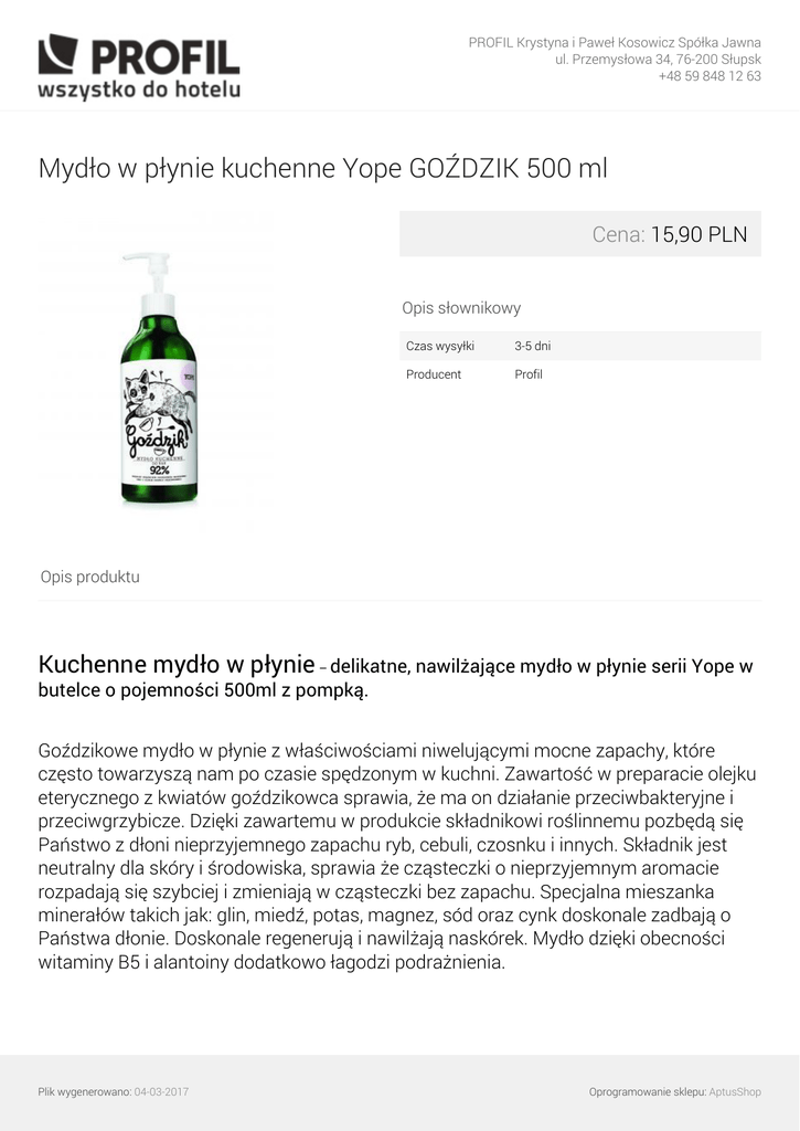 PROFIL Krystyna i Paweł Kosowicz Spółka Jawna ul. Przemysłowa 34, 76-200 Słupsk +48 59 848 12 63 Mydło w płynie kuchenne Yope GOŹDZIK 500 ml Cena: 15,90 PLN Opis słownikowy Czas wysyłki 3-5 dni Producent Profil Opis produktu Kuchenne mydło w płynie – delikatne, nawilżające mydło w płynie serii Yope w butelce o pojemności 500ml z pompką. Goździkowe mydło w płynie z właściwościami niwelującymi mocne zapachy, które często towarzyszą nam po czasie spędzonym w kuchni. Zawartość w preparacie olejku eterycznego z kwiatów goździkowca sprawia, że ma on działanie przeciwbakteryjne i przeciwgrzybicze. Dzięki zawartemu w produkcie składnikowi roślinnemu pozbędą się Państwo z dłoni nieprzyjemnego zapachu ryb, cebuli, czosnku i innych. Składnik jest neutralny dla skóry i środowiska, sprawia że cząsteczki o nieprzyjemnym aromacie rozpadają się szybciej i zmieniają w cząsteczki bez zapachu. Specjalna mieszanka minerałów takich jak: glin, miedź, potas, magnez, sód oraz cynk doskonale zadbają o Państwa dłonie. Doskonale regenerują i nawilżają naskórek. Mydło dzięki obecności witaminy B5 i alantoiny dodatkowo łagodzi podrażnienia. Plik wygenerowano: 04-03-2017 Oprogramowanie sklepu: AptusShop PROFIL Krystyna i Paweł Kosowicz Spółka Jawna ul. Przemysłowa 34, 76-200 Słupsk +48 59 848 12 63 Mydło kuchenne nie zawiera parabenów, silikonów, barwników, SLES'u i SLS'u. Zawiera 92% składników pochodzenia naturalnego oraz o niskim stopniu przetworzenia. Produkt polski. Produkt sprzedawany jest pojedynczo lub w opakowaniu zbiorczym 8 sztuk. Galeria Plik wygenerowano: 04-03-2017 Powered by TCPDF (www.tcpdf.org) Oprogramowanie sklepu: AptusShop