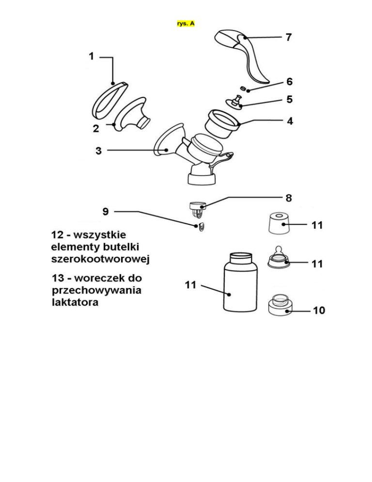 rys. A rys. B PL Laktator ręczny EasyStart. Więcej informacji w środku. Zachowaj instrukcję ponieważ zawiera ważne informacje. Numer serii i data ważności na opakowaniu. Laktator ręczny służy do odciągania nadmiaru pokarmu. Nie jest przeznaczony do odciągania pokarmu, gdy głodne dziecko nie jest w stanie samodzielnie opróżnić piersi tj. we wszystkich przypadkach, gdy występuje blokada przewodów mlecznych. Wstęp Lekarze zalecają mleko matki jako najlepszy pokarm dla dziecka przez pierwszy rok życia, łączony z pokarmem stałym od 4-6 miesiąca. Pamiętaj, że Twoje mleko jest pokarmem w pełni odpowiadającym potrzebom Twojego dziecka, a obecne w nim przeciwciała zabezpieczają je przed infekcjami i alergiami. Laktator usuwa pokarm z piersi z użyciem siły ssącej wytwarzanej ręcznie. Pozwala na symulację naturalnego procesu ssania przez dziecko. Kiedy należy używać laktatora? Jeżeli to możliwe zaczekaj do momentu, kiedy laktacja ureguluje się, co zwykle następuje w okresie 2-4 tygodni po porodzie. Wyjątki od powyższej zasady: Kiedy Twoje piersi produkują zbyt dużo mleka, stają się obrzmiałe i twarde. Ściągnięcie nadmiaru mleka przed lub w trakcie karmienia sprawi Ci ulgę i ułatwi Twojemu dziecku uchwycenie piersi. Po karmieniu, gdy jeszcze masz pokarm w piersi, ściągnięcie go zapobiega bolesnym zastojom. Jeżeli między karmieniami czujesz przepełnienie piersi i nie chcesz budzić dziecka. Jeżeli Twoje piersi produkują zbyt mało mleka, używając laktator symulujesz karmienie, co prowadzi do zwiększenia laktacji. Kiedy pracujesz lub przebywasz poza domem i pragniesz kontynuować karmienie piersią, powinnaś regularnie ściągać pokarm laktatorem, by podtrzymać naturalny proces laktacji. INSTRUKCJA OBSŁUGI Elementy laktatora (rys. A) A1 - pokrywa na lejek A2 - silikonowa wkładka masująca A3 - korpus laktatora wraz z lejkiem A4 - silikonowa membrana A5 - element łączący silikonową membranę z rączką A6 - silikonowy pierścień amortyzujący (3 szt.) A7 - rączka laktatora A8 - głowica zaworu antyzwrotnego A9 - silikonowa uszczelka zaworu antyzwrotnego (3 szt.) A10 - adaptor do butelek szerokootworowych Dodatkowe wyposażenie: A11 - butelka z wąskim otworem 120 ml (trytan) + smoczek silikonowy + nakrętka + kapsel + dysk A12 - butelka szerokootworowa 150 ml (trytan) + smoczek silikonowy + nakrętka + kapsel + dysk A13 - woreczek do przechowywania laktatora Montaż laktatora (rys. B) B1 - Nałóż silikonowy pierścień amortyzujący (rys. A6) na element łączący silikonową membranę z rączką. Następnie połącz silikonową membranę (rys. A4) z elementem łączącym ją z rączką (rys. A5). B2 - Zamocuj silikonową membranę (rys. A4) w korpusie laktatora (rys. A3). Upewnij się, że brzegi membrany są szczelnie przymocowane do brzegu korpusu. B3 - Wsuń górną część rączki na element łączący ją z membraną (rys. A5). B4 - Naciśnij na rączkę tak aby silikonowa membrana schowała się wewnątrz korpusu. B5 - Przymocuj dolną część rączki do korpusu. B6 - Naciśnij na rączkę kilkakrotnie aby sprawdzić czy została zamontowana prawidłowo. B7 - Nałóż silikonową wkładkę masującą (rys. A2)na lejek korpusu. Zwróć uwagę na to, że obie części są wyprofilowane i powinny być odpowiednio dopasowane. B8 - Załóż pokrywkę na lejek (rys. A1). Pokrywka służy do ochrony lejka przed zakurzeniem. Zawsze zdejmij osłonkę przed użyciem laktatora. B9 - Zapnij silikonową uszczelkę (rys. A9) na głowicę zaworu antyzwrotnego (rys. A8). B10 - Połącz głowicę zaworu antyzwrotnego (rys. A8) z korpusem laktatora. B11- Po przykręceniu butelki laktator jest gotowy do użycia. Sposób użycia laktatora Upewnij się, że laktator został wcześniej umyty i wysterylizowany. Umyj dokładnie ręce oraz pierś. Aby sprawdzić, czy kanały mleczne są drożne, ściągnij trochę pokarmu, uciskając delikatnie brodawkę. Przyłóż laktator do piersi, tak by silikonowa wkładka masująca przylegała dokładnie, uniemożliwiając tym samym przepływ powietrza. Jeśli powstanie nieszczelność, skuteczność odciągania pokarmu może ulec znacznemu pogorszeniu. Zawsze trzymaj butelkę w pozycji pionowej, tak aby pokarm mógł swobodnie spływać na dno. Odciągaj pokarm z piersi do momentu, gdy poczujesz, że płynie on znacznie wolniej. Przystaw laktator do drugiej piersi, aby kontynuować. Po zakończeniu odciągania pokarmu odkręć korpus laktatora od butelki, zamiast niego przymocuj smoczek z nakrętką. Pokarm jest gotowy do podania dziecku. Jak myć i dezynfekować laktator? a) Elementy laktatora (części od A1 do A10) Przed pierwszym i każdym kolejnym użyciem rozłóż laktator na części. Wszystkie części laktatora (od A1 do A10) umyj w ciepłej wodzie z mydłem dla dzieci, następnie dokładnie wypłucz i wydezynfekuj w sterylizatorze parowym lub przez zanurzenie we wrzącej wodzie (nie dłużej niż przez 5 minut). b) Elementy butelki (części od A11 do A12) Przed pierwszym użyciem rozmontowane części butelki wraz ze smoczkiem wyczyść i umieścić na 5 minut we wrzącej wodzie. Ma to na celu zapewnienie higieny. Gotowanie dłuższe od zalecanego oraz twarda woda może powodować powstawanie osadu. Przed każdym użyciem wyczyść butelkę i smoczek, wypłucz gorącą wodą. Nie gotuj. Nie zaleca się mycia butelki i smoczka w zmywarce, gdyż detergenty/środki czyszczące mogą spowodować uszkodzenie produktu. Nie używaj żadnych środków dezynfekujących. Przed każdym użyciem dokładnie sprawdź smoczek, zwłaszcza, gdy dziecko ma zęby. Rozciągnij smoczek we wszystkich kierunkach. Wyrzucić przy pierwszych oznakach uszkodzenia lub osłabienia. Nie dokręcaj nakrętki ze smoczkiem zbyt mocno, ponieważ smoczek może nie odpowietrzać się właściwie. Sprawdź czy pokarm nie przecieka spod nakrętki. Nie dziurkuj i nie powiększaj otworów smoczka, może to spowodować jego zni