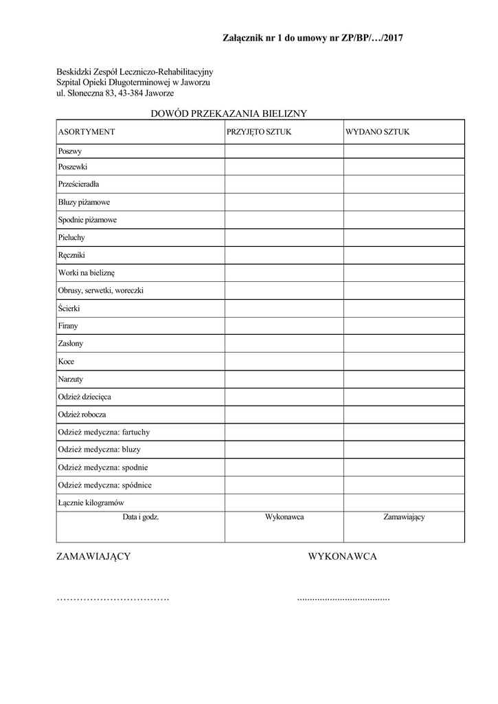 Załącznik nr 1 do umowy nr ZP/BP/…/2017 Beskidzki Zespół Leczniczo-Rehabilitacyjny Szpital Opieki Długoterminowej w Jaworzu ul. Słoneczna 83, 43-384 Jaworze DOWÓD PRZEKAZANIA BIELIZNY PRZYJĘTO SZTUK ASORTYMENT WYDANO SZTUK Poszwy Poszewki Prześcieradła Bluzy piżamowe Spodnie piżamowe Pieluchy Ręczniki Worki na bieliznę Obrusy, serwetki, woreczki Ścierki Firany Zasłony Koce Narzuty Odzież dziecięca Odzież robocza Odzież medyczna: fartuchy Odzież medyczna: bluzy Odzież medyczna: spodnie Odzież medyczna: spódnice Łącznie kilogramów Data i godz. ZAMAWIAJĄCY ……………………………. Zamawiający Wykonawca WYKONAWCA .....................................