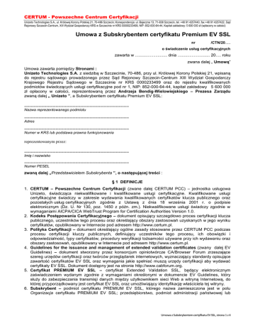 CERTUM - Powszechne Centrum Certyfikacji Unizeto Technologies S.A., ul. Królowej Korony Polskiej 21, 70-486 Szczecin; Korespondencja: ul. Bajeczna 13, 71-838 Szczecin, tel. +48 91 4257440, fax +48 91 4257422, Sąd Rejonowy Szczecin-Centrum, XIII Wydział Gospodarczy KRS w Szczecinie nr KRS 00000233499, NIP: 852-000-64-44, Kapitał zakładowy: 5 600 000 zł (wpłacony w całości) Umowa z Subskrybentem certyfikatu Premium EV SSL nr /CTN/20..... o świadczenie usług certyfikacyjnych zawarta w .............................. dnia .............................. 20..... roku zwana dalej „ Umową” Umowa zawarta pomiędzy Stronami : Unizeto Technologies S.A. z siedzibą w Szczecinie, 70-486, przy ul. Królowej Korony Polskiej 21, wpisaną do rejestru sądowego prowadzonego przez Sąd Rejonowy Szczecin-Centrum XIII Wydział Gospodarczy Krajowego Rejestru Sądowego w Szczecinie nr KRS 0000233499 oraz do rejestru kwalifikowanych podmiotów świadczących usługi certyfikacyjne pod nr 1, NIP: 852-000-64-44, kapitał zakładowy 5 600 000 zł opłacony w całości, reprezentowaną przez Andrzeja Bendig-Wielowiejskiego – Prezesa Zarządu zwaną dalej „ Unizeto ”, a Subskrybentem certyfikatu Premium EV SSL: ................................................................................ Nazwa reprezentowanego podmiotu ................................................................................ Adres ................................................................................ Numer w KRS lub podstawa prawna funkcjonowania reprezentowanym przez: ................................................................................ Imię i nazwisko ................................................................................ Numer PESEL zwaną dalej „Przedstawicielem Subskrybenta ”, o następującej treści : § 1 DEFINICJE 1. CERTUM – Powszechne Centrum Certyfikacji (zwane dalej CERTUM PCC) – jednostka usługowa Unizeto, świadcząca niekwalifikowane i kwalifikowane usługi certyfikacyjne. Kwalifikowane usługi certyfikacyjne świadczy w zakresie wydawania kwalifikowanych certyfikatów klucza publicznego oraz pozostałych usług certyfikacyjnych zgodnie z Ustawą z dnia 18 września 2001 r. o podpisie elektronicznym (Dz. U. Nr 130, poz. 1450 z późn. zm.). Niekwalifikowane usługi świadczy zgodnie w wymaganiami AICPA/CICA WebTrust Program for Certification Authorities Version 1.0. 2. Kodeks Postępowania Certyfikacyjnego – dokument opisujący szczegółowo proces certyfikacji klucza publicznego, uczestników tego procesu oraz określający obszary zastosowań uzyskanych w jego wyniku certyfikatów, opublikowany w Internecie pod adresem http://www.certum.pl. 3. Polityka Certyfikacji – dokument określający ogólne zasady stosowane przez CERTUM PCC podczas procesu certyfikacji kluczy publicznych, definiujący uczestników tego procesu, ich obowiązki i odpowiedzialność, typy certyfikatów, procedury weryfikacji tożsamości używane przy ich wydawaniu oraz obszary zastosowań, opublikowany w Internecie pod adresem http://www.certum.pl. 4. Guidelines for the issuance and management of extended validation certificates (zwany dalej EV Guidelines) – dokument stworzony przez konsorcjum opiniotwórcze CA/Browser Forum zrzeszające szereg urzędów certyfikacji oraz twórców przeglądarek internetowych, wyznaczający standardy opisujące zawartość certyfikatów EV SSL oraz wymagania jakie spełniać muszą urzędy certyfikacji aby wydawać certyfikaty EV SSL. Dokument dostępny jest na stronie http://www.cabforum.org. 5. Certyfikat PREMIUM EV SSL – certyfikat Extended Validation SSL, będący elektronicznym zaświadczeniem wydanym zgodnie z wymaganiami określonymi w dokumencie EV Guidelines, który służy do zabezpieczania transmisji danych między użytkownikiem sieci Web a witryną Internetową, do której przyporządkowany jest certyfikat EV SSL oraz umożliwiający identyfikację właściciela tej witryny. 6. Subskrybent – podmiot certyfikatu PREMIUM EV SSL, którego nazwa zamieszczona jest w polu Organizacja certyfikatu PREMIUM EV SSL; przedsiębiorstwo, podmiot administracji państwowej lub Umowa z Subskrybentem certyfikatu EV SSL, strona 1 z 4 CERTUM - Powszechne Centrum Certyfikacji Unizeto Technologies S.A., ul. Królowej Korony Polskiej 21, 70-486 Szczecin; Korespondencja: ul. Bajeczna 13, 71-838 Szczecin, tel. +48 91 4257440, fax +48 91 4257422, Sąd Rejonowy Szczecin-Centrum, XIII Wydział Gospodarczy KRS w Szczecinie nr KRS 00000233499, NIP: 852-000-64-44, Kapitał zakładowy: 5 600 000 zł (wpłacony w całości) organizacja, która jest właścicielem bądź wyłącznym użytkownikiem nazwy domeny będącej przedmiotem certyfikatu PREMIUM EV SSL. 7. Przedstawiciel Subskrybenta – osoba fizyczna reprezentująca Subskrybenta; pracownik zatrudniony przez Subskrybenta lub autoryzowany przedstawiciel Subskrybenta posiadający wyraźne pełnomocnictwo do działania w imieniu Subskrybenta, w tym upoważnienie do podpisywania w jego imieniu Umowy z Subskrybentem. 8. Wniosek o wydanie cetyfikatu PREMIUM EV SSL – wniosek będący załącznikiem do Umowy z Subskrybentem certyfikatu PREMIUM EV SSL zawierający m.in. dane będące treścią certyfikatu PREMIUM EV SSL. § 2 PRZEDMIOT UMOWY 1. Przedmiotem umowy jest wydanie certyfikatu/ów PREMIUM EV SSL oraz świadczenie usług certyfikacyjnych związanych z obsługą certyfikatu/ów PREMIUM EV SSL. 2. Umowa zostaje zawarta na czas określony, od dnia jej zawarcia do czasu ustania ważności certyfikatu/ów wydanych na jej podstawie. § 3 ZOBOWIĄZANIA UNIZETO W ramach niniejszej umowy Unizeto zobowiązuje się do: 1. wydania certyfikatów zgodnie z danymi określonymi we wniosku o wydanie certyfikatu PREMIUM EV SSL oraz wymaganiami określonymi w EV Guidelines, dostępnymi na stronie http://www.cabforum.org, w terminie nie przekraczającym 14 dni od daty podpisania niniejszej umowy, lecz nie wcześniej niż po prze