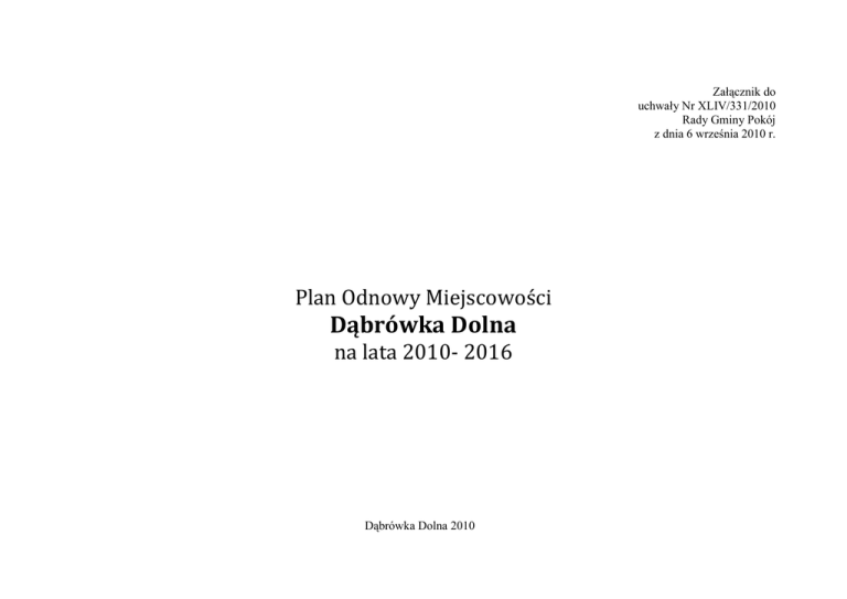 Załącznik do uchwały Nr XLIV/331/2010 Rady Gminy Pokój z dnia 6 września 2010 r. Plan Odnowy Miejscowości Dąbrówka Dolna na lata 2010- 2016 Dąbrówka Dolna 2010 Spis Treści Wprowadzenie 3 Charakterystyka Inwentaryzacja zasobów Ocena mocnych i słabych stron miejscowości Cel planowanych działań Opis planowanych zadań inwestycyjnych i przedsięwzięć aktywizujących społeczność lokalną w okresie 2009 – 2016 4 5 7 8 9 Podsumowanie 16 Wprowadzenie Plan Odnowy Miejscowości DĄBRÓWKA DOLNA na lata 2010 - 2016 jest dokumentem operacyjnym określającym cele, priorytety i zasady wspierania zrównoważonego rozwoju obszarów wiejskich. Plan jest ukierunkowany na aspekty społeczne, ekonomiczne i środowiskowe. Dokument ten jest spójny z Programem Rozwoju Obszarów Wiejskich na lata 2007-2013. Przyjęty przez Zebranie Wiejskie Mieszkańców Sołectwa i Radę Gminy Pokój niniejszy plan, wykazuje zgodność wszystkich inwestycji planowanych do realizacji z celami programowymi Osi III Programu Rozwoju Obszarów Wiejskich 2007-2013. Plan Odnowy Miejscowości powinien być aktualizowany i modyfikowany w miarę zaspokajania potrzeb mieszkańców sołectwa, zmieniających się warunków lokalnych i regionalnych, pojawiania się nowych wyzwań cywilizacyjnych w Unii Europejskiej oddziaływujących na sytuację ogólnokrajową, uwarunkowania regionalne i lokalne. Bieżąca aktualizacja umożliwi, między innymi wyznaczenie prawidłowych kierunków rozwoju lokalnego, powiązanych z zaangażowaniem miejscowych środowisk opiniotwórczych i środowisk zamiejscowych w planowaniu strategicznym, ułatwi ocenę stopnia przygotowania, a następnie ocenę ewentualnie występujących przeszkód w realizacji przyjętych zadań, a także określenie efektów osiągniętych z wykonywanych zadań. Plan Odnowy Miejscowości ma być narzędziem służącym programowaniu kompleksowego i długofalowego rozwoju społeczno – gospodarczego wsi , dlatego do udziału w jego tworzeniu zaproszono wszystkich jej mieszkańców. Proces konsultacji społecznych prowadzony był poprzez: 1. zgłaszanie wniosków przez Sołtysa wsi i członków Rady Sołeckiej , 2. bezpośrednie spotkania z mieszkańcami sołectwa i jego reprezentantami, 3. spotkania z przedstawicielami organizacji pozarządowych działających na terenie sołectwa, 4. zgłaszanie wniosków i opinii przez mieszkańców sołectwa za pośrednictwem poczty elektronicznej na adres [email protected] Charakterystyka miejscowości We wsi Dąbrówka Dolna powstało gospodarstwo agroturystyczne „Buffalo Ranch”, które organizuje imprezy o charakterze ponadlokalnym, skierowane głównie do hodowców koni, wędkarzy, amatorów jazdy konnej i wypoczynku na wsi, a takŜe dla pasjonatów kultury indiańskiej i amerykańskiej. W bliskim sąsiedztwie gospodarstwa agroturystycznego znajdują się trzy gospodarstwa rybackie: oferujące swe usługi w okresie letnim , skupiające się głównie wokół wypoczynku nad wodą( łowienie ryb, grill). Jedno z nich oprócz oferowania ww. usług udostępnia zbiornik wodny do kąpieli. Rys. nr 1.PołoŜenie Lokalizacja Nazwa: Dąbrówka Dolna - wieś Województwo: opolskie Powiat: namysłowski Gmina: Pokój Rys historyczny Nazwa NIEMIECKA: Königlich Dombrowka, 1931-1932; Dombrowka b. Carlsruhe O. S., Eichendorf od 1932 Dawna gmina wiejska istniejąca w latach 1945-1954 w woj. śląskim i woj. opolskim. Siedzibą władz gminy była Dąbrówka Dolna. Gmina zbiorowa Dąbrówka Dolna powstała po II wojnie światowej (w grudniu 1945[3]) w powiecie opolskim na terenie tzw. Ziem Odzyskanych (tzw. I okręg administracyjny – Śląsk Opolski, powierzonym 18 marca 1945 administracji wojewody śląskiego, a z dniem 28 czerwca 1946 przyłączonym do woj. śląskiego (śląsko-dąbrowskiego). Według stanu z 1 stycznia 1946 gmina składała się z 9 gromad: Dąbrówka Dolna, Blimkinów, Domaradzka Kuźnia, Grabice, Kopalina, Lubnów, Święcina, Syseród i Zawiść oraz części Lasów Państwowych (Nadleśnictwo Opole Północ) 6 lipca 1950 zmieniono nazwę woj. śląskiego na katowickie; równocześnie gmina Dąbrówka Dolna wraz z całym powiatem opolskim weszła w skład nowo utworzonego woj. Opolskiego. 1 lipca 1952 gmina składała się z 9 gromad: Dąbrówka Dolna, Domaradzka Kuźnia, Grabice, Kopalina, Lubnów, Młodnik, Radomierowice, Święciny i Zawiść. Gmina została zniesiona 29 września 1954 wraz z reformą wprowadzającą gromady w miejsce gmin. Jednostki nie przywrócono 1 stycznia 1973 wraz z kolejną reformą reaktywującą gminy Układ przestrzenny Dąbrówka Dolna nie posiada ukształtowanego i zachowanego układu urbanistycznego. Zabudowa rozwinęła się, bez wykształconego centrum. W znacznej części uległa ona przekształceniu i posiada jedynie pojedyncze elementy kulturowe wymagające ochrony konserwatorskiej, - Kościół Parafialny VI. Inwentaryzacja zasobów Liczba mieszkańców Dąbrówki Dolnej 228 osób ( dane na dzień 31.12.2008 r.). Lp. Miejscowość Liczba mieszkańców 1. 2. 3. 4. 5. 6. 7. 8. 9. 10. 11. 12. 13. 14. 15. 16. 17. 18. Dąbrówka Dolna Domaradz Domaradzka Kuźnia Fałkowice Jagienna Kopalina Kozuby Krogulna Krzywa Góra Lubnów Ładza ParyŜ Pokój Siedlice Świercowskie Zawiść Zieleniec śabiniec RAZEM: 228 303 218 322 174 190 191 279 102 287 410 80 1437 56 65 279 623 86 5330 Dane: Ewidencja Ludności Urzędu Gminy Pokój b) Komunikacja drogowa drogi powiatowe 1353 Dąbrówka Dolna - Grabice drogi gminne 45005 Dąbrówka Dolna - Zieleniec d). środowisko naturalne Miejscowość połoŜona jest na terenie Stobrawskiego Parku Krajobrazowego. VII. Ocena mocnych i słabych stron Dąbrówki dolnej Mocne strony miejscowości 1) Atrakcyjne środowisko naturalne oraz walory, przyrodniczo – krajobrazowe łąki, lasy, woda, 2) Aktywna społeczność lokalna, 3) Zwodociągowana wieś, 4) Dostęp do szerokopasmowego Internetu, 6) OHP Słabe strony 1)Niska świadomość mieszkańc
