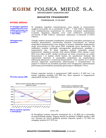 DEPARTAMENT ZABEZPIECZEŃ BIULETYN TYGODNIOWY PONIEDZIAŁEK, 27.08.2007 RYNEK MIEDZI W ubiegłym tygodniu trzymiesięczna cena miedzi poruszała się w przedziale 6 957 – 7 420 USD/t. W ubiegłym tygodniu trzymiesięczna cena miedzi w notowaniach ciągłych poruszała się w przedziale 6 957 – 7 420 USD/t. Minimalną cenę trzymiesięczną zanotowano we wtorek, natomiast maksymalną w piątek. Najniższą oficjalną cenę cash settlement zanotowano we wtorek (7 060 USD/t), natomiast najwyższą w czwartek (7 379,5 USD/t). Odreagowanie spadków. Ubiegły tydzień przyniósł uspokojenie nerwowej atmosfery panującej na rynkach finansowych. Interwencje Banków Centralnych na niemal wszystkich kontynentach oraz impuls w postaci obniżenia dyskontowej stopy procentowej w USA przez FED uspokoiły nieco inwestorów. Na większości rynków wystąpiło odreagowanie gwałtownych spadków z poprzednich dni. W skali tygodnia zyskały wszystkie metale podstawowe. Najwięcej wzrosły ceny ołowiu (blisko 13%), miedzi i cyny (5%) oraz niklu (4,2)%. Nadal utrzymuje się duża nerwowość na rynku finansowym i w każdej chwili można się spodziewać kolejnej fali wyprzedaży aktywów w przypadku pojawienia się negatywnych informacji płynących z instytucji finansowych. Ceny miedzi są w chwili obecnej wspierane pozytywnymi informacjami o utrzymywaniu się popytu w Chinach na wysokim poziomie oraz trwającymi i planowanymi protestami pracowników przemysły górniczego w Meksyku i Peru. Poziom zapasów metalu w magazynach LME wzrósł o 5 000 ton i na koniec tygodnia wyniósł 125 550 ton. Stan zapasów w magazynach azjatyckich wzrósł o 2 850 ton. Wzrosły zapasy LME. Zmiana poziomu zapasów LM E w poszcze gólnych re gionach świata Zapasy mie dzi w magazynach LM E w poszcze gólnych czę ściach świata 80000 70000 Europa 18,2% AZJA Azja 58,1% 60000 USA 50000 EUROPA 40000 30000 20000 USA 23,7% Mocny spadek zapasów w Szanghaju. e e si si 17 24 e e si 10 li p si 3 27 li p li p 20 l ip 6 13 e 29 cz e e cz cz 15 22 e e cz 8 aj cz 1 aj m m m aj 18 25 4 11 m aj 10000 Źródło: LME W Szanghaju poziom zapasów zmniejszył się o 16 569 ton w stosunku do poprzedniego piątku. Zapasy miedzi na giełdzie COMEX spadły o 489 ton. Łącznie na trzech giełdach poziom zapasów spadł o 12 058 ton osiągając poziom 217 574 ton. BIULETYN TYGODNIOWY PONIEDZIAŁEK, 27.08.2007 1 DEPARTAMENT ZABEZPIECZEŃ Bilans rynku miedzi WBMS Na światowym rynku miedzi w czerwcu wystąpił deficyt wielkości 84 tys. ton według danych opublikowanych przez the World Bureau of Metal Statistics. Oznacza to deficyt w pierwszej połowie 2007 roku na poziomie 216 tys. ton (w analogicznym okresie 2006 odnotowano nadwyżkę 182 tys. ton). Wielkość produkcji górniczej miedzi wzrosła w pierwszej połowie 2007 o 4,7% rok do roku do poziomu 7,7 mln ton. Produkcja rafinowana miedzi wzrosła o 3,2% osiągając 8,85 mln ton. Produkcja miedzi w Chinach w tym okresie wzrosła o 135 tys. ton, w Indiach, Japonii i Chile odpowiednio o 73 tys., 27 tys. i 138 tys. ton. Konsumpcja w okresie styczeń-czerwiec wyniosła 9,06 mln ton (wzrost o 4,8% rok do roku). Konsumpcja miedzi w Chinach w pierwszym półroczu wyniosła 2,387 mln ton (w analogicznym okresie 2006 była to wielkość 1,701 mln ton). Bilans rynku miedzi ICSG W zeszłym tygodniu pojawiły się także dane o bilansie rynku miedzi opublikowane przez International Copper Study Group. Konsumpcja miedzi w okresie styczeń-maj wyniosła 7,745 mln ton i była o 300 tys. ton wyższa od produkcji miedzi rafinowanej w tym okresie. ICSG oszacowało, że produkcja górnicza miedzi w tym okresie wzrosła o 5,89%, podczas gdy produkcja rafinowana miedzi o 4,58%. Konsumpcja była o 8,7% wyższa aniżeli w analogicznym okresie 2006. Głównym motorem wzrostu konsumpcji miedzi była gospodarka chińska. W ciągu pierwszych pięciu miesięcy 2007 r. zużycie miedzi w tym kraju zwiększyło się o 37% w porównaniu z analogicznym okresem roku ubiegłego. Wzrost konsumpcji miedzi w świecie wyłączając Chiny wyniósł 1,3%. Składały się na niego przede wszystkim wzrost zużycia miedzi w Indiach i Rosji o odpowiednio 18% i 7%. Konsumpcja miedzi Japonii i Stanach Zjednoczonych zmniejszyła się w tym okresie odpowiednio o 1,7% i 3% rok do roku. BIULETYN TYGODNIOWY PONIEDZIAŁEK, 27.08.2007 2 DEPARTAMENT ZABEZPIECZEŃ NOTOWANIA NA LONDYŃSKIEJ GIEŁDZIE METALI USD/t cena oficjalna settlement1 tygodniowa zmiana [%] cena 3-mies.2 tygodniowa zmiana [%] 7 310,00 Cu Sn Pb Zn Al Ni 14 3 3 2 26 275,00 265,00 100,00 455,50 605,00 5,03% 5,16% 12,78% 2,63% 1,55% 4,23% 7 225,50 14 3 3 2 27 5,79% 375,00 190,00 100,00 522,00 100,00 5,70% 12,32% 2,82% 1,63% 5,43% 1 Ustalana na zamknięciu drugiego Ringu na Londyńskiej Giełdzie Metali – dla Cu godz. 12.35 GMT (poziom z dnia 24.08.2007). 2 Notowanie 3-miesięczne ustalone na zamknięciu drugiego Ringu na Londyńskiej Giełdzie Metali (oferta sprzedaży – tzw. Sellers’ Price). NOTOWANIA NA LONDYŃSKIEJ GIEŁDZIE METALI USD/t wahania tygodniowe ceny 3-miesięcznej1 wahania roczne4 ceny 3-miesięcznej MAX2 MIN3 MAX MIN Cu 7 420,00 6 957,00 8 330,00 5 260,00 Podstawowa cena kwotowana na Londyńskiej Giełdzie Metali. Najwyższa oferta zakupu (High Bid). 3 Najniższa oferta sprzedaży (Low Offer). 4 Od początku roku kalendarzowego. 1 2 NOTOWANIA NA LONDYŃSKIEJ GIEŁDZIE METALI USD/t średnia roku1 settlement najwyższa w roku2 settlement 7 012,76 Cu Sn Pb Zn Al Ni 1,2,3 13 2 3 2 41 775,85 248,04 530,30 746,52 276,94 najniższa w roku3 settlement 8 225,00 16 3 4 2 54 5 225,50 700,00 480,00 259,00 953,00 200,00 10 1 3 2 25 175,00 575,00 020,50 402,00 055,00 Od początku roku kalendarzowego. ZAPASY W MAGAZYNACH LONDYŃSKIEJ GIEŁDY METALI tony Cu Sn Pb Zn Al Ni aktualny poziom 125 550 16 26 63 831 21 065 025 325 825 126 tygodniowa stan zapasów na początku roku zmiana od początku roku zmiana 5 000 785 -2 225 1 575 500 822 190 575 12 41 90 698 6 970 050 475 4