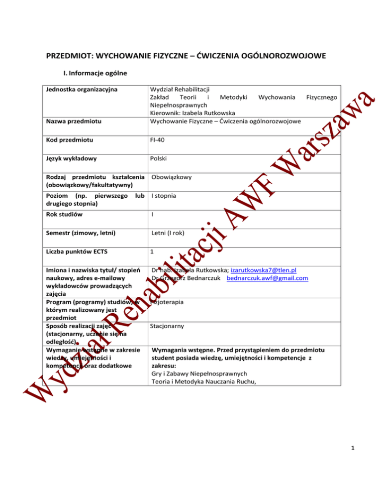PRZEDMIOT: WYCHOWANIE FIZYCZNE – ĆWICZENIA OGÓLNOROZWOJOWE I. Informacje ogólne Jednostka organizacyjna Nazwa przedmiotu Wydział Rehabilitacji Zakład Teorii i Metodyki Wychowania Fizycznego Niepełnosprawnych Kierownik: Izabela Rutkowska Wychowanie Fizyczne – Ćwiczenia ogólnorozwojowe Kod przedmiotu FI-40 Język wykładowy Polski Rodzaj przedmiotu kształcenia Obowiązkowy (obowiązkowy/fakultatywny) Poziom (np. pierwszego drugiego stopnia) lub I stopnia Rok studiów I Semestr (zimowy, letni) Letni (I rok) Liczba punktów ECTS 1 Imiona i nazwiska tytuł/ stopień naukowy, adres e-mailowy wykładowców prowadzących zajęcia Program (programy) studiów, w którym realizowany jest przedmiot Sposób realizacji zajęć (stacjonarny, uczenie się na odległość) Wymaganie wstępne w zakresie wiedzy, umiejętności i kompetencji oraz dodatkowe Dr hab. Izabela Rutkowska; [email protected] Dr Grzegorz Bednarczuk [email protected] Fizjoterapia Stacjonarny Wymagania wstępne. Przed przystąpieniem do przedmiotu student posiada wiedzę, umiejętności i kompetencje z zakresu: Gry i Zabawy Niepełnosprawnych Teoria i Metodyka Nauczania Ruchu, 1 II. Informacje szczegółowe Cele przedmiotu C1 C2 C3 Zapoznanie studenta z podstawowymi informacjami na temat bezpieczeństwa i organizacji zajęć ogólnorozwojowych Zapoznanie studenta z metodami, środkami i formami stosowanymi w zajęciach ogólnorozwojowych i treningu zdrowotnym, Zapoznanie studenta z praktycznymi umiejętnościami w zakresie rekreacyjnych form lekkoatletycznych (poprawa poziomu umiejętności ruchowych studenta) Efekty kształcenia w zakresie wiedzy, umiejętności i kompetencji społecznych dla przedmiotu Efekt kształcenia Treść efektu kształcenia dla przedmiotu Odniesienie Odniesienie kierunkowy do celów do efektów obszarowych Wiedza K_W14; ma wiedzę w zakresie doboru różnych form aktywności dla osób ze specjalnymi potrzebami 1. Ma wiedzę na temat bezpieczeństwa i organizacji zajęć ogólnorozwojowych oraz trening zdrowotnego pełnosprawnych i ze specjalnymi potrzebami 2. Zna ogólne zasady doboru różnych form aktywności, a także metod i środków w zajęciach ogólnorozwojowych 3. Ma wiedzę na temat doskonalenia umiejętności ruchowych oraz kształtowania zdolności motorycznych osób pełnosprawnych i ze specjalnymi potrzebami K_W13 1. Zna problematykę treningu ma wiedzę z zakresu zdrowotnego przeznaczonego dla osób podstaw edukacji pełnosprawnych i ze specjalnymi zdrowotnej, promocji potrzebami zdrowia oraz profilaktyki z uwzględnieniem zjawiska niepełnosprawności C1, C2, C3 M1P_W05, M1P_W06 C1, C2, C3 M1P_W10, 1. Potrafi zaplanować i kontrolować proces C1,C2, C3 uczenia się ćwiczeń ogólnorozwojowych z uwzględnieniem metodyki nauczania ruchu oraz z wykorzystaniem fachowego nazewnictwa 2. Potrafi wykorzystać rekreacyjne formy lekkoatletyczne w doskonaleniu własnych umiejętności ruchowych oraz kształtowaniu zdolności motorycznych M1P_U10, M1P_U11 Umiejętności K_U16 potrafi planować i kontrolować oraz prowadzić proces nauczania i uczenia się ruchów z uwzględnieniem aspektów rozwojowych i 2 metodyki nauczania ruchu z wykorzystaniem fachowego nazewnictwa ćwiczeń dla osób z różnymi możliwościami funkcjonalnymi K_U15; posiada specjalistyczne umiejętności ruchowe z zakresu wybranych form aktywności fizycznej (rekreacyjnych, zdrowotnych, sportowych i estetycznych) 1.Posiada umiejętności ruchowe niezbędne do realizacji zajęć ogólnorozwojowych i treningu zdrowotnego 2.Posiada podstawowy poziom sprawności fizycznej specjalnej (ćwiczenia wstępne do wybranych konkurencji lekkoatletycznych) potrzebny do uczestnictwa w rekreacyjnych formach lekkoatletycznych 3.Posiada odpowiedni poziom sprawności fizycznej ukierunkowanej na zdrowie (pozytywny wyniki w teście sprawności) C3 M1P_U11 C1,C2,C3 M1P_K09 Kompetencje społeczne K_K12 potrafi określić poziom sprawności niezbędny do wykonywania zawodu fizjoterapeuty oraz aktywnie uczestniczyć w różnych formach działań z zakresu aktywności fizycznej i promocji zdrowia 1. Potrafi propagować i aktywnie kreować zdrowy styl życia oraz ideę sprawności fizycznej ukierunkowanej na zdrowie 2. Potrafi krytycznie oceniać poziom sprawności oraz dokonywać weryfikacji proponowanych rozwiązań, a także identyfikować problemy związane z wykonaniem zawodu. 3. Potrafi uczestniczyć w zajęciach ogólnorozwojowych i treningu zdrowotnym Treści programowe ĆWICZENIA/ ZAJĘCIA PRAKTYCZNE TP1 Zapoznanie z zasadami bezpieczeństwa oraz sposobem organizacji zajęć ogólnorozwojowych i treningu zdrowotnego. K_W14/1 K_U15/1,2,3 K_K12 C1,C3 TP2 Zajęcia pokazowe - wykorzystanie wybranych metod, środków i form w zajęciach ogólnorozwojowych. C1, C2,C3 TP3 Zajęcia pokazowe - wykorzystanie wybranych metod, środków i form w treningu zdrowotnym osób pełnosprawnych oraz ze specjalnymi potrzebami K_W14/1,2,3 K_U15/1,2,3 K_K12 K_W13 K_W14/1,2,3 K_U15/1,2,3 K_K12 C1, C2,C3 3 TP4 TP5-7 TP8-9 TP10-11 TP12-13 TP14-15 Przykłady gier i zabaw wykorzystywanych w rekreacyjnych formach lekkoatletycznych K_W13 K_W14/1,2,3 K_U15/1,2,3 K_K12 Zajęcia ogólnorozwojowe z akcentem na K_W13 kształtowanie poszczególnych zdolności K_W14/1,2,3 motorycznych K_U15/1,2,3 K_U16 K_K12 Zajęcia ogólnorozwojowe z akcentem na nauczanie K_W13 ćwiczeń wstępnych do wybranych konkurencji K_W14/1,2,3 lekkoatletycznych K_U15/1,2,3 K_U16 K_K12 Doskonalenie umiejętności ruchowych z K_W13 K_W14/1,2,3 zastosowaniem ćwiczeń ogólnorozwojowych oraz metody ich adaptacji dla osób ze specjalnymi K_U15/1,2,3 potrzebami K_U16 K_K12 Przeprowadzenie testu sprawności fizycznej K_W14/1,2,3 ukierunkowanej na zdrowie K_U15/1,2,3 K_U16 K_K12 Doskonalenie umiejętności ruchowych z K_W13 zastosowaniem ćwiczeń ogólnorozwojowych oraz K_W14/1,2,3 metody ich adaptacji dla osób ze specjalnymi K_U15/1,2,3 potrzebami K_U16 K_K12 C1, C2,C3 C1, C2,C3 C1, C2,C3 C1, C2,C3 C