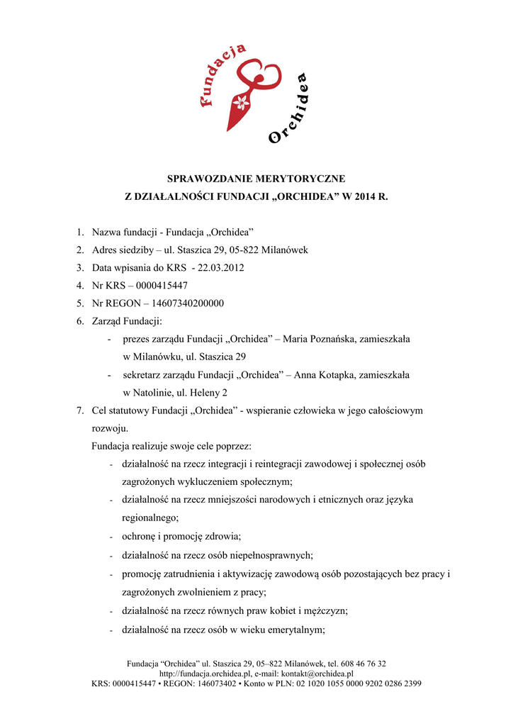 SPRAWOZDANIE MERYTORYCZNE Z DZIAŁALNOŚCI FUNDACJI „ORCHIDEA” W 2014 R. 1. Nazwa fundacji - Fundacja „Orchidea” 2. Adres siedziby – ul. Staszica 29, 05-822 Milanówek 3. Data wpisania do KRS - 22.03.2012 4. Nr KRS – 0000415447 5. Nr REGON – 14607340200000 6. Zarząd Fundacji: - prezes zarządu Fundacji „Orchidea” – Maria Poznańska, zamieszkała w Milanówku, ul. Staszica 29 - sekretarz zarządu Fundacji „Orchidea” – Anna Kotapka, zamieszkała w Natolinie, ul. Heleny 2 7. Cel statutowy Fundacji „Orchidea” - wspieranie człowieka w jego całościowym rozwoju. Fundacja realizuje swoje cele poprzez: - działalność na rzecz integracji i reintegracji zawodowej i społecznej osób zagrożonych wykluczeniem społecznym; - działalność na rzecz mniejszości narodowych i etnicznych oraz języka regionalnego; - ochronę i promocję zdrowia; - działalność na rzecz osób niepełnosprawnych; - promocję zatrudnienia i aktywizację zawodową osób pozostających bez pracy i zagrożonych zwolnieniem z pracy; - działalność na rzecz równych praw kobiet i mężczyzn; - działalność na rzecz osób w wieku emerytalnym; Fundacja “Orchidea” ul. Staszica 29, 05–822 Milanówek, tel. 608 46 76 32 http://fundacja.orchidea.pl, e-mail: [email protected] KRS: 0000415447 • REGON: 146073402 • Konto w PLN: 02 1020 1055 0000 9202 0286 2399 - działalność wspomagającej rozwój wspólnot i społeczności lokalnych; - organizowanie wypoczynku dzieci i młodzieży; - działalność w obszarze kultury, sztuki, ochrony dóbr kultury i dziedzictwa narodowego; - działalność w obszarze ekologii i ochrony zwierząt oraz ochrony dziedzictwa przyrodniczego; - promocję i organizację wolontariatu; - działalność na rzecz rodziny, macierzyństwa, rodzicielstwa, upowszechniania i ochrony praw dziecka; - przeciwdziałanie uzależnieniom i patologiom społecznym. 8. zasady, formy i zakres działalności statutowej z podaniem realizacji celów statutowych, a także opis głównych zdarzeń prawnych w jej działalności o skutkach finansowych: W 2014 r. Fundacja „Orchidea” realizowała projekt „Pracownia Psychoterapii i Twórczego Rozwoju Orchidea”. W ramach tego projektu zatrudniona na umowę zlecenie psycholożka udzielała porad psychologicznych i prowadziła terapię osób dorosłych i młodzieży. Działania te były prowadzone w ramach odpłatnej działalności statutowej. W 2014 r. w „Pracowni Psychoterapii i Twórczego Rozwoju Orchidea” udzielono pomocy psychologicznej 26 razy. W 2014 r. Fundacja „Orchidea” kontynuowała współpracę z Powiatowym Centrum Pomocy Rodzinie w Grodzisku Mazowieckim. Dzięki tej współpracy psycholożka z Fundacji „Orchidea” udziela porad i konsultacji psychologicznych w ramach działalności PCPR i dla beneficjentów PCPR, którymi są mieszkańcy powiatu grodziskiego, a zwłaszcza rodziny zastępcze i osoby stosujące przemoc. Fundacja “Orchidea” ul. Staszica 29, 05–822 Milanówek, tel. 608 46 76 32 http://fundacja.orchidea.pl, e-mail: [email protected] KRS: 0000415447 • REGON: 146073402 • Konto w PLN: 02 1020 1055 0000 9202 0286 2399 Również w ramach współpracy z PCPR w Grodzisku Mazowieckim zrealizowano projekt pt. „Poszerzyć krąg”, w ramach którego psycholożka z Fundacji „Orchidea” udzielała wsparcia psychologicznego osobom niepełnosprawnym w ich miejscu zamieszkania. W 2014 r. na mocy współpracy z Fundacją LaStrada psycholożka z Fundacji „Orchidea” udzieliła 23 sesji psychologicznych. Fundacja „Orchidea” przeszkoliła nauczycieli i rodziców z Zespołu Szkolno – Gimnazjalnego w Bartnikach z zakresu bezpieczeństwa dzieci i młodzieży w Internecie. 9. Informacje o prowadzonej działalności gospodarczej według wpisu do rejestru przedsiębiorców Krajowego Rejestru Sądowego: Fundacja „Orchidea” nie prowadzi działalności gospodarczej. 10. Informacja o wysokości uzyskanych w 2014 r. przychodów z wyodrębnieniem ich źródeł i uwzględnieniem kosztów tych świadczeń: - Przychody z odpłatnej działalności statutowej: 29 414,03 zł - Koszty realizacji zadań statutowych: 27 676,40 zł 11. Informacja o poniesionych kosztach na: a) Realizację celów statutowych: 27 676,40 zł b) Administrację: 0 zł c) Działalność gospodarczą: nie dotyczy d) Pozostałe koszty: 0 zł 12. Dane o: a) Liczbie osób zatrudnionych w Fundacji „Orchidea”: 0 Fundacja “Orchidea” ul. Staszica 29, 05–822 Milanówek, tel. 608 46 76 32 http://fundacja.orchidea.pl, e-mail: [email protected] KRS: 0000415447 • REGON: 146073402 • Konto w PLN: 02 1020 1055 0000 9202 0286 2399 b) Łącznej kwocie wynagrodzeń: 0 zł c) Wysokości rocznego lub przeciętnego wynagrodzenia: 0 zł d) Wydatkach na wynagrodzenia z umów zlecenia: 27 676,40 zł e) Udzielonych przez Fundację „Orchidea” pożyczkach pieniężnych: 0 zł f) Kwotach ulokowanych na rachunkach: 0 zł g) Wartości nabytych obligacji: 0 zł h) Nabytych nieruchomościach: 0 i) Nabytych pozostałych środkach trwałych: 0 j) Wartości aktywów i zobowiązań: - aktywa: 2 688,62 zł - pasywa: 2 688,62 zł 13. Dane o działalności zleconej Fundacji „Orchidea” przez podmioty państwowe i samorządowe – nie zlecono 14. Informację o rozliczeniach Fundacji „Orchidea” z tytułu ciążących zobowiązań podatkowych, a także informację w sprawie składanych deklaracji podatkowych: Fundacja „Orchidea” złożyła za 2014 r deklarację CIT-8, w której podatek wyniósł: 0 zł. 15. W 2014 r. w Fundacji „Orchidea” nie była przeprowadzona żadna kontrola. 16. Do sprawozdania dołącza się kopie uchwał podjętych przez zarząd Fundacji „Orchidea” – szt. 8 Fundacja “Orchidea” ul. Staszica 29, 05–822 Milanówek, tel. 608 46 76 32 http://fundacja.orchidea.pl, e-mail: [email protected] KRS: 0000415447 • REGON: 146073402 • Konto w PLN: 02 1020 1055 0000 9202 0286 2399