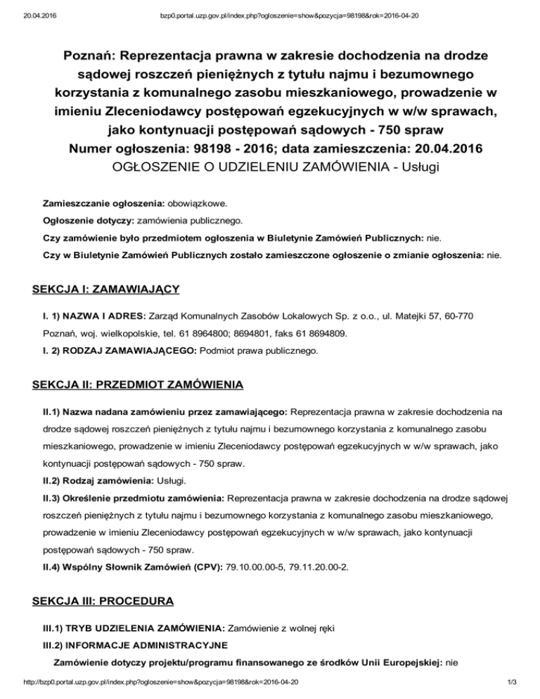 20.04.2016 bzp0.portal.uzp.gov.pl/index.php?ogloszenie=show&pozycja=98198&rok=20160420 Poznań: Reprezentacja prawna w zakresie dochodzenia na drodze sądowej roszczeń pieniężnych z tytułu najmu i bezumownego korzystania z komunalnego zasobu mieszkaniowego, prowadzenie w imieniu Zleceniodawcy postępowań egzekucyjnych w w/w sprawach, jako kontynuacji postępowań sądowych 750 spraw Numer ogłoszenia: 98198 2016; data zamieszczenia: 20.04.2016 OGŁOSZENIE O UDZIELENIU ZAMÓWIENIA Usługi Zamieszczanie ogłoszenia: obowiązkowe. Ogłoszenie dotyczy: zamówienia publicznego. Czy zamówienie było przedmiotem ogłoszenia w Biuletynie Zamówień Publicznych: nie. Czy w Biuletynie Zamówień Publicznych zostało zamieszczone ogłoszenie o zmianie ogłoszenia: nie. SEKCJA I: ZAMAWIAJĄCY I. 1) NAZWA I ADRES: Zarząd Komunalnych Zasobów Lokalowych Sp. z o.o., ul. Matejki 57, 60770 Poznań, woj. wielkopolskie, tel. 61 8964800; 8694801, faks 61 8694809. I. 2) RODZAJ ZAMAWIAJĄCEGO: Podmiot prawa publicznego. SEKCJA II: PRZEDMIOT ZAMÓWIENIA II.1) Nazwa nadana zamówieniu przez zamawiającego: Reprezentacja prawna w zakresie dochodzenia na drodze sądowej roszczeń pieniężnych z tytułu najmu i bezumownego korzystania z komunalnego zasobu mieszkaniowego, prowadzenie w imieniu Zleceniodawcy postępowań egzekucyjnych w w/w sprawach, jako kontynuacji postępowań sądowych 750 spraw. II.2) Rodzaj zamówienia: Usługi. II.3) Określenie przedmiotu zamówienia: Reprezentacja prawna w zakresie dochodzenia na drodze sądowej roszczeń pieniężnych z tytułu najmu i bezumownego korzystania z komunalnego zasobu mieszkaniowego, prowadzenie w imieniu Zleceniodawcy postępowań egzekucyjnych w w/w sprawach, jako kontynuacji postępowań sądowych 750 spraw. II.4) Wspólny Słownik Zamówień (CPV): 79.10.00.005, 79.11.20.002. SEKCJA III: PROCEDURA III.1) TRYB UDZIELENIA ZAMÓWIENIA: Zamówienie z wolnej ręki III.2) INFORMACJE ADMINISTRACYJNE Zamówienie dotyczy projektu/programu finansowanego ze środków Unii Europejskiej: nie http://bzp0.portal.uzp.gov.pl/index.php?ogloszenie=show&pozycja=98198&rok=20160420 1/3 20.04.2016 bzp0.portal.uzp.gov.pl/index.php?ogloszenie=show&pozycja=98198&rok=20160420 SEKCJA IV: UDZIELENIE ZAMÓWIENIA Część NR: 1 Nazwa: zadanie 1 250 spraw IV.1) DATA UDZIELENIA ZAMÓWIENIA: 06.04.2016. IV.2) LICZBA OTRZYMANYCH OFERT: 1. IV.3) LICZBA ODRZUCONYCH OFERT: 0. IV.4) NAZWA I ADRES WYKONAWCY, KTÓREMU UDZIELONO ZAMÓWIENIA: Kancelaria Adwokacka Piotr Wawrzyniak, ul. Solna 3/6, 61735 Poznań, kraj/woj. wielkopolskie. IV.5) Szacunkowa wartość zamówienia (bez VAT): 142500,00 PLN. IV.6) INFORMACJA O CENIE WYBRANEJ OFERTY ORAZ O OFERTACH Z NAJNIŻSZĄ I NAJWYŻSZĄ CENĄ Cena wybranej oferty: 47500,00 Oferta z najniższą ceną: 47500,00 / Oferta z najwyższą ceną: 47500,00 Waluta: PLN . Część NR: 2 Nazwa: zadanie 2 250 spraw IV.1) DATA UDZIELENIA ZAMÓWIENIA: 13.04.2016. IV.2) LICZBA OTRZYMANYCH OFERT: 1. IV.3) LICZBA ODRZUCONYCH OFERT: 0. IV.4) NAZWA I ADRES WYKONAWCY, KTÓREMU UDZIELONO ZAMÓWIENIA: Kancelaria Adwokacka Michał Pankowski, ul. Św. Marcin 9/8, 61803 Poznań, kraj/woj. wielkopolskie. IV.5) Szacunkowa wartość zamówienia (bez VAT): 142500,00 PLN. IV.6) INFORMACJA O CENIE WYBRANEJ OFERTY ORAZ O OFERTACH Z NAJNIŻSZĄ I NAJWYŻSZĄ CENĄ Cena wybranej oferty: 47500,00 Oferta z najniższą ceną: 47500,00 / Oferta z najwyższą ceną: 47500,00 Waluta: PLN . Część NR: 3 Nazwa: zadanie 3 250 spraw IV.1) DATA UDZIELENIA ZAMÓWIENIA: 15.04.2016. IV.2) LICZBA OTRZYMANYCH OFERT: 1. IV.3) LICZBA ODRZUCONYCH OFERT: 0. IV.4) NAZWA I ADRES WYKONAWCY, KTÓREMU UDZIELONO ZAMÓWIENIA: Kancelaria Prawna Zamlewski i Wspólnicy spółka komandytowa, ul. Wojskowa 4, 60792 Poznań, kraj/woj. wielkopolskie. IV.5) Szacunkowa wartość zamówienia (bez VAT): 142500,00 PLN. IV.6) INFORMACJA O CENIE WYBRANEJ OFERTY ORAZ O OFERTACH Z NAJNIŻSZĄ I NAJWYŻSZĄ CENĄ http://bzp0.portal.uzp.gov.pl/index.php?ogloszenie=show&pozycja=98198&rok=20160420 2/3 20.04.2016 bzp0.portal.uzp.gov.pl/index.php?ogloszenie=show&pozycja=98198&rok=20160420 Cena wybranej oferty: 47500,00 Oferta z najniższą ceną: 47500,00 / Oferta z najwyższą ceną: 47500,00 Waluta: PLN . ZAŁĄCZNIK I Uzasadnienie udzielenia zamówienia w trybie negocjacji bez ogłoszenia, zamówienia z wolnej ręki albo zapytania o cenę 1. Podstawa prawna Postępowanie prowadzone jest w trybie zamówienie z wolnej ręki na podstawie art. 5 ust. 1b ustawy z dnia 29 stycznia 2004r. Prawo zamówień publicznych. 2. Uzasadnienia wyboru trybu Należy podać uzasadnienie faktyczne i prawne wyboru trybu oraz wyjaśnić, dlaczego udzielenie zamówienia jest zgodne z przepisami. art.5 ust.1b ustawy Prawo Zamówień Publicznych 29 styczna 2004r. (Dz. U. z 2013 poz. 907 z późn.zm.) usługi wymienione w załączniku II B do dyrektywy 2004/18/WE Parlamentu Europejskiego i Rady z dnia 31 marca 2004 r. w sprawie koordynacji procedur udzielania zamówień publicznych na roboty budowlane, dostawy i usługi lub w załączniku XVII B do dyrektywy 2004/17/WE Parlamentu Europejskiego i Rady z dnia 31 marca 2004 r W przypadku zamówień, których przedmiotem są usługi prawnicze, polegające na wykonywaniu zastępstwa procesowego przed sądami, trybunałami lub innymi organami orzekającymi lub doradztwie prawnym w zakresie zastępstwa procesowego, lub jeżeli wymaga tego ochrona ważnych praw lub interesów Skarbu Państwa, nie stosuje się przepisów ustawy dotyczących przesłanek wyboru trybu negocjacji bez ogłoszenia oraz przesłanek wyboru trybu zamówienia z wolnej ręki. http://bzp0.portal.uzp.gov.pl/index.php?ogloszenie=show&pozycja=98198&rok=20160420 3/3