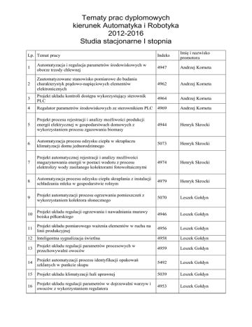 Tematy prac dyplomowych kierunek Automatyka i Robotyka 2012-2016 Studia stacjonarne I stopnia Lp. Temat pracy Indeks Imię i nazwisko promotora 1 Automatyzacja i regulacja parametrów środowiskowych w oborze trzody chlewnej 4947 Andrzej Korneta 2 Zautomatyzowane stanowisko pomiarowe do badania charakterystyk prądowo-napięciowych elementów elektronicznych 4962 Andrzej Korneta 3 Projekt układu kontroli dostępu wykorzystujący sterownik PLC 4964 Andrzej Korneta 4 Regulator parametrów środowiskowych ze sterownikiem PLC 4969 Andrzej Korneta 5 Projekt procesu rejestracji i analizy możliwości produkcji energii elektrycznej w gospodarstwach domowych z wykorzystaniem procesu zgazowania biomasy 4944 Henryk Skrocki 6 Automatyzacja procesu odzysku ciepła w skraplaczu klimatyzacji domu jednorodzinnego 5073 Henryk Skrocki 7 Projekt automatycznej rejestracji i analizy możliwości magazynowania energii w postaci wodoru z procesu elektrolizy wody zasilanego kolektorami fotowoltaicznymi 4974 Henryk Skrocki 8 Automatyzacja procesu odzysku ciepła skraplania z instalacji schładzania mleka w gospodarstwie rolnym 4979 Henryk Skrocki 9 Projekt automatyzacji procesu ogrzewania pomieszczeń z wykorzystaniem kolektora słonecznego 5070 Leszek Gołdyn 10 Projekt układu regulacji ogrzewania i nawadniania murawy boiska piłkarskiego 4946 Leszek Gołdyn 11 Projekt układu pomiarowego ważenia elementów w ruchu na linii produkcyjnej 4956 Leszek Gołdyn 4958 Leszek Gołdyn 12 Inteligentna sygnalizacja świetlna 13 Projekt układu regulacji parametrów procesowych w przechowywalni owoców 4959 Leszek Gołdyn 14 Projekt automatyzacji procesu identyfikacji opakowań szklanych w punkcie skupu 5492 Leszek Gołdyn 5039 Leszek Gołdyn 4953 Leszek Gołdyn 15 Projekt układu klimatyzacji hali uprawnej 16 Projekt układu regulacji parametrów w dojrzewalni warzyw i owoców z wykorzystaniem regulatora Tematy prac dyplomowych kierunek Automatyka i Robotyka 2012-2016 Studia stacjonarne I stopnia 17 Projekt sterowania położeniem kolektora słonecznego w układzie ogrzewania wody 4972 Leszek Gołdyn 18 Automatyzacja wybranego procesu produkcyjnego z wykorzystaniem sterownika Siemens S7-300 3594 Roman Trochimczuk Sterowanie wybranym robotem z wykorzystaniem platformy Arduino 20 Automatyzacja łupaka do drewna Projekt automatycznego zarządzania parkingiem 21 samochodowym 787 Ryszard Szczebiot 4954 Ryszard Szczebiot 22 Stanowisko dydaktyczne do programowania obrabiarek CNC 4955 Ryszard Szczebiot 4966 Ryszard Szczebiot 24 Program do akwizycji i wizualizacji stanu pogody 4970 Ryszard Szczebiot 25 Program do filmowania obiektów z zastosowaniem drona 4971 Ryszard Szczebiot 4965 Ryszard Szczebiot 4978 Ryszard Szczebiot 4948 Tomasz Kuźmierowski 4951 Tomasz Kuźmierowski 30 Projekt systemu sterowania wybranymi funkcjami samochodu 5071 z wykorzystaniem platformy Arduino Tomasz Kuźmierowski 31 Projekt sterowania dźwigiem suwnicowym z wykorzystaniem sterownika PLC 4967 Tomasz Kuźmierowski 32 Projekt i wykonanie konstrukcji oraz opracowanie sterowania robotem mobilnym podążającym wzdłuż linii 4968 Tomasz Kuźmierowski 33 Projekt automatycznego sterowania klimatyzatorem pomieszczenia z użyciem mikrokontrolera 4980 Tomasz Kuźmierowski 5580 Tomasz Kuźmierowski 19 23 Stanowisko do automatycznego napełniania naczyń o regulowanej pojemności Program do tworzenia mapy otoczenia z wykorzystaniem robota mobilnego Stanowisko dydaktyczne do programowania współpracy 27 robotów 26 28 Projekt sterowania linią do automatycznego paletyzowania opakowań kartonowych 29 Projekt skanera 3D otoczenia robota mobilnego 34 Projekt i wykonanie układu elektrycznego zasilania roweru Roman Trochimczuk