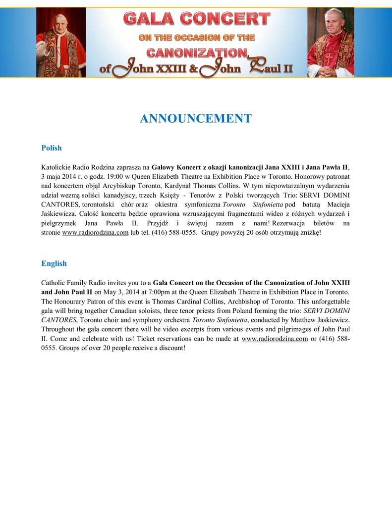 ANNOUNCEMENT Polish Katolickie Radio Rodzina zaprasza na Galowy Koncert z okazji kanonizacji Jana XXIII i Jana Pawła II, 3 maja 2014 r. o godz. 19:00 w Queen Elizabeth Theatre na Exhibition Place w Toronto. Honorowy patronat nad koncertem objął Arcybiskup Toronto, Kardynał Thomas Collins. W tym niepowtarzalnym wydarzeniu udział wezmą soliści kanadyjscy, trzech Księży - Tenorów z Polski tworzących Trio: SERVI DOMINI CANTORES, torontoński chór oraz okiestra symfoniczna Toronto Sinfonietta pod batutą Macieja Jaśkiewicza. Całość koncertu będzie oprawiona wzruszającymi fragmentami wideo z różnych wydarzeń i pielgrzymek Jana Pawła II. Przyjdź i świętuj razem z nami! Rezerwacja biletów na stronie www.radiorodzina.com lub tel. (416) 588-0555. Grupy powyżej 20 osób otrzymują zniżkę! English Catholic Family Radio invites you to a Gala Concert on the Occasion of the Canonization of John XXIII and John Paul II on May 3, 2014 at 7:00pm at the Queen Elizabeth Theatre in Exhibition Place in Toronto. The Honourary Patron of this event is Thomas Cardinal Collins, Archbishop of Toronto. This unforgettable gala will bring together Canadian soloists, three tenor priests from Poland forming the trio: SERVI DOMINI CANTORES, Toronto choir and symphony orchestra Toronto Sinfonietta, conducted by Matthew Jaskiewicz. Throughout the gala concert there will be video excerpts from various events and pilgrimages of John Paul II. Come and celebrate with us! Ticket reservations can be made at www.radiorodzina.com or (416) 5880555. Groups of over 20 people receive a discount! BACKGROUNDER The Objective The organizers, on behalf of all people of good will, are preparing a major Canonization Gala Concert in thanksgiving for the service and witness of His Holiness blessed John Paul II and blessed John XXIII, on the occasion of their canonization. Children, youth, families, international performers, political officials and representatives of diverse cultures and faiths will all have meaningful roles in this momentous event. When will it take place? This Canonization Gala Concert will take place on Saturday, May 3 rd, 2014, at 7:00 pm. Where will it take place? The Canonization Gala Concert will take place at Queen Elizabeth Theatre, 190 Princes Boulevard, Exhibition Place, Toronto, Ontario, M6K 3C3. Who will be there? The concert will feature world-class opera performers, classical and contemporary musicians, as well as representatives from the political, film, and media realms. Well-known performers will include: Servi Domini Cantores of Poland: Fr. Rafał Kobylinski SJ - Tenor, Fr Pawel Sobierajski – Tenor, Fr. Zdzislaw Madej – Tenor, Maria Knapik – Sopran, Susan HooKong-Taylor who performed at World Youth Day 2002 in Toronto, 100-Voice Choir, Maestro Matthew Jaskiewicz and the symphony orchestra. Volunteers Individuals who wish to donate time, talents, experience, or who wish to provide feedback on the program of events, are encouraged to write to the organizing committee at: [email protected]. Sponsors Businesses and private individuals wishing to sponsor the Canonization Gala Concert are asked to contact the marketing division at: [email protected] or 416-588-0555. Organizers Honourary Patron, Thomas Cardinal Collins, Archbishop of Toronto, Catholic Family Radio in partnership with the Missionary Oblates of Mary Immaculate, Assumption Province and a distinguished committee of public officials, clergy, businesspeople, writers, and artists. Advisory Committee: Catholic Family Radio, Fr. Marian Gil OMI, Provincial of the Missionary Oblates of Mary Immaculate, Assumption Province, Fr. Janusz Błazejak OMI, the pastor of St. Maximilian Kolbe Parish, Matthew Jaskiewicz, Artist and Prof. Tom Urbaniak, PhD Cape Breton University. For more information please visit our web site: www.radiorodzina.com