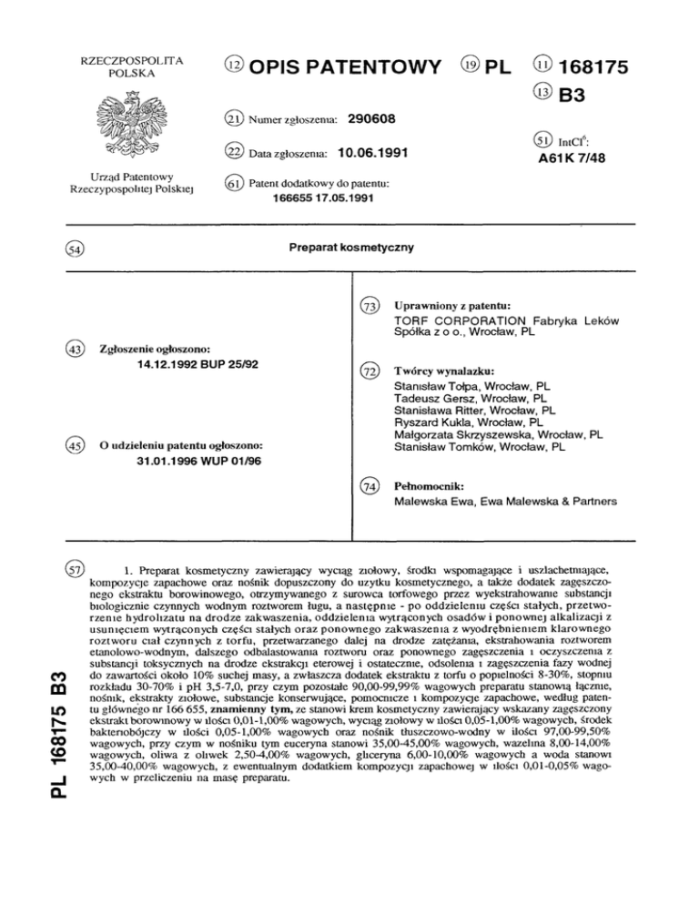 RZECZPOSPOLITA POLSKA OPIS PATENTOWY (2 1) Numer zgłoszenia: (22) Data zgłoszenia: Urząd Patentowy Rzeczypospolitej Polskiej PL (11) 168175 (13) B3 290608 10.06.1991 (51)IntCl6: A61K 7/48 (61) Patent dodatkowy do patentu: 16665517.05.1991 Preparat kosmetyczny (54) Uprawniony z patentu: T O R F C O R P O R A T IO N Fabryka Leków Spółka z o o . , Wrocław, PL Zgłoszenie ogłoszono: 14.12.1992 BUP 25/92 Twórcy wynalazku: Stanisław Tolpa, Wrocław, PL Tadeusz Gersz, Wrocław, PL Stanisława Ritter, Wrocław, PL Ryszard Kukla, Wrocław, PL Małgorzata Skrzyszewska, Wrocław, PL Stanisław Tomków, Wrocław, PL O udzieleniu patentu ogłoszono: 31.01.1996 WUP 01/96 )( 4 7 PL 168175 B3 (5 7) Pełnomocnik: M alew ska Ewa, Ewa M alewska & Partners 1. Preparat kosmetyczny zawierający wyciąg ziołowy, środki wspomagające i uszlachetniające, kompozycje zapachowe oraz nośnik dopuszczony do użytku kosmetycznego, a także dodatek zagęszczonego ekstraktu borowinowego, otrzymywanego z surowca torfowego przez wyekstrahowanie substancji biologicznie czynnych wodnym roztworem ługu, a następnie - po oddzieleniu części stałych, przetw orzenie hydrolizatu n a drodze zakwaszenia, oddzielenia wytrąconych osadów i ponow nej alkalizacji z usunięciem wytrąconych części stałych oraz ponow nego zakwaszenia z wyodrębnieniem klarownego roztw oru ciał czynnych z torfu, przetwarzanego dalej na drodze zatężania, ekstrahowania roztworem etanolowo-wodnym, dalszego odbalastowama roztworu oraz ponownego zagęszczenia 1 oczyszczenia z substancji toksycznych na drodze ekstrakcji eterowej i ostatecznie, odsolema 1 zagęszczenia fazy wodnej do zawartości około 10% suchej masy, a zwłaszcza dodatek ekstraktu z torfu o popielności 8-30%, stopniu rozkładu 30-70% i pH 3,5-7,0, przy czym pozostałe 90,00-99,99% wagowych preparatu stanowią łącznie, nośnik, ekstrakty ziołowe, substancje konserwujące, pomocnicze 1 kompozycje zapachowe, według patentu głównego nr 166 655, znamienny tym, ze stanowi krem kosmetyczny zawierający wskazany zagęszczony ekstrakt borowinowy w ilości 0,01-1,00% wagowych, wyciąg ziołowy w ilości 0,05-1,00% wagowych, środek bakteriobójczy w ilości 0,05-1,00% wagowych oraz nośnik tłuszczowo-wodny w ilości 97,00-99,50% wagowych, przy czym w nośniku tym euceryna stanowi 35,00-45,00% wagowych, wazelina 8,00-14,00% wagowych, oliwa z oliwek 2,50-4,00% wagowych, gliceryna 6,00-10,00% wagowych a woda stanowi 35,00-40,00% wagowych, z ewentualnym dodatkiem kompozycji zapachowej w ilości 0,01-0,05% wagowych w przeliczeniu na masę preparatu. Preparat kosmetyczny Zastrzeżenia patentowe 1. Preparat kosmetyczny zawierający wyciąg ziołowy, środki wspomagające i uszlachetniające, kompozycje zapachowe oraz nośnik dopuszczony do użytku kosmetycznego, a także dodatek zagęszczonego ekstraktu borowinowego, otrzymywanego z surowca torfowego przez wyekstrahowanie substancji biologicznie czynnych wodnym roztworem ługu, a następnie - po oddzieleniu części stałych, przetworzenie hydrolizatu na drodze zakwaszenia, oddzielenia wytrąconych osadów i ponownej alkalizacji z usunięciem wytrąconych części stałych oraz ponownego zakwaszenia z wyodrębnieniem klarownego roztworu ciał czynnych z torfu, przetwarzanego dalej na drodze zatężania, ekstrahowania roztworem etanolowo-wodnym, dalszego odbalastowania roztworu oraz ponownego zagęszczenia i oczyszczenia z substancji toksycznych na drodze ekstrakcji eterowej i ostatecznie, odsolenia i zagęszczenia fazy wodnej do zawartości około 10% suchej masy, a zwłaszcza dodatek ekstraktu z torfu o popielności 8-30%, stopniu rozkładu 30-70% i pH 3,5-7,0, przy czym pozostałe 90,00-99,99% wagowych preparatu stanowią łącznie, nośnik, ekstrakty ziołowe, substancje konserwujące, pomocnicze i kompozycje zapachowe, według patentu głównego nr 166 655, znamienny tym, że stanowi krem kosmetyczny zawierający wskazany zagęszczony ekstrakt borowinowy w ilości 0,011,00% wagowych, wyciąg ziołowy w ilości 0,05-1,00% wagowych, środek bakteriobójczy w ilości 0,05-1,00% wagowych oraz nośnik tłuszczowo-wodny w ilości 97,00-99,50% wagowych, przy czym w nośniku tym euceryna stanowi 35,00-45,00% wagowych, wazelina 8,00-14,00% wagowych, oliwa z oliwek 2,50-4,00% wagowych, gliceryna 6,00-10,00% wagowych a woda stanowi 35,00-40,00% wagowych, z ewentualnym dodatkiem kompozycji zapachowej w ilości 0,01-0,05% wagowych w przeliczeniu na masę preparatu. 2. Preparat według zastrz. 1, znamienny tym, że zawiera 0,05% wagowych wskazanego zagęszczonego ekstraktu borowinowego, wyciąg nagietkowy w ilości 0,10% wagowych, środek bakteriobójczy w ilości 0,40% wagowych i syntetyczną kompozycję zapachową w ilości 0,02% wagowych w nośniku tłuszczowo wodnym, przy czym eurycyna stanowi 39,00% wagowych, wazelina stanowi 11,50% wagowych, oliwa z oliwek stanowi 3,13% wagowych, gliceryna stanowi 7,80% wagowych a woda stanowi 38,00% wagowych w przeliczeniu na masę całego preparatu - kremu kosmetycznego. 3. Preparat według zastrz. 1, znamienny tym, że zawiera jedynie 0,05% wagowych wskazanego zagęszczonego ekstraktu borowinowego, wyciąg rumiankowy w ilości 0,05% wagowych, środek bekteriobójczy w ilości 0,40% wagowych i syntetyczną kompozycję zapachową w ilości 0,05% wagowych w nośniku tłuszczowo wodnym, przy czym euceryna stanowi 42,00% wagowych, wazelina stanowi 8,50% wagowych, oliwa z oliwek stanowi 3,08% wagowych, gliceryna stanowi 7,90% wagowych a woda stanowi 38,00% wagowych w przeliczeniu na masę całego preparatu - krem kosmetycznego. * * * Przedmiotem wynalazku jest preparat kosmetyczny. Produkt według wynalazku jest uzupełnieniem rozwiązania według patentu głównego nr 166 655. Znane kremy kosmetyczne stanowią podstawowy środek do pielęgnacji skóry twarzy. Znane kremy dostosowane są do różnych rodzajów skóry: suchej, tłustej i normalnej, a także dla cery w różnym wieku i wystawionej na dzi