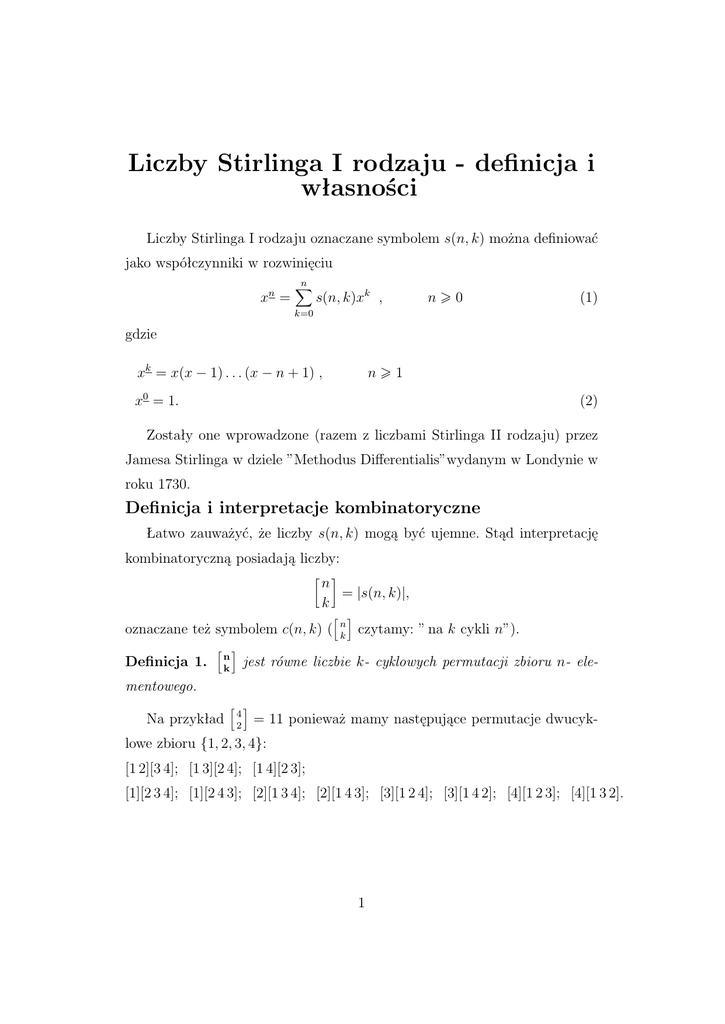 Liczby Stirlinga I rodzaju oznaczane symbolem s(n, k) można definiować