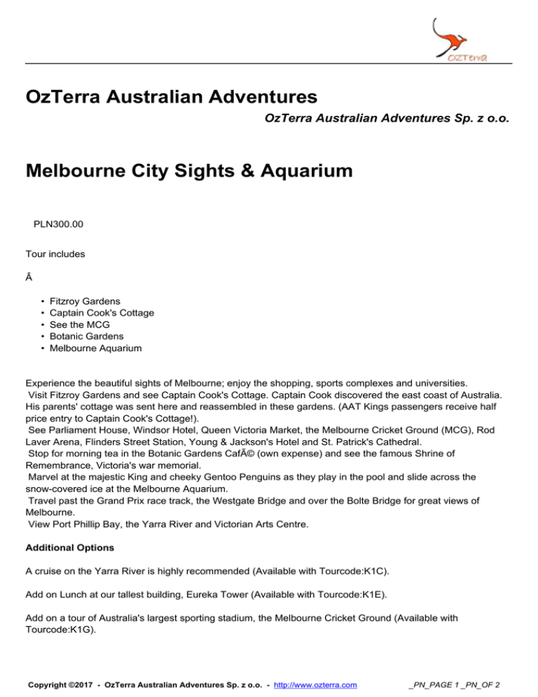 OzTerra Australian Adventures OzTerra Australian Adventures Sp. z o.o. Melbourne City Sights & Aquarium PLN300.00 Tour includes  • • • • • Fitzroy Gardens Captain Cook's Cottage See the MCG Botanic Gardens Melbourne Aquarium Experience the beautiful sights of Melbourne; enjoy the shopping, sports complexes and universities. Visit Fitzroy Gardens and see Captain Cook's Cottage. Captain Cook discovered the east coast of Australia. His parents' cottage was sent here and reassembled in these gardens. (AAT Kings passengers receive half price entry to Captain Cook's Cottage!). See Parliament House, Windsor Hotel, Queen Victoria Market, the Melbourne Cricket Ground (MCG), Rod Laver Arena, Flinders Street Station, Young & Jackson's Hotel and St. Patrick's Cathedral. Stop for morning tea in the Botanic Gardens Café (own expense) and see the famous Shrine of Remembrance, Victoria's war memorial. Marvel at the majestic King and cheeky Gentoo Penguins as they play in the pool and slide across the snow-covered ice at the Melbourne Aquarium. Travel past the Grand Prix race track, the Westgate Bridge and over the Bolte Bridge for great views of Melbourne. View Port Phillip Bay, the Yarra River and Victorian Arts Centre. Additional Options A cruise on the Yarra River is highly recommended (Available with Tourcode:K1C). Add on Lunch at our tallest building, Eureka Tower (Available with Tourcode:K1E). Add on a tour of Australia's largest sporting stadium, the Melbourne Cricket Ground (Available with Tourcode:K1G). Copyright ©2017 - OzTerra Australian Adventures Sp. z o.o. - http://www.ozterra.com _PN_PAGE 1 _PN_OF 2 Informacja o sprzedawcy Recenzje klientów: Nikt jeszcze nie recenzowaÅ‚ tego produktu. Aby dodać recenzjÄ™, zaloguj siÄ™. Copyright ©2017 - OzTerra Australian Adventures Sp. z o.o. - http://www.ozterra.com _PN_PAGE 2 _PN_OF 2