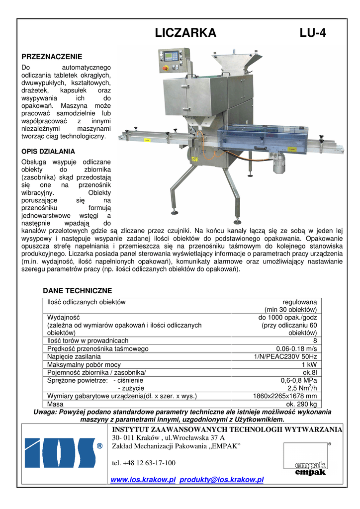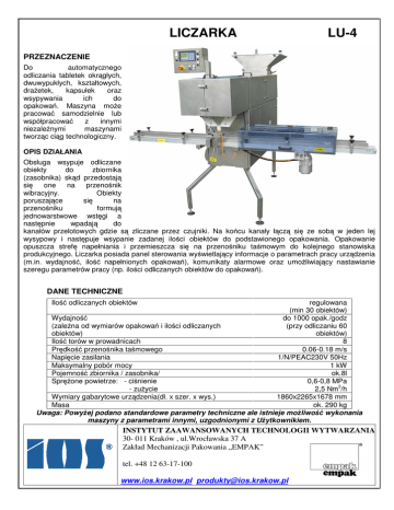 LICZARKA LU-4 PRZEZNACZENIE Do automatycznego odliczania tabletek okrągłych, dwuwypukłych, kształtowych, drażetek, kapsułek oraz wsypywania ich do opakowań. Maszyna może pracować samodzielnie lub współpracować z innymi niezależnymi maszynami tworząc ciąg technologiczny. OPIS DZIAŁANIA Obsługa wsypuje odliczane obiekty do zbiornika (zasobnika) skąd przedostają się one na przenośnik wibracyjny. Obiekty poruszające się na przenośniku formują jednowarstwowe wstęgi a następnie wpadają do kanałów przelotowych gdzie są zliczane przez czujniki. Na końcu kanały łączą się ze sobą w jeden lej wysypowy i następuje wsypanie zadanej ilości obiektów do podstawionego opakowania. Opakowanie opuszcza strefę napełniania i przemieszcza się na przenośniku taśmowym do kolejnego stanowiska produkcyjnego. Liczarka posiada panel sterowania wyświetlający informacje o parametrach pracy urządzenia (m.in. wydajność, ilość napełnionych opakowań), komunikaty alarmowe oraz umożliwiający nastawianie szeregu parametrów pracy (np. ilości odliczanych obiektów do opakowań). DANE TECHNICZNE Ilość odliczanych obiektów regulowana (min 30 obiektów) Wydajność do 1000 opak./godz (zależna od wymiarów opakowań i ilości odliczanych (przy odliczaniu 60 obiektów) obiektów) Ilość torów w prowadnicach 8 Prędkość przenośnika taśmowego 0.06-0.18 m/s Napięcie zasilania 1/N/PEAC230V 50Hz Maksymalny pobór mocy 1 kW Pojemność zbiornika / zasobnika/ ok.8l Sprężone powietrze: - ciśnienie 0,6-0,8 MPa - zużycie 2,5 Nm3/h Wymiary gabarytowe urządzenia(dł. x szer. x wys.) 1860x2265x1678 mm Masa ok. 290 kg Uwaga: Powyżej podano standardowe parametry techniczne ale istnieje możliwość wykonania maszyny z parametrami innymi, uzgodnionymi z Użytkownikiem. INSTYTUT ZAAWANSOWANYCH TECHNOLOGII WYTWARZANIA 30- 011 Kraków , ul.Wrocławska 37 A Zakład Mechanizacji Pakowania „EMPAK” tel. +48 12 63-17-100 www.ios.krakow.pl [email protected]