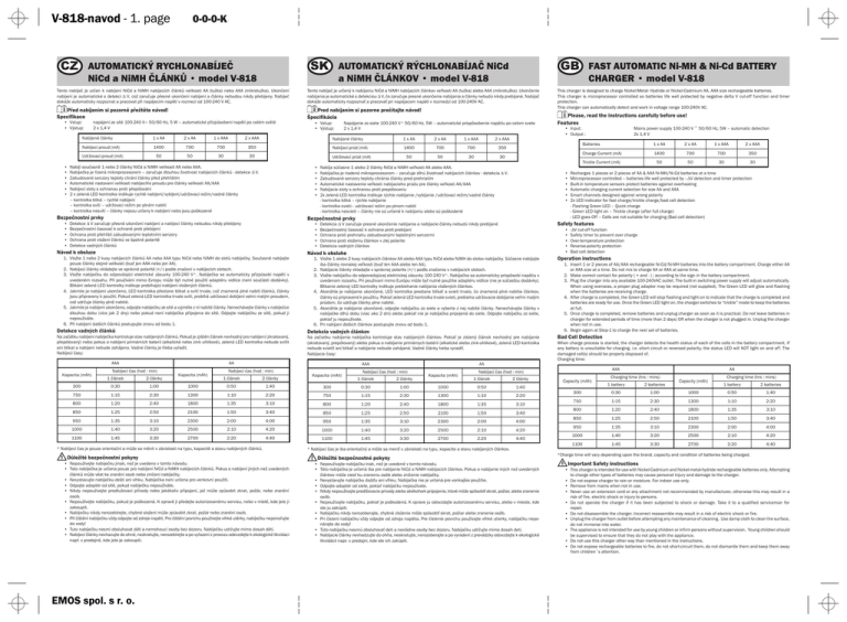 V-818-navod - 1. page 0-0-0-K CZ AUTOMATICKÝ RYCHLONABÍJEČ SK AUTOMATICKÝ RÝCHLONABÍJAČ NiCd NiCd a NiMH ČLÁNKŮ • model V-818 GB FAST AUTOMATIC Ni-MH & Ni-Cd BATTERY a NiMH ČLÁNKOV • model V-818 CHARGER • model V-818 Tento nabíječ je určen k nabíjení NiCd a NiMH nabíjecích článků velikosti AA (tužka) nebo AAA (mikrotužka). Ukončení nabíjení je automatické s detekcí ∆ V, což zaručuje přesné ukončení nabíjení a články nebudou nikdy přebíjeny. Nabíječ dokáže automaticky rozpoznat a pracovat při napájecím napětí v rozmezí od 100-240 V AC. Tento nabíjač je určený k nabíjaniu NiCd a NiMH nabíjacích článkov veľkosti AA (tužka) alebo AAA (mikrotužka). Ukončenie nabíjania je automatické s detekciou ∆ V, čo zaručuje presné ukončenie nabíjania a články nebudú nikdy prebíjané. Nabíjač dokáže automaticky rozpoznať a pracovať pri napájacom napätí v rozmedzí od 100-240V AC. Před nabíjením si pozorně přečtěte návod! Specifikace Pred nabíjaním si pozorne prečítajte návod! Špecifikácia • Vstup: • Výstup: napájení ze sítě 100-240 V~ 50/60 Hz, 5 W – automatické přizpůsobení napětí po celém světě 2 x 1,4 V Nabíjené články 1 x AA 2 x AA 1 x AAA 2 x AAA Nabíjecí proud (mA) 1400 700 700 350 Udržovací proud (mA) • • • • • • 50 50 30 30 Nabíjí současně 1 nebo 2 články NiCd a NiMH velikosti AA nebo AAA. Nabíječka je řízená mikroprocesorem – zaručuje dlouhou životnost nabíjecích článků - detekce ∆ V. Zabudované senzory teploty chrání články před přehřátím Automatické nastavení velikosti nabíjecího proudu pro články velikosti AA/AAA Nabíjecí sloty s ochranou proti přepólování 2 x zelená LED kontrolka indikuje rychlé nabíjení/vybíjení/udržovací režim/vadné články – kontrolka bliká – rychlé nabíjení – kontrolka svítí – udržovací režim po plném nabití – kontrolka nesvítí – články nejsou určeny k nabíjení nebo jsou poškozené • • • • • • • • • • • Návod k obsluze 1. Vložte 1 nebo 2 kusy nabíjecích článků AA nebo AAA typu NiCd nebo NiMH do slotů nabíječky. Současně nabíjejte pouze články stejné velikosti (buď jen AAA nebo jen AA). 2. Nabíjecí články vkládejte ve správné polaritě (+/-) podle značení v nabíjecích slotech. 3. Vložte nabíječku do odpovídající elektrické zásuvky 100-240 V~. Nabíječka se automaticky přizpůsobí napětí v uvedeném rozsahu. Při používání mimo Evropu může být nutné použití adaptéru vidlice (není součástí dodávky). Blikání zelené LED kontrolky indikuje probíhající nabíjení vložených článků. 4. Jakmile je nabíjení ukončeno, LED kontrolka přestane blikat a svítí trvale, což znamená plné nabití článků, články jsou připraveny k použití. Pokud zelená LED kontrolka trvale svítí, probíhá udržovací dobíjení velmi malým proudem, což udržuje články plně nabité. 5. Jakmile je nabíjení ukončeno, odpojte nabíječku ze sítě a vyjměte z ní nabité články. Nenechávejte články v nabíječce dlouhou dobu (více jak 2 dny) nebo pokud není nabíječka připojena do sítě. Odpojte nabíječku ze sítě, pokud ji nepoužíváte. 6. Při nabíjení dalších článků postupujte znovu od bodu 1. Detekce vadných článků Na začátku nabíjení nabíječka kontroluje stav nabíjených článků. Pokud je zjištěn článek nevhodný pro nabíjení (zkratovaný, přepólovaný) nebo pokus o nabíjení primárních baterií (alkalické nebo zink uhlíkové), zelená LED kontrolka nebude svítit ani blikat a nabíjení nebude zahájeno. Vadné články je třeba vyřadit. Nabíjecí časy: AAA Nabíjecí čas (hod : min) 1 článek 2 články 300 0:30 1:00 750 1:15 2:30 800 1:20 2:40 850 1:25 950 Kapacita (mAh) Nabíjané články 1 x AA 2 x AA 1 x AAA 2 x AAA Nabíjací prúd (mA) 1400 700 700 350 50 50 30 Nabíja súčasne 1 alebo 2 články NiCd a NiMH veľkosti AA alebo AAA. Nabíjačka je riadená mikroprocesorom – zaručuje dlhú životnosť nabíjacích článkov - detekcia ∆ V. Zabudované senzory teploty chránia články pred prehriatím Automatické nastavenie veľkosti nabíjacieho prúdu pre články veľkosti AA/AAA Nabíjacie sloty s ochranou proti prepólovaniu 2x zelená LED kontrolka indikuje rýchle nabíjanie /vybíjanie /udržovací režim/vadné články - kontrolka bliká – rýchle nabíjanie - kontrolka svieti– udržovací režim po plnom nabití - kontrolka nesvieti – články nie sú určené k nabíjaniu alebo sú poškodené • • • • • 1. Vložte 1 alebo 2 kusy nabíjacích článkov AA alebo AAA typu NiCd alebo NiMH do slotov nabíjačky. Súčasne nabíjajte iba články rovnakej veľkosti (buď len AAA alebo len AA). 2. Nabíjacie články vkladajte v správnej polarite (+/-) podľa značenia v nabíjacích slotoch. 3. Vložte nabíjačku do odpovedajúcej elektrickej zásuvky 100-240 V~. Nabíjačka sa automaticky prispôsobí napätiu v uvedenom rozsahu. Pri používaní mimo Európu môže byť nutné použitie adaptéru vidlice (nie je súčasťou dodávky). Blikanie zelenej LED kontrolky indikuje prebiehanie nabíjania vložených článkov. 4. Akonáhle je nabíjanie ukončené, LED kontrolka prestane blikať a svieti trvalo, čo znamená plné nabitie článkov, články sú pripravené k použitiu. Pokiaľ zelená LED kontrolka trvale svieti, prebieha udržovacie dobíjanie veľmi malým prúdom, čo udržuje články plne nabité. 5. Akonáhle je nabíjanie ukončené, odpojte nabíjačku zo siete a vyberte z nej nabité články. Nenechávajte články v nabíjačke dlhú dobu (viac ako 2 dni) alebo pokiaľ nie je nabíjačka pripojená do siete. Odpojte nabíjačku zo siete, pokiaľ ju nepoužívate. 6. Pri nabíjaní ďalších článkov postupujte znovu od bodu 1. Detekcia vadných č
