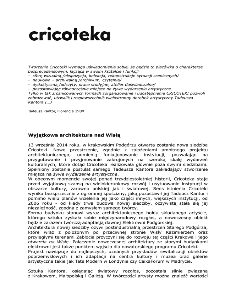 Tworzenie Cricoteki wymaga uświadomienia sobie, że będzie to placówka o charakterze bezprecedensowym, łącząca w swoim kształcie i funkcji - sferę wizualną /ekspozycja, kolekcja, rekonstrukcje sytuacji scenicznych/ - naukowo – archiwalną /archiwum, czytelnia/ - dydaktyczną /odczyty, prace studyjne, atelier doświadczalne/ - pozostawiając równocześnie miejsce na żywe wydarzenia artystyczne. Tylko w tak zróżnicowanych formach zorganizowanie i udostępnienie CRICOTEKI pozwoli zobrazować, utrwalić i rozpowszechnić wielostronny dorobek artystyczny Tadeusza Kantora (…) Tadeusz Kantor, Florencja 1980 Wyjątkowa architektura nad Wisłą 13 września 2014 roku, w krakowskim Podgórzu otwarta zostanie nowa siedziba Cricoteki. Nowe przestrzenie, zgodnie z założeniami ambitnego projektu architektonicznego, odmienią funkcjonowanie instytucji, pozwalając na przygotowanie i przyjmowanie zakrojonych na szeroką skalę wydarzeń kulturalnych, które dotąd Cricoteka realizowała głównie poza swymi siedzibami. Spełniony zostanie postulat samego Tadeusza Kantora zakładający stworzenie miejsca na żywe wydarzenie artystyczne. W obecnym momencie swojej ponad trzydziestoletniej historii, Cricoteka staje przed wyjątkową szansą na wielokierunkowy rozwój i usytuowanie instytucji w obszarze kultury, zarówno polskiej jak i światowej. Sens istnienia Cricoteki wynika bezsprzecznie z ogromnej spuścizny, jaką pozostawił jej Tadeusz Kantor i pomimo wielu planów wcielenia jej jako części innych, większych instytucji, od 2006 roku - od kiedy trwa budowa nowej siedziby, oczywistą stała się jej niezależność, zgodna z zamysłem samego twórcy. Forma budynku stanowi wyraz architektonicznego hołdu składanego artyście, którego sztuka zyskała sobie międzynarodowy rozgłos, a nowoczesny obiekt będzie zarazem twórczą adaptacją dawnej Elektrowni Podgórskiej. Architektura nowej siedziby ożywi postindustrialną przestrzeń Starego Podgórza, które wraz z położonym po przeciwnej stronie Wisły Kazimierzem oraz przyległymi terenami Zabłocia przyczyni się do rozwoju tej części Krakowa i jego otwarcia na Wisłę. Połączenie nowoczesnej architektury ze starymi budynkami elektrowni jest także punktem wyjścia dla nowatorskiego programu Cricoteki. Projekt nawiązuje do najlepszych, uznanych przykładów rewitalizacji obiektów poprzemysłowych i ich adaptacji na centra kultury i muzea oraz galerie artystyczne takie jak Tate Modern w Londynie czy CaixaForum w Madrycie. Sztuka Kantora, osiągając światowy rozgłos, pozostała silnie związaną z Krakowem, Małopolską i Galicją. W twórczości artysty można znaleźć wartości uniwersalne a zaraz silny jest jej rodowód wywodzący się z historii i dziedzictwa kulturowego Polski. Znaczenie dzieła Tadeusza Kantora stawia go pośród najwybitniejszych twórców naszego kraju. Unikatowa kolekcja Założona w 1980 roku przez Tadeusza Kantora instytucja, pełniąca równolegle funkcje muzeum, archiwum, galerii i ośrodka badań, posiada unikatowe zbiory związane z osobą artysty. Dysponując tym niepowtarzalnym zbiorem eksponatów oraz zapleczem merytorycznym, w kraju i za granicą Cricoteka organizuje wystawy, sympozja, spektakle, warsztaty, spotkania, wydaje wydawnictwa dedykowane sztuce Tadeusza Kantora. W każdym z elementów realizowanego programu staramy się znaleźć nawiązanie do historii i tradycji istniejącej ponad 30 lat Cricoteki. Ta wszechstronna działalność pokazuje jak wielki wpływ wywiera i jakie zainteresowanie budzi sama postać artysty i jego dokonania. Inspirując się postawą artystyczną Tadeusza Kantora tworzona jest nowa koncepcja programowa Cricoteki na kolejne lata. Wzory czerpane są z doświadczeń podobnych - dedykowanych jednemu artyście - instytucji, ale także z przedsięwzięć prezentujących dorobek Tadeusza Kantora w rozmaitych formach i kontekstach. Punktem odniesienia dla naszych działań pozostają zrealizowane kolejno w 2005 i 2007 roku wystawy Teatr Niemożliwy1 i Teatr bez teatru2. Umieściły one artystę pośród najwybitniejszych reformatorów sztuki i teatru XX wieku, a także zderzyły jego sztukę z działaniami współczesnych artystów. Inne spojrzenie na spuściznę Tadeusza Kantora zaprezentowane zostało podczas konferencji poświęconej marionetkom w Institut International de la Marionette w Charleville-Mézières w 2011 roku. Podkreślała ona rolę Kantora jako artysty kontynuującego poszukiwania Gordona Edwarda Craiga i ich wpływ na współczesny teatr, rozszerzając pola potencjalnych możliwości kreowania multidyscyplinarnego programu Cricoteki. Tadeusz Kantor i współcześni Dzięki kilkuletnim przygotowaniom, w nowej siedzibie wyróżnione zostały dwa główne nurty działań: pierwszy - związany z prezentacją twórczości Tadeusza Kantora oraz drugi - ukazujący jej wpływ na współczesną sztukę i teatr. Projekty zapowiadające nową drogę Cricoteki prezentowano już w 2012 i 2013 roku. Działania performatywne, realizowane w ramach projektów Radykalne języki, Muzeum migrujące, The Book Lovers, Kto inspiruje? Tadeusz Kantor! w niekonwencjonalny sposób wchodziły w dialog z twórczością Tadeusza Kantora, starając się w działaniach współczesnych artystów odnaleźć punkty z nią wspólne. Koncepcja projektów w formie serii działań na styku różnych form sztuki, zakładała nowatorskie podejście do reinterpretacji dzieła artysty. Przez kilka ostatnich lat dzięki międzynarodowym projektom, Cricoteka nawiązała 1 Wystawa The Impossible Theater zrealizowana przez wiedeńską Kunsthalle, Narodową Galerię Sztuki Zachęta i Barbican Center w Londynie w latach 2005-2006, kuratorkami wystawy były Hanna Wróblewska i Sabine Folie. 2 Wystawa A Theater without Theater prezentowana w 2007 i 2008 roku w MACBA Barcelona i Museu Berardo de Lisboa, której kuratorami byli Bernard Blistene i Yann Chateigné Tytelmann. współpracę