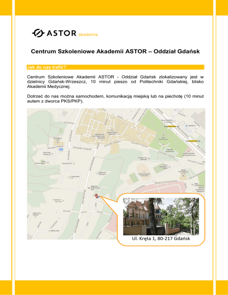 Centrum Szkoleniowe Akademii ASTOR – Oddział Gdańsk Jak do nas trafić? Centrum Szkoleniowe Akademii ASTOR - Oddział Gdańsk zlokalizowany jest w dzielnicy Gdańsk-Wrzeszcz, 10 minut pieszo od Politechniki Gdańskiej, blisko Akademii Medycznej. Dotrzeć do nas można samochodem, komunikacją miejską lub na piechotę (10 minut autem z dworca PKS/PKP). Ul. Kręta 1, 80-217 Gdańsk Polecane hotele Hotel Beethoven ul. Ludwika Beethovena 7, 80-171 Gdańsk Tel. 506 342 669 lub 058 710 22 77 E-mail: [email protected] Strona: www.hotelbeethoven.pl • śniadanie w pokoju • internet Wi-Fi bezpłatny • bezpłatny parking prywatny • pakiety lunchowe, wypożyczalnia samochodów, całodobowa recepcja, przechowalnia bagażu • 20 minut pieszo od Akademii ASTOR Willa Fahrenheita Ul. Daniela Fahrenheita 3, 80-001 Gdańsk Tel. 058 345 57 67 E-mail: [email protected] Strona: www.willagdansk.pl • monitorowany prywatny parking i budynek • w cenę pokoju wliczone śniadanie w postaci bufetu • bezprzewodowy internet • obok restauracja włoska – goście otrzymują 10% rabatu lub obiad – oferta cateringowa w hotelu • 15 minut pieszo od Akademii ASTOR QUBUS HOTEL Gdańsk **** ul. Chmielna 47-52, 80-748 Gdańsk tel.: +48 58 752 2 100 fax: +48 58 752 2 200 Central Reservation: +48 71 782 8 765 e-mail: [email protected] strona: www.qubushotel.com • centrum fitness, sauna fińską i pokój relaksacyjny • sprzęt RTV, bezpłatny dostęp do Internetu • łazienka z wanną lub kabiną prysznicową • restauracja Hotel Orbis Posejdon Gdańsk Ul. Kapliczna 30, 80-341 Gdańsk Tel. 058 511 30 00 E-mail: [email protected] Strona: www.accorhotels.com/pl/hotel-3391hotel-orbis-posejdon-gdansk/index.shtml • rekreacja: bilard, sauna, centrum fitness, spa, masaż, kryty basen, lokalizacja przy plaży, wypożyczalnia rowerów, plac zabaw dla dzieci • bar, śniadanie w pokoju, restauracja • internet Wi-Fi bezpłatny • parking prywatny jest dostępny na miejscu w cenie 35 PLN za dzień • całodobowa recepcja, przechowalnia bagażu • 15 min autem od Akademii ASTOR Hotel Amber*** ul. Powstańców Warszawskich 45, 80-165 Gdańsk Tel. +48 (58) 718 718 7 / fax +48 (58) 712 85 84 e-mail: [email protected] strona: www.amber-hotel.pl • ceny zawierają śniadanie i parking • oferujemy usługi transportowe oraz wynajem samochodów • w obrębie hotelu: restauracja, SPA • pokoje z łazienką, wyposażone w TV LCD, telefon, Internet bezprzewodowy lub kablowy, lodówkę • 15 minut pieszo od Akademii ASTOR Hotelik Bach ul. Jana Sebastiana Bacha 4, 90-178 Gdańsk Tel. 784 807 496 E-mail: [email protected] Strona: www.hotelikbach.pl • aneks kuchenny • internet Wi-Fi • posiłki za dodatkową opłatą • możliwość dostawek • 15 minut pieszo od Akademii ASTOR Radisson Blu Hotel ul. Długi Targ 19, 80-828 Gdańsk tel. +48 58 325 4444 faks: +48 58 325 4455 e-mail: [email protected] strona: www.radissonblu.com • bezpłatny Internet • usługa Room Service • klub fitness • apartamenty • akceptujemy zwierzęta Hotel Novotel Gdańsk Marina Ul. Jelitkowska 20, 80-342 Gdańsk Tel. 058 558 91 00 E-mail: [email protected] Strona: www.accorhotels.com/pl/hotel-3375-novotelgdansk-marina/index.shtml • kort tenisowy, sauna, centrum fitness, masaż, kryty basen, wypożyczalnia rowerów, plac zabaw • restauracja, bar • internet Wi-Fi bezpłatny • parking prywatny jest dostępny na miejscu w cenie 40 PLN za dzień • całodobowa recepcja, przechowalnia bagażu • 15 min autem od Akademii ASTOR