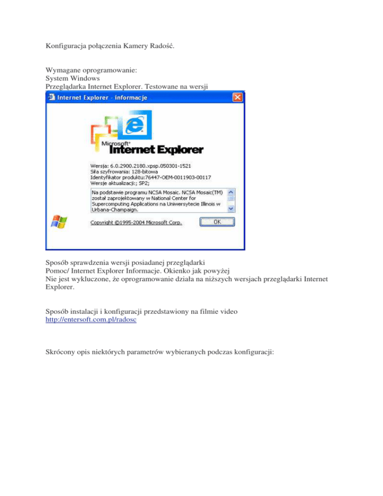 Konfiguracja poł czenia Kamery Rado . Wymagane oprogramowanie: System Windows Przegl darka Internet Explorer. Testowane na wersji Sposób sprawdzenia wersji posiadanej przegl darki Pomoc/ Internet Explorer Informacje. Okienko jak powy ej Nie jest wykluczone, e oprogramowanie działa na ni szych wersjach przegl darki Internet Explorer. Sposób instalacji i konfiguracji przedstawiony na filmie video http://entersoft.com.pl/radosc Skrócony opis niektórych parametrów wybieranych podczas konfiguracji: Rys.1 Prawym przyciskiem myszy wybieramy Zainstaluj format Activex Czekamy kilka sekund. Po pojawieniu si komunikatu Wybieramy przycisk Zainstaluj Czekamy kilka sekund a do momentu osi gni cia 100% instalacji Czekamy kilka sekund po zako czeniu instalacji (po przej ciu do 100%). Je li po klikni ciu przycisku Play . Pojawi si komunikat Potwierdzamy OK., a nast pnie naciskamy przycisk od wie na pasku narz dzi Internet Explorer lub klawisz F5 na klawiaturze. Nast pnie naciskamy przycisk PLAY. W przypadku poprawnie przeprowadzonej instalacji pojawi si w tym momencie okno do wprowadzenia danych autoryzacyjnych Wprowadzamy Nazw i Hasło dostarczone przez dyrekcj przedszkola Rado . W przypadku pojawienia si komunikatu Klikamy na ikon kamera i z menu wybieramy i zaznaczamy kamer , nast pnie klikamy PLAY.