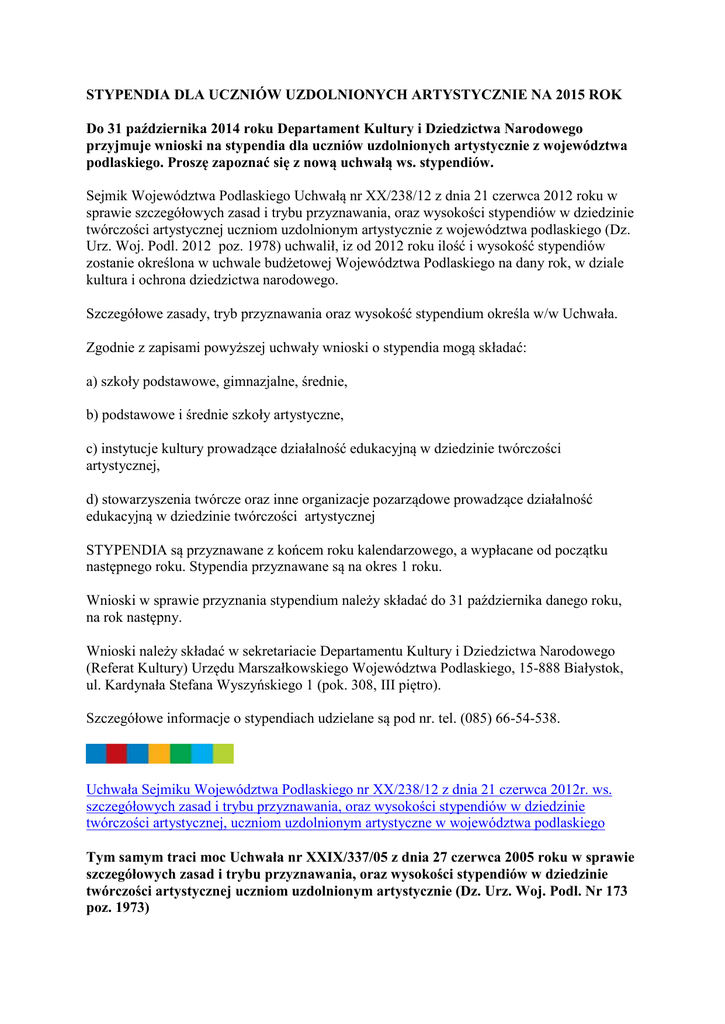STYPENDIA DLA UCZNIÓW UZDOLNIONYCH ARTYSTYCZNIE NA 2015 ROK Do 31 października 2014 roku Departament Kultury i Dziedzictwa Narodowego przyjmuje wnioski na stypendia dla uczniów uzdolnionych artystycznie z województwa podlaskiego. Proszę zapoznać się z nową uchwałą ws. stypendiów. Sejmik Województwa Podlaskiego Uchwałą nr XX/238/12 z dnia 21 czerwca 2012 roku w sprawie szczegółowych zasad i trybu przyznawania, oraz wysokości stypendiów w dziedzinie twórczości artystycznej uczniom uzdolnionym artystycznie z województwa podlaskiego (Dz. Urz. Woj. Podl. 2012 poz. 1978) uchwalił, iz od 2012 roku ilość i wysokość stypendiów zostanie określona w uchwale budżetowej Województwa Podlaskiego na dany rok, w dziale kultura i ochrona dziedzictwa narodowego. Szczegółowe zasady, tryb przyznawania oraz wysokość stypendium określa w/w Uchwała. Zgodnie z zapisami powyższej uchwały wnioski o stypendia mogą składać: a) szkoły podstawowe, gimnazjalne, średnie, b) podstawowe i średnie szkoły artystyczne, c) instytucje kultury prowadzące działalność edukacyjną w dziedzinie twórczości artystycznej, d) stowarzyszenia twórcze oraz inne organizacje pozarządowe prowadzące działalność edukacyjną w dziedzinie twórczości artystycznej STYPENDIA są przyznawane z końcem roku kalendarzowego, a wypłacane od początku następnego roku. Stypendia przyznawane są na okres 1 roku. Wnioski w sprawie przyznania stypendium należy składać do 31 października danego roku, na rok następny. Wnioski należy składać w sekretariacie Departamentu Kultury i Dziedzictwa Narodowego (Referat Kultury) Urzędu Marszałkowskiego Województwa Podlaskiego, 15-888 Białystok, ul. Kardynała Stefana Wyszyńskiego 1 (pok. 308, III piętro). Szczegółowe informacje o stypendiach udzielane są pod nr. tel. (085) 66-54-538. Uchwała Sejmiku Województwa Podlaskiego nr XX/238/12 z dnia 21 czerwca 2012r. ws. szczegółowych zasad i trybu przyznawania, oraz wysokości stypendiów w dziedzinie twórczości artystycznej, uczniom uzdolnionym artystyczne w województwa podlaskiego Tym samym traci moc Uchwała nr XXIX/337/05 z dnia 27 czerwca 2005 roku w sprawie szczegółowych zasad i trybu przyznawania, oraz wysokości stypendiów w dziedzinie twórczości artystycznej uczniom uzdolnionym artystycznie (Dz. Urz. Woj. Podl. Nr 173 poz. 1973)