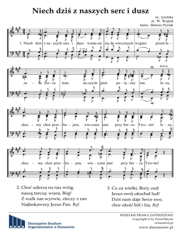 Niech dziś z naszych serc i dusz ### 3 j & 4œ J j œj œj œœ œ œ J J J 1. Niech dziś z na - szych serc i j j œj j j œ œ. ? ### 3 œ œ œœ œ œ œ. 4J J J J J & ### j œœ œœ .. J œ. #œ. zu - ? ### œ . œ. & ### œ. œ. chce - ? ### œ . œ. ### œ . & œ. chce ? ### œ . œ. j œj œj ˙ œœ œ œ ˙ J J J sa Ser - ca tron; j œj œj # ˙ œ œ ˙ J J Jœ j j œ . œj j j ˙œ œ œœ œœ œ . œ œœ œœ ˙œ œ J J J J J dusz wznie-sie się do wie-cznych wzgórz j j œ . œj j j œ œ œ œ #œ œ œ œ œ œ œ œ ˙ J J œ . œ Jœ Jœ J j j œj œ œœ œœ œ œ J J J my choć prze - bo j j œj œœ œœ œ œœ J J J - jem, œœ œœ j œœ œœj œœj J J J - m.: tyrolska sł.: W. Wojtoń harm.: Bartosz Pyziak œœ œœ j œj œœ œ J J na -szych j œj nœ œ J Jœ pień j j œ œœ J J œœ . . œœ œ. œ. wie-cznie stać j j œœ œœ J J my choć prze - bo - jem, j j j œ œ œ œ œ œ J J J œœ .. œœ 2. Choć uderza na nas wróg, naszą tarczą: wiara, Bóg! Z walk nas wyrwie, zleczy z ran Najłaskawszy Jezus Pan. Ref. œœ .. r j . œ œ œ. n œ . Rœ œ . J r œœ œ . R œ. wie - cznie stać j œ nœ.. J j œœ J j œ œ J j j œœ # # œœ J J po - tę - żny j œœ J ˙œ j j œœ # œœ J J przed Je - j œ nœ J j j œœ œœ J J Refren U œ ton. j œ œ J j œ œ J j œœ J j œœ œœ J œ œ Je - zu, œ œ j œœ J œ j œ. œ. J u przy Ser - cu Two - im! j œœ J j œœ J j œœ J j œœ œ J j œr œ œœ . . œ œ J R j œ œ J j œ œ J r œœ R r œœ R Je - zu, j œœ . J. œœ œ œ Œ przy Ser - cu Two-im! j œ œ J j œœ . œœr œœ J. R œ œ Œ 3. Co za wielki, Boży cud: Jezus swój ukochał lud! Dziś nam daje Serce swe, chce ukoić ból i łzę. Ref. WSZELKIE PRAWA ZASTRZEŻONE Copyright © by Paweł Bazan [email protected] www.dsorzeszow.pl