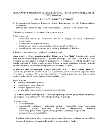 REGULAMIN II MIĘDZYSZKOLNEGO KONKURSU HISTORYCZNEGO DLA SZKÓŁ PODSTAWOWYCH „MALI POLACY, WIELCY PATRIOCI!” 1. Organizatorami konkursu Publiczna Szkoła Podstawowa im. K. Makuszyńskiego w Natolinie. Patronat nad konkursem objął Wójt Gminy Jedlnia – Letnisko –Piotr Leśnowolski. 2. Konkurs adresowany do uczniów szkół podstawowych. 3. Cele konkursu: zachęcenie dzieci do poznawania historii i tradycji związanej z symbolami narodowymi, rozbudzanie uczuć patriotycznych, kształtowanie postaw szacunku dla polskich symboli narodowych, umożliwienie zaprezentowania się uczniów w środowisku lokalnym. 4. Konkurs przeprowadzany będzie w trzech kategoriach: a) test wiedzy - „Czasy stanisławowskie i Konstytucja 3-go Maja” składający się z pytań zamkniętych jednokrotnego wyboru i 1 pytania otwartego. Czas testu - 60 minut. Zakres wymagań zgodny będzie z podstawą programową obowiązującą w szkole podstawowej. Szkoły zgłaszają do finału trzech uczniów, którzy na etapie szkolnym uzyskali najlepsze wyniki. Eliminacje szkolne szkoły organizują we własnym zakresie. b) konkurs prac plastycznych –motyw przewodni prac: „3 Maja oczami dziecka!”, skierowany głównie dla uczniów klas 0-3. Zapraszamy jednak wszystkich chętnych. Prace wykonane w formacie A3 w dowolnej technice. Tematyka prac powinna być związana z najważniejszymi miejscami i symbolami naszej Ojczyzny. Kryteria oceny: trafność doboru tematu pracy, oryginalność i pomysłowość, estetyka wykonania pracy, walory artystyczne: kompozycja, gama kolorystyczna c) konkurs poezji patriotycznej - recytacja wybranego utworu poetyckiego związanego ze Świętem Flagi Państwowej i Świętem Konstytucji 3-go Maja. Kryteria oceny: dobór repertuaru, umiejętność swobodnej i naturalnej recytacji (wyrazistość głosu, poprawność wymowy, tempo mówienia, frazowanie, akcentowanie, intonacja i modulacja głosu, mimika i gestykulacja, postawa i ekspresja całego ciała), pamięciowe opanowanie tekstu. Każda ze zgłoszonych szkół organizuje wewnętrzne eliminacje konkursu recytatorskiego i wyłoni 1-3 najlepszych uczestników, którzy wezmą udział w finale. 5. Warunkiem przystąpienia do konkursu jest zgłoszenie szkoły w terminie do 13 kwietnia 2015r. Zgłoszenia można dokonywać przesyłając formularz zgłoszeniowy: listownie – na adres Publicznej Szkoły Podstawowej im. K. Makuszyńskiego w Natolinie, 26-613 Radom 15 pocztą elektroniczną – na adres: [email protected] 6. Terminarz konkursu: zgłoszenie szkół do konkursu do 13 kwietnia 2015r. nadesłanie prac plastycznych do 20 kwietnia 2015r. finał konkursu w kategorii wiedzy i kategorii recytatorskiej – 27 kwietnia 2015r. uroczysta gala – termin podany zostanie po ustaleniu z Panią Kierownik Wydziału Oświaty i Wychowania Gminy Jedlnia – Letnisko. 7. Finał konkursu odbędzie się w Publicznej Szkole Podstawowej w Natolinie. Organizator powoła komisje konkursowe dla każdej z kategorii, które wyłonią zwycięzców. Wyniki ogłoszone zostaną na uroczystej apelu, który odbędzie się 27 kwietnia 2015 roku w Publicznej Szkole Podstawowej im. K. Makuszyńskiego w Natolinie. Kontakt: Maria Trzos, Tel 603 649 483