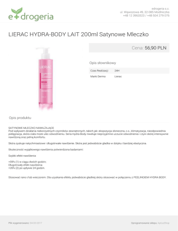 edrogeria s.c. ul. Wąwozowa 49, 32-085 Modlniczka +48 12 3963323 / +48 504 279 076 LIERAC HYDRA-BODY LAIT 200ml Satynowe Mleczko Cena: 56,90 PLN Opis słownikowy Czas Realizacji 24H Marki Dermo Lierac Opis produktu SATYNOWE MLECZKO NAWILŻAJĄCE Pod wpływem działania niekorzystnych czynników zewnętrznych, takich jak: ekspozycja słoneczna, c.o., klimatyzacja, nieodpowiednia pielęgnacja, skóra ciała może ulec odwodnieniu. Seria Hydra-Body niweluje nieprzyjemne uczucie odwodnienia i czyni skórę intensywnie nawilżoną oraz pełną komfortu. Skóra zyskuje natychmiastowe i długotrwałe nawilżenie. Skóra jest jedwabiście gładka w dotyku i bardziej elastyczna. Skuteczność wyjątkowego nawilżenia potwierdzona badaniami: Szybki efekt nawilżenia: +59% (1) w ciągu dwóch godzin; Długotrwały efekt nawilżenia +26% (2) po upływie 24 godzin. Stosować rano i/lub wieczorem. Dla uzyskania efektu jedwabiście gładkiej skóry stosować w połączeniu z PEELINGIEM HYDRA BODY. Plik wygenerowano: 04-03-2017 Powered by TCPDF (www.tcpdf.org) Oprogramowanie sklepu: AptusShop