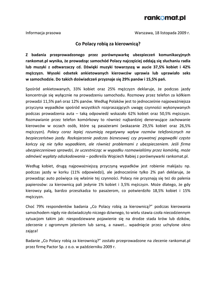 Informacja prasowa Warszawa, 18 listopada 2009 r. Co Polacy robią za kierownicą? Z badania przeprowadzonego przez porównywarkę ubezpieczeń komunikacyjnych rankomat.pl wynika, że prowadząc samochód Polacy najczęściej oddają się słuchaniu radia lub muzyki z odtwarzaczy cd. Dźwięki muzyki towarzyszą w aucie 37,5% kobiet i 42% mężczyzn. Wysoki odsetek ankietowanych kierowców uprawia lub uprawiało seks w samochodzie. Do takich doświadczeń przyznaje się 29% panów i 15,5% pań. Spośród ankietowanych, 33% kobiet oraz 25% mężczyzn deklaruje, że podczas jazdy koncentruje się wyłącznie na prowadzeniu samochodu. Rozmowy przez telefon za kółkiem prowadzi 11,5% pań oraz 12% panów. Według Polaków jest to jednocześnie najpoważniejsza przyczyna wypadków spośród wszystkich rozpraszających uwagę czynności wykonywanych podczas prowadzenia auta – taką odpowiedź wskazało 62% kobiet oraz 50,5% mężczyzn. Rozmawianie przez telefon komórkowy to również najbardziej denerwujące zachowanie kierowców w oczach osób, które są pasażerami (wskazanie 29,5% kobiet oraz 26,5% mężczyzn). Polacy coraz lepiej rozumieją negatywny wpływ rozmów telefonicznych na bezpieczeństwo jazdy. Rozkojarzenie podczas biznesowej czy prywatnej pogawędki często kończy się nie tylko wypadkiem, ale również problemami z ubezpieczeniem. Jeśli firma ubezpieczeniowa sprawdzi, że uczestnicząc w wypadku rozmawialiśmy przez komórkę, może odmówić wypłaty odszkodowania – podkreśla Wojciech Rabiej z porównywarki rankomat.pl. Według kobiet, drugą najpoważniejszą przyczyną wypadków jest robienie makijażu np. podczas jazdy w korku (11% odpowiedzi), ale jednocześnie tylko 2% pań deklaruje, że prowadząc auto poświęca się właśnie tej czynności. Polacy nie przyznają się też do palenia papierosów: za kierownicą pali jedynie 1% kobiet i 3,5% mężczyzn. Może dlatego, że gdy kierowcy palą, bardzo przeszkadza to pasażerom, co potwierdziło 18,5% kobiet i 15% mężczyzn. Choć 79% respondentów badania „Co Polacy robią za kierownicą?” podczas kierowania samochodem nigdy nie doświadczyło niczego dziwnego, to wielu stawia czoła niecodziennym sytuacjom takim jak: niespodziewane pojawienie się na drodze stada krów lub dzików, zderzenie z ogromnym jeleniem lub sarną, a nawet… wpadnięcie przez uchylone okno zająca! Badanie „Co Polacy robią za kierownicą?” zostało przeprowadzone na zlecenie rankomat.pl przez firmę Pactor Sp. z o.o. w październiku 2009 r.