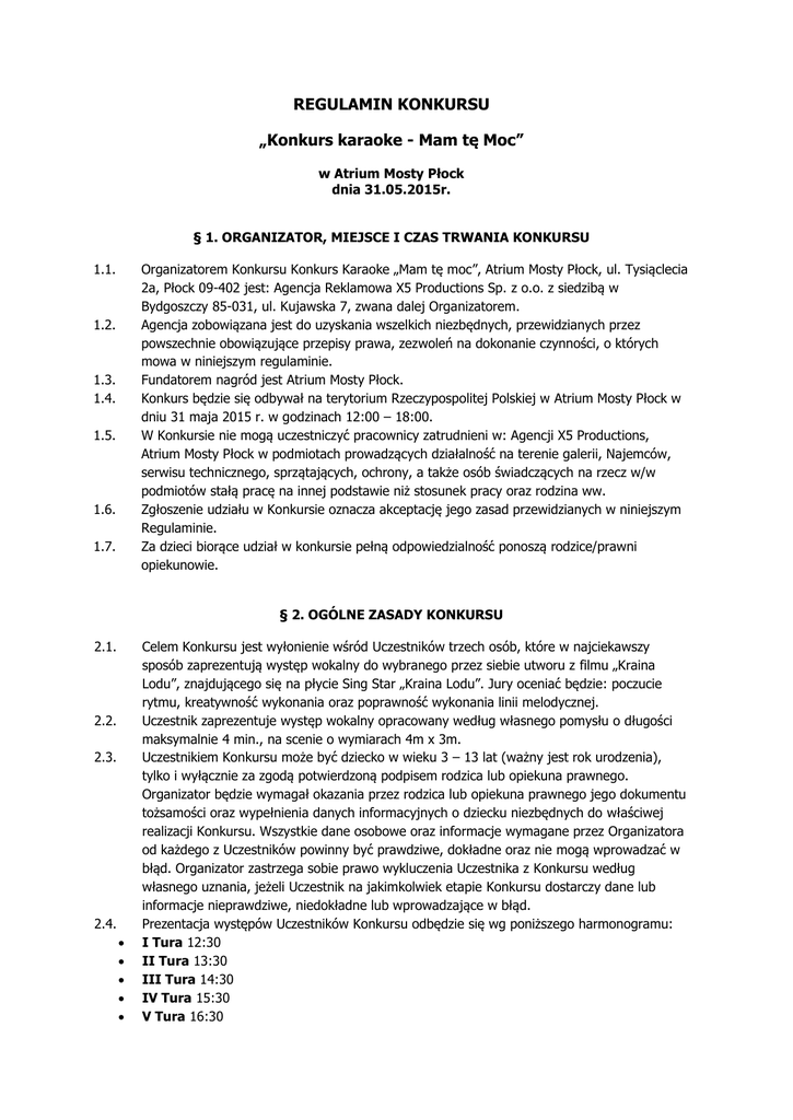 REGULAMIN KONKURSU „Konkurs karaoke - Mam tę Moc” w Atrium Mosty Płock dnia 31.05.2015r. § 1. ORGANIZATOR, MIEJSCE I CZAS TRWANIA KONKURSU 1.1. Organizatorem Konkursu Konkurs Karaoke „Mam tę moc”, Atrium Mosty Płock, ul. Tysiąclecia 2a, Płock 09-402 jest: Agencja Reklamowa X5 Productions Sp. z o.o. z siedzibą w Bydgoszczy 85-031, ul. Kujawska 7, zwana dalej Organizatorem. Agencja zobowiązana jest do uzyskania wszelkich niezbędnych, przewidzianych przez powszechnie obowiązujące przepisy prawa, zezwoleń na dokonanie czynności, o których mowa w niniejszym regulaminie. Fundatorem nagród jest Atrium Mosty Płock. Konkurs będzie się odbywał na terytorium Rzeczypospolitej Polskiej w Atrium Mosty Płock w dniu 31 maja 2015 r. w godzinach 12:00 – 18:00. W Konkursie nie mogą uczestniczyć pracownicy zatrudnieni w: Agencji X5 Productions, Atrium Mosty Płock w podmiotach prowadzących działalność na terenie galerii, Najemców, serwisu technicznego, sprzątających, ochrony, a także osób świadczących na rzecz w/w podmiotów stałą pracę na innej podstawie niż stosunek pracy oraz rodzina ww. Zgłoszenie udziału w Konkursie oznacza akceptację jego zasad przewidzianych w niniejszym Regulaminie. Za dzieci biorące udział w konkursie pełną odpowiedzialność ponoszą rodzice/prawni opiekunowie. 1.2. 1.3. 1.4. 1.5. 1.6. 1.7. § 2. OGÓLNE ZASADY KONKURSU 2.1. 2.2. 2.3. 2.4. Celem Konkursu jest wyłonienie wśród Uczestników trzech osób, które w najciekawszy sposób zaprezentują występ wokalny do wybranego przez siebie utworu z filmu „Kraina Lodu”, znajdującego się na płycie Sing Star „Kraina Lodu”. Jury oceniać będzie: poczucie rytmu, kreatywność wykonania oraz poprawność wykonania linii melodycznej. Uczestnik zaprezentuje występ wokalny opracowany według własnego pomysłu o długości maksymalnie 4 min., na scenie o wymiarach 4m x 3m. Uczestnikiem Konkursu może być dziecko w wieku 3 – 13 lat (ważny jest rok urodzenia), tylko i wyłącznie za zgodą potwierdzoną podpisem rodzica lub opiekuna prawnego. Organizator będzie wymagał okazania przez rodzica lub opiekuna prawnego jego dokumentu tożsamości oraz wypełnienia danych informacyjnych o dziecku niezbędnych do właściwej realizacji Konkursu. Wszystkie dane osobowe oraz informacje wymagane przez Organizatora od każdego z Uczestników powinny być prawdziwe, dokładne oraz nie mogą wprowadzać w błąd. Organizator zastrzega sobie prawo wykluczenia Uczestnika z Konkursu według własnego uznania, jeżeli Uczestnik na jakimkolwiek etapie Konkursu dostarczy dane lub informacje nieprawdziwe, niedokładne lub wprowadzające w błąd. Prezentacja występów Uczestników Konkursu odbędzie się wg poniższego harmonogramu: I Tura 12:30 II Tura 13:30 III Tura 14:30 IV Tura 15:30 V Tura 16:30 VI Tura 17:30 Podczas eventu „Kraina Lodu” 31 maja 2015r. w Atrium Mosty Płock 2.5. Aby wystąpić podczas jednego z 6 przewidzianych w konkursie tur należy zgłosić się wraz z rodzicem/ prawnym opiekunem do hostessy przy scenie w poniższych przedziałach czasowych: Aby wziąć udział w Turze I : 12:00 -12:25 Aby wziąć udział w Turze II : 13:00 - 13:25 Aby wziąć udział w Turze III : 14:00 -14:25 Aby wziąć udział w Turze IV : 15:00 -15:25 Aby wziąć udział w Turze V : 16:00 - 16:25 Aby wziąć udział w Turze VI : 17:00 -17:25 oraz podać niezbędne dane teleadresowe Uczestnika Konkursu. 2.6. 2.7. 2.8. 2.9. 2.10. W każdej turze wziąć może udział maksymalnie 8 Uczestników. O możliwości wystąpienia w każdej turze konkursu decydować będzie kolejność zgłoszenia. Kolejność Występów Uczestników w ramach jednej tury ustala Organizator. Zwycięzców konkursu wyłoni Jury w składzie: Przedstawiciel Organizatora (Event Manager), Przedstawiciel Atrium Mosty Płock oraz Animator Prowadzący. Jeden Uczestnik ma prawo tylko raz wziąć udział w konkursie. Każdy z Rodziców/ Prawnych opiekunów Uczestników Konkursu wyraża zgodę na opublikowanie imienia i nazwiska oraz zdjęcia zawierającego wizerunek swojego dziecka/podopiecznego na stronie internetowej http://atrium-mosty.pl/, na profilu Atrium Mosty Płock, na facebooku oraz we wszelkich relacjach publikowanych po evencie. § 3. NAGRODY 2.1. Nagrodami w konkursie są: 3x zestaw nagród: 2.2. Lalka Elsa 28cm, puzzle 100 elementów Frozen, plecak Olaf 31cm, ręcznik kąpielowy Anna i Elsa 70x140cm Nagrody zostaną przyznane w 3 Finałach konkursu: Finał I – godz. 14:00 Nagroda zostanie przyznana osobie wyłonionej spośród Uczestników, którzy wzięli udział w Turze I i Turze II Finał II - godz. 16:00 Nagroda zostanie przyznana osobie wyłonionej spośród Uczestników, którzy wzięli udział w Turze III i Turze IV Finał III – 17:50 Nagroda zostanie przyznana osobie wyłonionej spośród Uczestników, którzy wzięli udział w Turze V i Turze VI 3.3. Przed każdym Finałem przedstawiciel organizatora przygotuje listę 6 Finalistów, którzy w najciekawszy sposób wykonali wybrany przez siebie utwór wg. zasad wymienionych w § 2. niniejszego regulaminu, przy czym występ Uczestnika, któremu został nadany numer 1 na Liście Finalistów został oceniony, jako najlepszy. 3.4. Nagrody zostaną przyznane bezpośrednio po ogłoszeniu wyników. 3.5. Wartość żadnej z nagród nie przekracza 200zł. 3.6. Prawa do nagrody nie można przenieść na osobę trzecią. 3.7. Organizator zastrzega sobie prawo do zmian zasad przyznawania nagród w konkursie. 3.8. Warunkiem odbioru nagrody jest: a) osobista obecność Zwycięzcy wraz z rodzicem/prawnym opiekunem podczas ogłoszenia wyników oraz okazanie przez rodzica/prawnego opiekuna dokumentu potwierdzającego jego tożsamość. Nazwisko każdego Zwycięzcy wywołane zostanie 3 razy. W przypadku nieobecności wyczytanego trzykrotnie Uczestnika Zwycięzcą zostaje kolejny na liście Finalistów Uczestnik konkursu. b) podpisanie przez rodzica/prawnego opiekuna Zwy