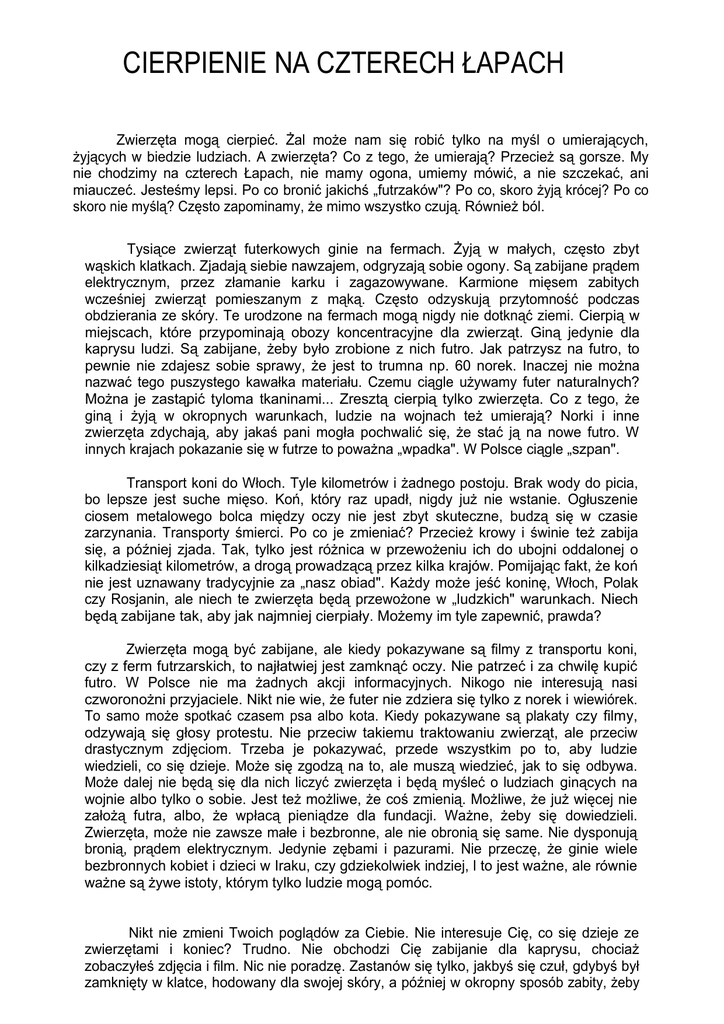 CIERPIENIE NA CZTERECH ŁAPACH Zwierzęta mogą cierpieć. Żal może nam się robić tylko na myśl o umierających, żyjących w biedzie ludziach. A zwierzęta? Co z tego, że umierają? Przecież są gorsze. My nie chodzimy na czterech Łapach, nie mamy ogona, umiemy mówić, a nie szczekać, ani miauczeć. Jesteśmy lepsi. Po co bronić jakichś „futrzaków"? Po co, skoro żyją krócej? Po co skoro nie myślą? Często zapominamy, że mimo wszystko czują. Również ból. Tysiące zwierząt futerkowych ginie na fermach. Żyją w małych, często zbyt wąskich klatkach. Zjadają siebie nawzajem, odgryzają sobie ogony. Są zabijane prądem elektrycznym, przez złamanie karku i zagazowywane. Karmione mięsem zabitych wcześniej zwierząt pomieszanym z mąką. Często odzyskują przytomność podczas obdzierania ze skóry. Te urodzone na fermach mogą nigdy nie dotknąć ziemi. Cierpią w miejscach, które przypominają obozy koncentracyjne dla zwierząt. Giną jedynie dla kaprysu ludzi. Są zabijane, żeby było zrobione z nich futro. Jak patrzysz na futro, to pewnie nie zdajesz sobie sprawy, że jest to trumna np. 60 norek. Inaczej nie można nazwać tego puszystego kawałka materiału. Czemu ciągle używamy futer naturalnych? Można je zastąpić tyloma tkaninami... Zresztą cierpią tylko zwierzęta. Co z tego, że giną i żyją w okropnych warunkach, ludzie na wojnach też umierają? Norki i inne zwierzęta zdychają, aby jakaś pani mogła pochwalić się, że stać ją na nowe futro. W innych krajach pokazanie się w futrze to poważna „wpadka". W Polsce ciągle „szpan". Transport koni do Włoch. Tyle kilometrów i żadnego postoju. Brak wody do picia, bo lepsze jest suche mięso. Koń, który raz upadł, nigdy już nie wstanie. Ogłuszenie ciosem metalowego bolca między oczy nie jest zbyt skuteczne, budzą się w czasie zarzynania. Transporty śmierci. Po co je zmieniać? Przecież krowy i świnie też zabija się, a później zjada. Tak, tylko jest różnica w przewożeniu ich do ubojni oddalonej o kilkadziesiąt kilometrów, a drogą prowadzącą przez kilka krajów. Pomijając fakt, że koń nie jest uznawany tradycyjnie za „nasz obiad". Każdy może jeść koninę, Włoch, Polak czy Rosjanin, ale niech te zwierzęta będą przewożone w „ludzkich" warunkach. Niech będą zabijane tak, aby jak najmniej cierpiały. Możemy im tyle zapewnić, prawda? Zwierzęta mogą być zabijane, ale kiedy pokazywane są filmy z transportu koni, czy z ferm futrzarskich, to najłatwiej jest zamknąć oczy. Nie patrzeć i za chwilę kupić futro. W Polsce nie ma żadnych akcji informacyjnych. Nikogo nie interesują nasi czworonożni przyjaciele. Nikt nie wie, że futer nie zdziera się tylko z norek i wiewiórek. To samo może spotkać czasem psa albo kota. Kiedy pokazywane są plakaty czy filmy, odzywają się głosy protestu. Nie przeciw takiemu traktowaniu zwierząt, ale przeciw drastycznym zdjęciom. Trzeba je pokazywać, przede wszystkim po to, aby ludzie wiedzieli, co się dzieje. Może się zgodzą na to, ale muszą wiedzieć, jak to się odbywa. Może dalej nie będą się dla nich liczyć zwierzęta i będą myśleć o ludziach ginących na wojnie albo tylko o sobie. Jest też możliwe, że coś zmienią. Możliwe, że już więcej nie założą futra, albo, że wpłacą pieniądze dla fundacji. Ważne, żeby się dowiedzieli. Zwierzęta, może nie zawsze małe i bezbronne, ale nie obronią się same. Nie dysponują bronią, prądem elektrycznym. Jedynie zębami i pazurami. Nie przeczę, że ginie wiele bezbronnych kobiet i dzieci w Iraku, czy gdziekolwiek indziej, l to jest ważne, ale równie ważne są żywe istoty, którym tylko ludzie mogą pomóc. Nikt nie zmieni Twoich poglądów za Ciebie. Nie interesuje Cię, co się dzieje ze zwierzętami i koniec? Trudno. Nie obchodzi Cię zabijanie dla kaprysu, chociaż zobaczyłeś zdjęcia i film. Nic nie poradzę. Zastanów się tylko, jakbyś się czuł, gdybyś był zamknięty w klatce, hodowany dla swojej skóry, a później w okropny sposób zabity, żeby zwierzę mogło uszyć z Ciebie płaszcz. Mamy szczęście, że umieramy we własnych skórach i że nie jesteśmy przewożeni w ciasnych ciężarówkach; bez jedzenia, bez picia, bez powietrza. Aby na koniec obudzić się podczas zarzynania. Dommi JAKIE FUTRO PODAĆ ZŁAPANE W SIDŁA, ZAGAZOWANE, CZY PORAŻONE PRĄDEM? www.Twijawil»ci.pl POKOCHAJ FUTRZAKI NIE KUPUJ ICH ŚMIERĆ!!