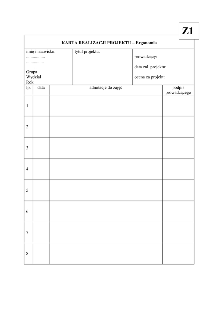 Z1 KARTA REALIZACJI PROJEKTU – Ergonomia imię i nazwisko: ................. ................ ................ Grupa Wydział Rok lp. data 1 2 3 4 5 6 7 8 tytuł projektu: prowadzący: data zal. projektu: ocena za projekt: adnotacje do zajęć podpis prowadzącego KARTA OPISU ŚRODOWISKA PRACY Z2 Oświetlenie Oświetlenie jest to stosowanie światła (promieniowania widzialnego) w celu uwidocznienia miejsc, obiektów lub ich otoczenia. Oświetlenie decyduje nie tylko o tym, jak widzimy otoczenie, ale również jak się w nim czujemy. Celem oświetlenia jest stworzenie takiego środowiska świetlnego, aby znajdujący się w nim człowiek mógł wykonywać prace wzrokową w sposób bezpieczny i efektywny przy jednoczesnym występowaniu wygody widzenia. Oświetlenie jest fizycznym czynnikiem środowiska pracy i jest zaliczane do czynników uciążliwych. Wynika to faktu, że niewłaściwe oświetlenie stanowisk pracy prowadzi do nadmiernego zmęczenia narządu wzroku, dolegliwości wzroku, spadku wydajności pracy oraz może powodować pogłębienie wad wzroku. Czynnik ten występuje na każdym stanowisku pracy, dlatego pracodawcy są zobowiązani do zapewnienia oświetlenia elektrycznego o parametrach zgodnych z polskimi normami, zgodnie z par 26 ust 2 Rozporządzenia ministra pracy i polityki socjalnej z dnia 26 września 1997 r. w sprawie ogólnych przepisów bezpieczeństwa i higieny pracy.(t.j.Dz. U. 2003 Nr 169 poz. 1650 ze zm.) . Dlatego istotnym jest aby zainstalowany system oświetleniowy spełniał wymagania zawarte w normie oświetleniowej PN-EN 12464-1:2004: Światło i oświetlenie. Oświetlenie miejsc pracy. Część 1: Miejsca pracy we wnętrzach. Opisać rodzaj zastosowanego oświetlenia I. a. dzienne (np. system oświetlenia górnego, za pomocą świetlików dachowych; system oświetlenia bocznego, za pomocą okien umieszczonych w ścianach itp.) b. sztuczne (np. miejscowe, punktowe, ogólne, mieszane itp.), podać rozmieszczenie źródeł światła w odniesieniu do analizowanego stanowiska pracy c. typ zastosowanych żarówek (lamp) Ocenić oświetlenie na omawianym stanowisku II. Czy zamontowane oświetlenie: a. zapewnienia bezpieczeństwo ludziom przebywającym w danym wnętrzu, b. zapewnienia odpowiednie warunki do wykonywania zadań wzrokowych, c. pomaga w kreowaniu właściwego otoczenia świetlnego? Mikroklimat Zasada wykonywania pomiarów mikroklimatu polega na zmierzeniu wielkości podstawowych i pochodnych parametrów fizycznych, w pomieszczeniach i miejscach przebywania pracownika w celu porównania z higienicznymi wymaganiami. Opisać mikroklimat na omawianym stanowisku I. a. Zastosowany rodzaj wentylacji b. Zastosowaną klimatyzację c. Wyciągi np. pary, pyłu itp. II. Ocenić mikroklimat na omawianym stanowisku (liczbowo*, słownie**) *jeżeli to możliwe podać wartości liczbowe uzyskane na podstawie pomiarów bezpośrednich lub danych z przedsiębiorstwa **na podstawie odczuć ta - temperatura powietrza [°C] RH - wilgotność względna powietrza [ % ] v - prędkość przepływu powietrza [m/s] OCENA UCIĄŻLIWOŚCI WYSIŁKU FIZYCZNEGO (metoda chronometrażowo-tabelaryczna wg Lehmanna) Z3 WIELKOŚĆ CAŁKOWITEGO WYDATKU ENERGETYCZNEGO Tabela 1. Normatywy cząstkowe wydatku energetycznego w zależności od pozycji ciała [Tytyk 2001] Pozycja ciała Wydatek energetyczny [kcal/min] [kJ/min] 0,3 1,2 0,5 2,1 0,5 2,1 0,6 2,5 0,8 3,3 1,7-3,5 7,1-14,6 0,75 na 1m wzniesienia 3,1 na 1m wzniesienia Siedząca Na kolanach Kuczna Stojąca Stojąca pochylona Chodzenie Chodzenie po pochyłości bez obciążenia Tabela 2. Normatywy cząstkowe wydatku energetycznego w zależności od wykonywanej pracy [Tytyk 2001] Rodzaj pracy Praca palców, dłoni i przedramienia Praca jednego ramienia Praca obu ramion Praca mięśni, kończyn, tułowia lekka średnia ciężka lekka średnia ciężka lekka średnia ciężka lekka średnia ciężka bardzo ciężka Wydatek energetyczny [kcal/min] [kJ/min] 0,3-0,6 1,2-2,5 0,6-0,9 2,5-3,8 0,9-1,2 3,8-5,5 0,7-1,2 2,9-5,0 1,2-1,7 5,0-7,0 1,7-2,2 7,0-9,2 1,5-2,0 6,3-8,4 2,0-2,5 8,4-10,5 2,5-3,0 10,5-12,6 2,5-4,0 10,5-16,7 4,0-6,0 16,7-25,0 6,0-8,5 25,0-35,5 8,5-11,5 35,5-48,0 Wielkość całkowitego wydatku energetycznego Wc [kJ/8h] obliczamy jako sumę wydatków energetycznych W3 dla wszystkich czynności w ciągu 8-godzinnej zmiany roboczej W3=(W1+W2)*t t –czas trwania danej czynności roboczej [min] W1 -wydatek energetyczny tab1. [kJ/min] W2 - wydatek energetyczny tab2. [kJ/min] W3 –wydatek energetyczny na daną czynność roboczą [kJ] Tabela 3. Ocena punktowa wydatku energetycznego Wydatek energetyczny [kJ/8h] Ocena wydatku energetycznego słowna punktowa od 1260 bardzo mały 0 1260 - 3350 mały 1 - 25 3350 - 6300 średni 25 - 50 6300 - 8400 duży 51 - 75 ponad 8400 bardzo duży 76 - 100 Z3 Tabela 4. Ocena stopnia obciążenia statycznego Ocena stopnia obciążenia Pozycja ciała przy pracy statycznego słownie punkty 1 - 10 siedząca niewymuszona mały 11 - 20 stojąca niewymuszona z możliwością 1 - 30 okresowej zmiany na siedzącą 21 - 30 siedząca lub stojąca na przemian z chodzeniem średni 31 - 40 siedząca wymuszona, niepochylona bądź 31 - 60 nieznacznie pochylona 41 - 50 stojąca niewymuszona, bez możliwości okresowej zmiany pozycji na siedzącą 51 - 60 duży 61 - 90 61 - 70 71 - 80 81 - 90 bardzo duży 91 - 100 91 - 100 Przykłady większość prac biurowych ślusarz, stolarz nadzór techniczny, bibliotekarz stojąca wymuszona, niepochylona z możliwością okresowej zmiany pozycji na siedzącą siedząca wymuszona, bardzo pochylona stojąca wymuszona, niepochylona bez możliwości okresowej zmiany pozycji na siedzącą stojąca wymuszona, pochylona, niezależnie od możliwości zmieniania pozycji kleczaca, w przysiadzie i inne nienaturalne pozycje pisanie na maszynie, obsługa pras mechanicznych obsługa niektórych obrabiarek, malowanie, lakierowanie, praca ekspedienta motorniczy, suwnicowy szwaczka, zegarmistrz pia