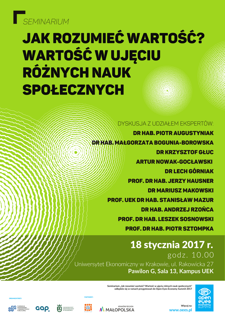 SEMINARIUM Jak rozumieć wartość? Wartość w ujęciu różnych nauk społecznych Dyskusja z udziałem ekspertów: dr hab. Piotr Augustyniak dr hab. Małgorzata Bogunia-Borowska dr Krzysztof Głuc Artur Nowak-Gocławski dr Lech Górniak prof. dr hab. Jerzy Hausner dr Mariusz Makowski prof. UEK dr hab. Stanisław Mazur dr hab. Andrzej Rzońca prof. dr hab. Leszek Sosnowski prof. dr hab. Piotr Sztompka 18 stycznia 2017 r. god z. 1 0 .0 0 Uniwersytet Ekonomiczny w Krakowie, ul. Rakowicka 27 Pawilon G, Sala 13, Kampus UEK Seminarium „Jak rozumieć wartość? Wartość w ujęciu różnych nauk społecznych" odbędzie się w ramach przygotowań do Open Eyes Economy Summit 2017 ORGANIZATORZY: PARTNERZY: Więcej na: www.oees.pl