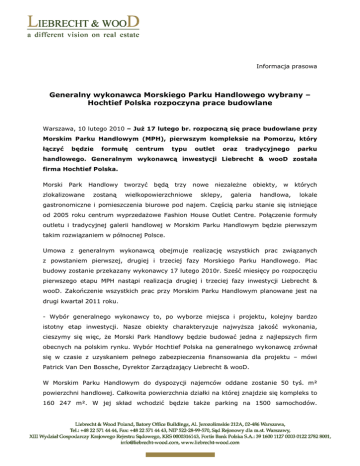 Informacja prasowa Generalny wykonawca Morskiego Parku Handlowego wybrany – Hochtief Polska rozpoczyna prace budowlane Warszawa, 10 lutego 2010 – JuŜ 17 lutego br. rozpoczną się prace budowlane przy Morskim Parku Handlowym (MPH), pierwszym kompleksie na Pomorzu, który łączyć będzie formułę centrum typu outlet oraz tradycyjnego parku handlowego. Generalnym wykonawcą inwestycji Liebrecht & wooD została firma Hochtief Polska. Morski Park zlokalizowane Handlowy zostaną tworzyć będą trzy wielkopowierzchniowe nowe niezaleŜne sklepy, galeria obiekty, w handlowa, których lokale gastronomiczne i pomieszczenia biurowe pod najem. Częścią parku stanie się istniejące od 2005 roku centrum wyprzedaŜowe Fashion House Outlet Centre. Połączenie formuły outletu i tradycyjnej galerii handlowej w Morskim Parku Handlowym będzie pierwszym takim rozwiązaniem w północnej Polsce. Umowa z generalnym wykonawcą obejmuje realizację wszystkich prac związanych z powstaniem pierwszej, drugiej i trzeciej fazy Morskiego Parku Handlowego. Plac budowy zostanie przekazany wykonawcy 17 lutego 2010r. Sześć miesięcy po rozpoczęciu pierwszego etapu MPH nastąpi realizacja drugiej i trzeciej fazy inwestycji Liebrecht & wooD. Zakończenie wszystkich prac przy Morskim Parku Handlowym planowane jest na drugi kwartał 2011 roku. - Wybór generalnego wykonawcy to, po wyborze miejsca i projektu, kolejny bardzo istotny etap inwestycji. Nasze obiekty charakteryzuje najwyŜsza jakość wykonania, cieszymy się więc, Ŝe Morski Park Handlowy będzie budować jedna z najlepszych firm obecnych na polskim rynku. Wybór Hochtief Polska na generalnego wykonawcę zrównał się w czasie z uzyskaniem pełnego zabezpieczenia finansowania dla projektu – mówi Patrick Van Den Bossche, Dyrektor Zarządzający Liebrecht & wooD. W Morskim Parku Handlowym do dyspozycji najemców oddane zostanie 50 tyś. m² powierzchni handlowej. Całkowita powierzchnia działki na której znajdzie się kompleks to 160 247 m². W jej skład wchodzić będzie takŜe parking na 1500 samochodów. Pierwszymi najemcami Morskiego Parku Handlowego zostali Carrefour (zajmie powierzchnię 8 412 m²) oraz OBI (powierzchnia najmu 10 975 m²). Komercjalizacją obiektu zajmuje się agencja CB Richard Ellis. Hochtief Polska wchodzi w skład międzynarodowego holdingu budowlanego Hochtief. Oferta firmy obejmuje m.in. wykonawstwo obiektów biurowych, handlowo-rozrywkowych i mieszkaniowych. Jedną z licznych realizacji Hochtief Polska była m.in. rozbudowa Fashion House Outlet Centre w Gdańsku. ### Liebrecht & wooD to flamandzka firma deweloperska, koncentrująca swe projekty na rynku polskim oraz rumuńskim. Jako jeden z niewielu deweloperów, Liebrecht & wooD zapewnia kompleksową obsługę w dziedzinie obrotu nieruchomościami, proponując budynki o wysokich walorach architektonicznych, które znalazły uznanie jurorów wielu europejskich konkursów. Realizacje firmy obejmują zarówno biura, jak i centra typu outlet, magazyny, obiekty handlowe oraz projekty pod klucz. Więcej informacji dla prasy: Imago Public Relations Marta Stach, Senior Account Manager, gsm: +48 609 808 119, e-mail: [email protected] tel.: +48 32/608 29 85 Paweł Loedl, Account Executive, gsm: +48 693 790 242, e-mail: [email protected] tel.: +48 32/608 29 85