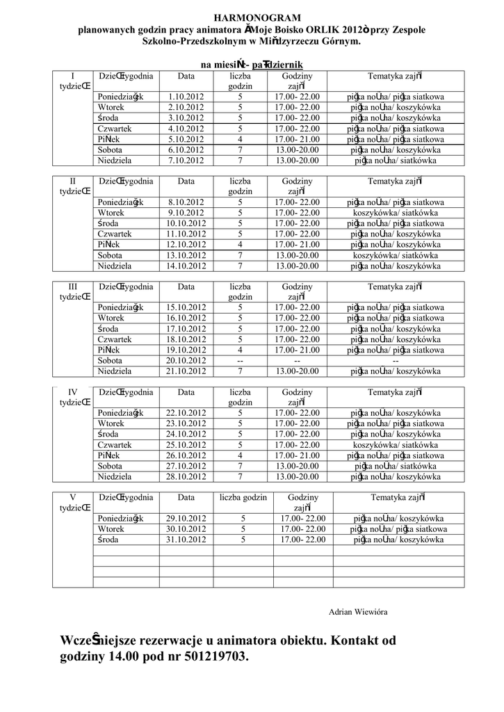 HARMONOGRAM planowanych godzin pracy animatora „Moje Boisko ORLIK 2012” przy Zespole Szkolno-Przedszkolnym w Międzyrzeczu Górnym. na miesiąc- październik I tydzień Dzień tygodnia Poniedziałek Wtorek Środa Czwartek Piątek Sobota Niedziela II tydzień Dzień tygodnia Poniedziałek Wtorek Środa Czwartek Piątek Sobota Niedziela III tydzień Dzień tygodnia Poniedziałek Wtorek Środa Czwartek Piątek Sobota Niedziela IV tydzień Dzień tygodnia Poniedziałek Wtorek Środa Czwartek Piątek Sobota Niedziela V tydzień Dzień tygodnia Poniedziałek Wtorek Środa Data 1.10.2012 2.10.2012 3.10.2012 4.10.2012 5.10.2012 6.10.2012 7.10.2012 Data 8.10.2012 9.10.2012 10.10.2012 11.10.2012 12.10.2012 13.10.2012 14.10.2012 Data 15.10.2012 16.10.2012 17.10.2012 18.10.2012 19.10.2012 20.10.2012 21.10.2012 Data 22.10.2012 23.10.2012 24.10.2012 25.10.2012 26.10.2012 27.10.2012 28.10.2012 liczba godzin 5 5 5 5 4 7 7 Godziny zajęć 17.00- 22.00 17.00- 22.00 17.00- 22.00 17.00- 22.00 17.00- 21.00 13.00-20.00 13.00-20.00 liczba godzin 5 5 5 5 4 7 7 Godziny zajęć 17.00- 22.00 17.00- 22.00 17.00- 22.00 17.00- 22.00 17.00- 21.00 13.00-20.00 13.00-20.00 liczba godzin 5 5 5 5 4 -7 Godziny zajęć 17.00- 22.00 17.00- 22.00 17.00- 22.00 17.00- 22.00 17.00- 21.00 -13.00-20.00 liczba godzin 5 5 5 5 4 7 7 Godziny zajęć 17.00- 22.00 17.00- 22.00 17.00- 22.00 17.00- 22.00 17.00- 21.00 13.00-20.00 13.00-20.00 Data liczba godzin 29.10.2012 30.10.2012 31.10.2012 5 5 5 Godziny zajęć 17.00- 22.00 17.00- 22.00 17.00- 22.00 Tematyka zajęć piłka nożna/ piłka siatkowa piłka nożna/ koszykówka piłka nożna/ koszykówka piłka nożna/ piłka siatkowa piłka nożna/ piłka siatkowa piłka nożna/ koszykówka piłka nożna/ siatkówka Tematyka zajęć piłka nożna/ piłka siatkowa koszykówka/ siatkówka piłka nożna/ piłka siatkowa piłka nożna/ koszykówka piłka nożna/ koszykówka koszykówka/ siatkówka piłka nożna/ koszykówka Tematyka zajęć piłka nożna/ piłka siatkowa piłka nożna/ piłka siatkowa piłka nożna/ koszykówka piłka nożna/ koszykówka piłka nożna/ piłka siatkowa -piłka nożna/ koszykówka Tematyka zajęć piłka nożna/ koszykówka piłka nożna/ piłka siatkowa piłka nożna/ koszykówka koszykówka/ siatkówka piłka nożna/ piłka siatkowa piłka nożna/ siatkówka piłka nożna/ koszykówka Tematyka zajęć piłka nożna/ koszykówka piłka nożna/ piłka siatkowa piłka nożna/ koszykówka Adrian Wiewióra Wcześniejsze rezerwacje u animatora obiektu. Kontakt od godziny 14.00 pod nr 501219703.
