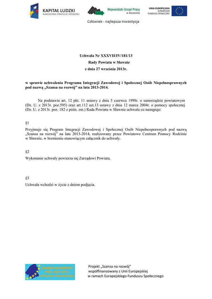 Uchwała Nr XXXVII/IV/181/13 Rady Powiatu w Sławnie z dnia 27 września 2013r. w sprawie uchwalenia Programu Integracji Zawodowej i Społecznej Osób Niepełnosprawnych pod nazwą „Szansa na rozwój” na lata 2013-2014. Na podstawie art. 12 pkt. 11 ustawy z dnia 5 czerwca 1998r. o samorządzie powiatowym (Dz. U. z 2013r. poz.595) oraz art.112 ust.13 ustawy z dnia 12 marca 2004r. o pomocy społecznej (Dz. U. z 2013r. poz. 182 z późn. zm.) Rada Powiatu w Sławnie uchwala co następuje: §1 Przyjmuje się Program Integracji Zawodowej i Społecznej Osób Niepełnosprawnych pod nazwą „Szansa na rozwój” na lata 2013-2014, realizowany przez Powiatowe Centrum Pomocy Rodzinie w Sławnie, w brzmieniu stanowiącym załącznik do uchwały. §2 Wykonanie uchwały powierza się Zarządowi Powiatu. §3 Uchwała wchodzi w życie z dniem podjęcia. Projekt „Szansa na rozwój” współfinansowany z Unii Europejskiej w ramach Europejskiego Funduszu Społecznego Załącznik do Uchwały Rady Powiatu w Sławnie Nr XXXVII/IV/181/13 Z dnia 27 września 2013r. PROGRAM INTEGRACJI ZAWODOWEJ I SPOŁECZNEJ OSÓB NIEPEŁNOSPRAWNYCH „SZANSA NA ROZWÓJ” na lata 2013-2014 realizowany przez POWIATOWE CENTRUM POMOCY RODZINIE W SŁAWNIE w ramach Programu Operacyjnego Kapitał Ludzki wraz z Ośrodkami Pomocy Społecznej z terenu powiatu i Powiatowym Urzędem Pracy w Sławnie Projekt „Szansa na rozwój” współfinansowany z Unii Europejskiej w ramach Europejskiego Funduszu Społecznego Wstęp Powiatowe Centrum Pomocy Rodzinie w Sławnie, jako lider realizuje w 2013 i 2014r. partnerski projekt systemowy pod nazwą „Szansa na rozwój” współfinansowany przez Unię Europejską z Europejskiego Funduszu Społecznego w ramach Programu Operacyjnego Kapitał Ludzki 2007 – 2013, Priorytet VII – Promocja Integracji Społecznej, Działanie 7.1 Rozwój i upowszechnianie aktywnej integracji, Poddziałanie 7.1.2 – Rozwój i upowszechnianie aktywnej integracji przez powiatowe centra pomocy rodzinie. Podstawą prawną realizacji Programu Integracji Społecznej i Zawodowej Osób Niepełnosprawnych pn. „Szansa na rozwój” jest art. 112 ust. 12 i 13 ustawy z dnia 12 marca 2004r. o pomocy społecznej (Dz. U. z 2013r. poz. 182 z póź. zm.), zgodnie z którym Rada Powiatu na podstawie wykazu potrzeb, o których mowa w ust. 12, opracowuje i wdraża lokalne programy pomocy społecznej. Program nawiązuje do takich dokumentów strategicznych, jak: I. • Zasady przygotowania, realizacji i rozliczania projektów systemowych Ośrodków Pomocy Społecznej, Powiatowych Centrów Pomocy Rodzinie oraz Regionalnego Ośrodka Polityki Społecznej w ramach Programu Operacyjnego Kapitał Ludzki na lata 2007-2013, • Zasady finansowania Programu Operacyjnego Kapitał Ludzki, • Narodowe Strategiczne Ramy Odniesienia 2007-2013 Wytyczne w zakresie kwalifikowania wydatków w ramach Programu Operacyjnego Kapitał Ludzki, • Strategia Rozwiązywania Problemów Społecznych w Powiecie Sławieńskim do roku 2015, • Powiatowy Program Działań na Rzecz Osób Niepełnosprawnych w Powiecie Sławieńskim na lata 2007-2015. Grupy docelowe – adresaci programu. Zgodnie z obowiązującymi Zasadami przygotowania, realizacji i rozliczania projektów systemowych Ośrodków Pomocy Społecznej, Powiatowych Centrów Pomocy Rodzinie oraz Regionalnego Ośrodka Polityki Społecznej w ramach Programu Operacyjnego Kapitał Ludzki na lata 2007 – 2013 Program Integracji Społecznej i Zawodowej Osób Niepełnosprawnych to narzędzie adresowane do osób niepełnosprawnych. Projekt „Szansa na rozwój” współfinansowany z Unii Europejskiej w ramach Europejskiego Funduszu Społecznego Z danych Powiatowego Urzędu Pracy w Sławnie na dzień 31-12-2012r. wynika, że 5205 osób na terenie naszego powiatu pozostaje bez pracy, w tym 309 stanowią osoby niepełnosprawne. Do udziału w programie na podstawie złożonych dokumentów i w oparciu o określone w Wytycznych kryteria zostanie zakwalifikowanych w 2013r. 41 osób, natomiast w 2014r. 20 osób (zostanie również stworzona lista rezerwowa). Zakwalifikowane osoby niepełnosprawne pochodzą z terenu powiatu sławieńskiego, korzystały ze świadczeń wypłacanych w oparciu o zapisy ustawy o pomocy społecznej oraz są zagrożone wykluczeniem społecznym. Proces wykluczenia społecznego powoduje, że osoby, rodziny i grupy społeczne funkcjonują na marginesie życia społecznego z różnych przyczyn np.: cech osobowości, długotrwałej choroby, niepełnosprawności, braku wykształcenia, trudności materialnych, dezorganizacji życia rodzinnego, alkoholizmu, splotu innych trudności życiowych czy braku odpowiednich wzorców. Osoby dotknięte wykluczeniem społecznym wykazują problemy z zaspokojeniem podstawowych potrzeb, nie znajdują swojego miejsca na rynku pracy, czują się zagubione, nie potrafią korzystać z przysługujących uprawnień. W konsekwencji zaczynają funkcjonować w wąskim świecie, wśród osób mających takie same problemy, tracąc więzi z innymi członkami społeczności lokalnej. Dlatego też aby skutecznie działać na rzecz osób korzystających z pomocy Powiatowego Centrum Pomocy Rodzinie w Sławnie niezbędnym i wymaganym dokumentem jest Program Integracji Zawodowej i Społecznej Osób Niepełnosprawnych, który został utworzony w celu realizacji działań na rzecz aktywizacji zawodowej i społecznej oraz rozwiązywania problemów osób niepełnosprawnych. Pracownicy Powiatowego Centrum Pomocy Rodzinie w Sławnie poprzez realizację Programu udzielają wsparcia i pomocy środowisku osób niepełnosprawnych w rozwiązywaniu problemów dnia codziennego oraz odnalezieniu się na rynku pracy. Program Integracji Zawodowej i Społecznej Osób Niepełnosprawnych poprzez bogaty wachlarz oferowanych usług ma wpłynąć na wyeliminowanie czynników prowadzących do wykluczenia społecznego osób niepełnosprawnych. Realizacja zadań projektu systemowego oraz niniejszeg