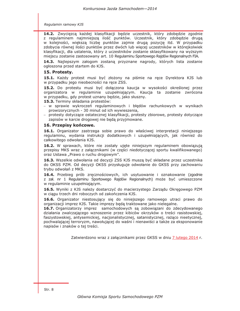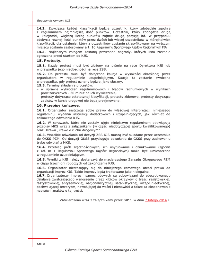 Konkursowa Jazda Samochodem—2014 Regulamin ramowy KJS 14.2. Zwycięzcą każdej klasyfikacji będzie uczestnik, który zdobędzie zgodnie z regulaminem najmniejszą ilość punktów. Uczestnik, który zdobędzie drugą w kolejności, większą liczbę punktów zajmie drugą pozycję itd. W przypadku zdobycia równej ilości punktów przez dwóch lub więcej uczestników w którejkolwiek klasyfikacji, dla ustalenia, który z uczestników zostanie sklasyfikowany na wyższym miejscu zostanie zastosowany art. 10 Regulaminu Sportowego Rajdów Regionalnych FIA. 14.3. Najlepszym załogom zostaną przyznane nagrody, których lista zostanie ogłoszona przed startem do KJS. 15. Protesty. 15.1. Każdy protest musi być złożony na piśmie na ręce Dyrektora KJS lub w przypadku jego nieobecności na ręce ZSS. 15.2. Do protestu musi być dołączona kaucja w wysokości określonej przez organizatora w regulaminie uzupełniającym. Kaucja ta zostanie zwrócona w przypadku, gdy protest uznany będzie, jako słuszny. 15.3. Terminy składania protestów: - w sprawie wykroczeń regulaminowych i błędów rachunkowych w wynikach prowizorycznych - 30 minut od ich wywieszenia, - protesty dotyczące ostatecznej klasyfikacji, protesty zbiorowe, protesty dotyczące zapisów w karcie drogowej nie będą przyjmowane. 16. Przepisy końcowe. 16.1. Organizator zastrzega sobie prawo do właściwej interpretacji niniejszego regulaminu, wydania instrukcji dodatkowych i uzupełniających, jak również do całkowitego odwołania KJS. 16.2. W sprawach, które nie zostały ujęte niniejszym regulaminem obowiązują przepisy MKS wraz z załącznikami (w części niedotyczącej sportu kwalifikowanego) oraz Ustawa „Prawo o ruchu drogowym”. 16.3. Wszelkie odwołania od decyzji ZSS KJS muszą być składane przez uczestnika do OKSS PZM. Od decyzji OKSS przysługuje odwołanie do GKSS przy zachowaniu trybu odwołań z MKS. 16.4. Przebieg prób zręcznościowych, ich usytuowanie i oznakowanie (zgodnie z zał. nr 1 Regulaminu Sportowego Rajdów Regionalnych) może być umieszczone w regulaminie uzupełniającym. 16.5. Wyniki z KJS należy dostarczyć do macierzystego Zarządu Okręgowego PZM w ciągu trzech dni roboczych od zakończenia KJS. 16.6. Organizator niestosujący się do niniejszego ramowego utraci prawo do organizacji imprez KJS. Takie imprezy będą traktowane jako nielegalne. 16.7. Organizatorzy imprez samochodowych są zobowiązani do zdecydowanego działania zwalczającego wznoszenie przez kibiców okrzyków o treści rasistowskiej, faszystowskiej, antysemickiej, nacjonalistycznej, satanistycznej, rażąco nieetycznej, pochwalającej terroryzm, nawołującej do waśni i nienawiści a także za eksponowanie napisów i znaków o tej treści. Zatwierdzono wraz z załącznikami przez GKSS w dniu 7 lutego 2014 r. Str. 8 Główna Komisja Sportu Samochodowego PZM