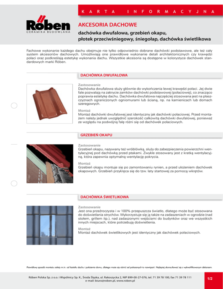 AKCESORIA DACHOWE dachówka dwufalowa, grzebień okapu, płotek przeciwśniegowy, śniegołap, dachówka świetlikowa Fachowe wykonanie każdego dachu obejmuje nie tylko odpowiednio dobrane dachówki podstawowe, ale też cały system akcesoriów dachowych. Umożliwiają one prawidłowe wykonanie detali architektonicznych czy krawędzi połaci oraz podkreślają estetykę wykonania dachu. Wszystkie akcesoria są dostępne w kolorystyce dachówek standardowych marki Röben. DACHÓWKA DWUFALOWA Zastosowanie Dachówka dwufalowa służy głównie do wykończenia lewej krawędzi połaci. Jej dwie fale pozwalają na zakrycie zamków dachówki podstawowej (połaciowej), co znacząco poprawia estetykę dachu. Dachówka dwufalowa najczęściej stosowana jest na płaszczyznach ograniczonych ogniomurami lub ścianą, np. na kamienicach lub domach szeregowych. Montaż Montaż dachówki dwufalowej jest identyczny jak dachówki połaciowej. Przed montażem należy jednak uwzględnić szerokość całkowitą dachówki dwufalowej, ponieważ ze względu na podwójną falę różni się od dachówek połaciowych. GRZEBIEŃ OKAPU Zastosowanie Grzebień okapu, nazywany też wróblówką, służy do zabezpieczenia powierzchni wentylacyjnej pod dachówką przed ptakami. Zwykle stosowany jest z kratką wentylacyjną, która zapewnia optymalną wentylację pokrycia. Montaż Grzebień okapu montuje się po zamontowaniu rynien, a przed ułożeniem dachówek okapowych. Grzebień przykręca się do tzw. łaty startowej za pomocą wkrętów. DACHÓWKA ŚWIETLIKOWA Zastosowanie Jest ona przeźroczysta i w 100% przepuszcza światło, dlatego może być stosowana do doświetlania strychów. Wykorzystuje się ją także na zadaszeniach w ogrodzie (nad stołem, grillem itp.), nad zadaszonymi wejściami do budynków oraz we wszystkich innych miejscach, które potrzebują doświetlenia. Montaż Montaż dachówek świetlikowych jest identyczny jak dachówek połaciowych. Prawidłowy sposób montażu zależy m.in. od kształtu dachu i położenia domu, dlatego może się różnić od pokazanych tu rozwiązań. Najlepiej skonsultować się z wykwalifikowanym dekarzem. Röben Polska Sp. z o.o. i Wspólnicy Sp. K., Środa Śląska, ul. Rakoszycka 2, NIP 899-00-27-076, tel. 71 39 78 100, fax 71 39 78 111 e-mail: [email protected], www.roben.pl 1/2 AKCESORIA DACHOWE dachówka dwufalowa, grzebień okapu, płotek przeciwśniegowy, śniegołap, dachówka świetlikowa ŚNIEGOŁAP Zastosowanie Dzięki rozproszeniu po całej połaci, śniegołapy chronią wszystkie elementy dachu przed zsuwaniem się dużej masy śniegu. Bez śniegołapów, które zatrzymują napór śniegu i rozdzielają go na mniejsze części, zagrożone uszkodzeniem są nie tylko pozostałe elementy przeciwśniegowe, takie jak umieszczone przy krawędzi dachu płotki, ale także kominki odpowietrzające. Zapewnienie osłony kominków odpowietrzających jest szczególnie istotne, jeśli zostały one zamontowane poniżej zalecanej odległości od kalenicy, która wynosi do 1,5 m. Aby zagwarantować skuteczną ochronę, należy umieścić jeden bądź dwa śniegołapy bezpośrednio nad kominkiem. Montaż Montaż wykonuje się podobnie jak w przypadku stopni kominiarskich, wycinając lub wybijając dolne zamki dachówki położonej wyżej i przykręcając dodatkową łatę celem przymocowania uchwytu. Dolna część śniegołapu opiera się na dachówce położonej poniżej. PŁOTEK PRZECIWŚNIEGOWY Zastosowanie Zapobiega gwałtownemu osuwaniu się pokrywy śnieżnej z dachu, zapewniając bezpieczeństwo osób znajdujących się w pobliżu. Istotny szczególnie w przypadku dachów stromych. Montaż Płotki montuje się w dolnej części dachu, poprzez przykręcenie do łaty. Rozstaw elementów zależy od kształtu dachu i stopnia jego nachylenia. Najczęściej umieszcza się je w drugim - trzecim rzędzie dachówek licząc od okapu. Daje to gwarancję, że napierający śnieg nie spowoduje ugięcia krokwi wystających poza podstawę dachu. Przy dachach o nachyleniu większym niż 40° i długości krokwi powyżej 6 m należy, w celu uniknięcia uszkodzenia płotka, zamontować dwa lub nawet więcej rzędów tych elementów. Należy pamiętać, że dachówki w miejscu mocowania płotka nie będą dobrze przylegać, więc trzeba je przyciąć lub przyszlifować. Płotki można montować nawet wtedy, kiedy pokrycie jest już ułożone. W takiej sytuacji należy ściągnąć dachówki w miejscu mocowania płotków. Aby to zrobić, podważa się i zaklinowuje dachówkę po lewej stronie oraz dachówkę w rzędzie powyżej. Jeśli w tym miejscu dachówka była klamrowana, trzeba jeszcze zdjąć klamrę przed wyjęciem dachówki zasłaniającej łatę. Ponieważ dachówki nie mogą w pełni wrócić do swojej poprzedniej pozycji, bo dodany zostanie dodatkowy element w postaci wspornika, trzeba będzie zdemontowane dachówki przyciąć albo np. przyszlifować zamki. Prawidłowy sposób montażu zależy m.in. od kształtu dachu i położenia domu, dlatego może się różnić od pokazanych tu rozwiązań. Najlepiej skonsultować się z wykwalifikowanym dekarzem. 2/2 Röben Polska Sp. z o.o. i Wspólnicy Sp. K., Środa Śląska, ul. Rakoszycka 2, NIP 899-00-27-076, tel. 71 39 78 100, fax 71 39 78 111 e-mail: [email protected], www.roben.pl 2/2