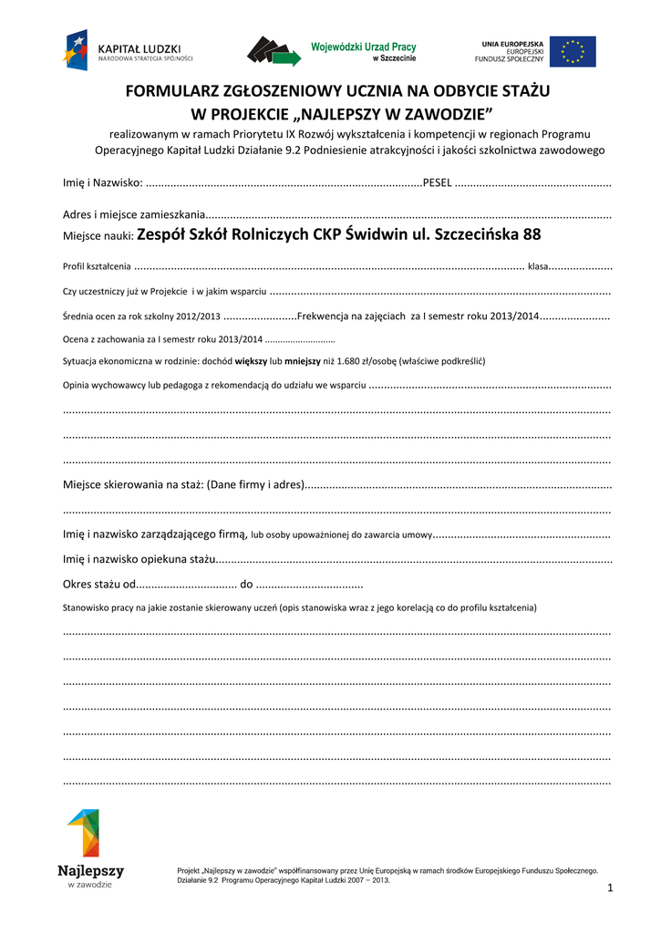 FORMULARZ ZGŁOSZENIOWY UCZNIA NA ODBYCIE STAŻU W PROJEKCIE „NAJLEPSZY W ZAWODZIE” realizowanym w ramach Priorytetu IX Rozwój wykształcenia i kompetencji w regionach Programu Operacyjnego Kapitał Ludzki Działanie 9.2 Podniesienie atrakcyjności i jakości szkolnictwa zawodowego Imię i Nazwisko: ..........................................................................................PESEL ................................................... Adres i miejsce zamieszkania.................................................................................................................................... Miejsce nauki: Zespół Szkół Rolniczych CKP Świdwin ul. Szczecińska 88 Profil kształcenia ............................................................................................................................... klasa..................... Czy uczestniczy już w Projekcie i w jakim wsparciu ............................................................................................................... Średnia ocen za rok szkolny 2012/2013 ........................Frekwencja na zajęciach za I semestr roku 2013/2014 ....................... Ocena z zachowania za I semestr roku 2013/2014 ............................ Sytuacja ekonomiczna w rodzinie: dochód większy lub mniejszy niż 1.680 zł/osobę (właściwe podkreślić) Opinia wychowawcy lub pedagoga z rekomendacją do udziału we wsparciu ............................................................................... .................................................................................................................................................................................. .................................................................................................................................................................................. .................................................................................................................................................................................. Miejsce skierowania na staż: (Dane firmy i adres).................................................................................................... .................................................................................................................................................................................. Imię i nazwisko zarządzającego firmą, lub osoby upoważnionej do zawarcia umowy.......................................................... Imię i nazwisko opiekuna stażu................................................................................................................................. Okres stażu od................................. do ................................... Stanowisko pracy na jakie zostanie skierowany uczeń (opis stanowiska wraz z jego korelacją co do profilu kształcenia) .................................................................................................................................................................................. .................................................................................................................................................................................. .................................................................................................................................................................................. .................................................................................................................................................................................. .................................................................................................................................................................................. .................................................................................................................................................................................. .................................................................................................................................................................................. 1 Oświadczenie pracodawcy co do warunków zapisanych w Projekcie odnośnie przyjęcia ucznia na staż: Niniejszym zobowiązuję się do przyjęcia ........................................................................................................ ucznia Zespołu Szkół Rolniczych CKP w Świdwinie na staż w wyżej określonym terminie i na stanowisku z powyższym zakresem czynności współgrającym z jego programem kształcenia w danym kierunku. Podstawą do skierowania w/w ucznia na staż będzie odrębna umowa pomiędzy Powiatem Świdwińskim, a przyjmującym określająca prawa i obowiązki stron. Przed rozpoczęciem stażu zobowiązuję się do sporządzenia diagnozy kompetencji i kwalifikacji stażysty (we współpracy z nauczycielem), określeniem na tej podstawie celu i programu stażu, zapoznania stażysty z programem stażu, nadzoru nad realizacją stażu. Po zakończeniu stażu zobowiązuję się do sporządzenia dokumentu zawierającego co najmniej poniższe dane: - Imię i nazwisko stażysty, - okres stażu, - cel i program stażu, - opis zadań wykonywanych przez stażystę, - opis kompetencji uzyskanych przez stażystę w wyniku odbycia stażu, - ocenę stażysty dokonaną przez opiekuna, co stanowić będzie podstawę do uznania stażu i wypłacenia należnych środków pieniężnych dla stażysty. W przypadku poniesienia dodatkowych kosztów na opiekę nad stażystą, podstawą do wypłacenia pracodawcy należnych środków, zgodnie z regulaminem Projektu będzie ................................................................................. ....................................................... pieczątka firmowa, telefon i podpis osoby upoważnionej do zawarcia umowy na staż ....................................................... Czytelny podpis ucznia, nr telefonu 2