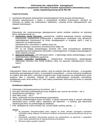 Informacja dot. załączników wymaganych do wniosku o przyznanie refundacji kosztów wyposażenia stanowiska pracy osoby niepełnosprawnej (druk Wn-W) Część B wniosku 1. kserokopie aktualnych dokumentów poświadczających formę prawną wnioskodawcy; 2. aktualne zaświadczenie z banku o posiadanych środkach finansowych, obrotach na rachunku za ostatni rok, ewentualnym zadłużeniu i prawnej formie zabezpieczenia oraz lokatach terminowych. Część C Dokumenty dot. proponowanego zabezpieczenia zwrotu środków (zależnie od wybranej formy zabezpieczenia) np.:, a/ poręczenia osoby fizycznej - dwustronną, czytelną kserokopię dowodu osobistego poręczyciela, oświadczenie poręczyciela o uzyskiwanych dochodach oraz aktualnych zobowiązaniach finansowych na druku obowiązującym w Urzędzie (zał.6 ) oraz w zależności od źródeł dochodu: zaświadczenie o dochodach z zakładu pracy lub aktualną decyzję o przyznaniu emerytury/renty stałej, lub PIT za rok ubiegły potwierdzający dochody (dot. osób prowadzących działalność gospodarczą) oraz zestawienie dochodów z poszczególnych 3 miesięcy poprzedzających dzień złożenia wniosku, b/ gwarancji bankowej – list intencyjny/ pismo z właściwego banku potwierdzający, iż jest zainteresowany udzieleniem gwarancji, c/ blokady rachunku bankowego - oświadczenie Wnioskodawcy wskazującego właściciela rachunku oraz kwotę środków, która ma stanowić zabezpieczenie umowy (zał.4). Część D Odpowiednio: bilans oraz rachunek zysków i strat za ostatnie dwa lata obrotowe – w przypadku podmiotów sporządzających bilans, w pozostałych przypadkach – roczne rozliczenia podatkowe za ostatnie dwa lata wraz z dowodem przyjęcia przez urząd skarbowy lub poświadczone przez audytora albo z dowodem nadania do urzędu skarbowego(w przypadku pracodawcy działającego przez okres krótszy niż 2 lata należy przedstawić dokumenty za okres co najmniej 12 miesięcy). Dodatkowe załączniki: informacja o otrzymanej pomocy de minimis - zał. 1 formularz informacji przedstawianych przy ubieganiu się o pomoc de minimis – zał. 2 oświadczenie pracodawcy – zał. 3 druk oferty pracy - zał. 5 oferty, propozycje cenowe planowanego wyposażenia, dokumenty poświadczające prawo do lokalu, w którym tworzone będą w ramach refundacji stanowiska pracy: umowa najmu, dzierżawy, akt własności – w sytuacji, gdy dokumenty rejestracyjne firmy nie potwierdzają tej lokalizacji, 7. inne, niezbędne do oceny wniosku (np. umowa spółki cywilnej, jawnej ….), 1. 2. 3. 4. 5. 6. Uwaga: W przypadku niewystarczającej ilości miejsca na druku wniosku wymagane wnioskiem informacje należy załączyć na osobnych kartkach oznaczonych (ponumerowanych) tak jak we wniosku. Kserokopie wszystkich dokumentów powinny być potwierdzone za zgodność z oryginałem przez osobę upoważnioną do reprezentowania pracodawcy. Wniosek należy wypełnić czytelnie.