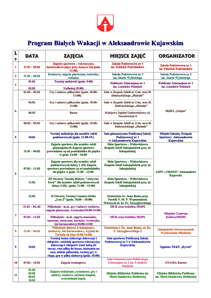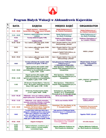 Program Białych Wakacji w Aleksandrowie Kujawskim L P DATA ZAJĘCIA MIEJSCE ZAJĘĆ Zajęcia sportowo – rekreacyjne, Szkoła Podstawowa nr 1 1 31.01 – 02.02 karnawałowe pląsy przy muzyce (od godz. im. Polskich Podróżników 11:00) Konkursy, zajęcia plastyczne, teatralne, Szkoła Podstawowa nr 3 2 31.01 – 04.02 wokalne. im. Józefa Wybickiego 01.02 Turniej siatkówki (godz. 9:00) Publiczne Gimnazjum nr 1 3 ……………………. ……………………………………………… im. Lotników Polskich 02.02 Unihokej (9:00) 01.02 – 02.02 Gry i zabawy piłkarskie (godz. 10:00Sala w Zespole Szkół nr 2 im. mra H. 13:00) Dobrzyńskiego „Hubala” ................................. ........................................................................ ……………………….…………………. 04.02 Gry i zabawy piłkarskie (godz. 10:00Sala w Zespole Szkół nr 2 im. mra H. 13:00) Dobrzyńskiego „Hubala” ................................. ........................................................................ ...................................... 4. 06.02 Basen Kolejowy Szpital Uzdrowiskowy ul. Narutowicza 6 ................................. ........................................................................ .............................................……............. 08.02 – 09.02 Gry i zabawy piłkarskie (godz. 10:00Sala w Zespole Szkół nr 2 im. mra H. 13:00) Dobrzyńskiego „Hubala” 5 10.02 31.01 – 04.02 ................................. 07.02 – 11.02 6 ................................. 11.02 ................................. 12.02 31.01 – 04..02 Turniej unihokeja dla uczniów szkół podstawowych (godz. 11:00-15:) Zajęcia sportowe dla uczniów szkół gimnazjalnych Zajęcia sportowe prowadzone są od poniedziałku do piątku w godz. 14:00 – 16:00 ....................................................…................ Zajęcia sportowe dla uczniów szkół podstawowych (klasy I -III) Zajęcia sportowe prowadzone są od poniedziałku do piątku w godz. 11:00 – 13:00 .................................................…................... III Otwarty Turniej Halowy "Aktywne Ferie" dla uczniów szkół podstawowych (klasy I-III) (godz. 11:00 – 13:00) .......................................................…............. II Otwarty Turniej Counter-Strike „2 on 2” (godz. 10,00 – 18:00) Sala gimnastyczna Publicznej Szkoły Podstawowej nr 1 w Aleksandrowie Kujawskim Hala Sportowo – Widowiskowa Zespołu Szkół Salezjańskich przy ul. Salezjańskiej ORGANIZATOR Szkoła Podstawowa nr 1 im. Polskich Podróżników Szkoła Podstawowa nr 3 im. Józefa Wybickiego Publiczne Gimnazjum nr 1 im. Lotników Polskich MZKS „Orlęta” Miejski Szkolny Związek Sportowy Aleksandrowie Kujawskim .............................……............................. Hala Sportowo – Widowiskowa Zespołu Szkół Salezjańskich przy ul. Salezjańskiej ASPN „VIKING” Aleksandrów ...........................……............................... Kujawski Hala Sportowo – Widowiskowa Zespołu Szkół Salezjańskich przy ul. Salezjańskiej ....................................................……...... Oratorium św. Jana Bosko przy Parafii N. M. P. Wspomożenia Wiernych ul. ks. Fr. Szczygłowskiego MCK oraz świetlica MOPS Półkolonie - m.in. gry i zabawy ruchowe, zajęcia plastyczne, wycieczka(10:00-14:00) ................................. ........................................................................ .................................................................. Miejskie Centrum 7 07.02 – 11.02 Półkolonie - m.in. zajęcia manualne, MCK oraz świetlica MOPS Kultury/MOPS taneczne, muzyczne, karaoke, wycieczka, bal karnawałowy(10:00-14:00 Półkolonie zimowe u Salezjanów: Oratorium i. Św. Jana Bosko, ul. Ks. Salezjańskie Stowarzyszenie 8 31.01 – 04.02 konkursy, bal karnawałowy, wyjazd do F. Szczygłoweskiego 5 Wychowania Młodzieży Torunia do kina (9:00-14:00) Turniej tenisa stołowego dziewcząt I Sala sportowa Publicznej Szkoły chłopców, wielobój sportowo-rekreacyjny Podstawowej nr 3 w Aleksandrowie dziewcząt I chłopców (rzut lotką do Kujawskim 9 10.02 Ognisko TKKF „Rywal” tarczy, rzut piłką do kosza, skakanka na czas, slalom piłkarski), turniej gry w ringo, gra w piłkę siatkową (godz. 10:00) Sala Gimnastyczna Publicznego 10 07.02 – 10.02 Zajęcia treningowe. Gimnazjum nr 1 im. Lotników OYAMA Karate Polskich 01.02 Zajęcia techniczne, rysunkowe, gry i 03.02 Miejska Biblioteka Publiczna im. Miejska Biblioteka Publiczna 11 zabawy ruchowe, czytanie książek, 08.02 Marii Danilewicz Zielińskiej im. Marii Danilewicz Zielińskiej wyświetlanie bajek. 10.02 12 01. - 04.02.2011 31.01 – 11.02 (godz. 9:00-11:00) ................................. 31.01 01.02 02.02 13 03.02 04.02 07.02 08.02 09.02 10.02 11.02 Komenda Hufca ZHP im. Ziemi Kujawskiej w Aleksandrowie Kujawskim Biwak „Na zimowym szlaku” Zajęcia sportowo – rekreacyjne z piłki nożnej ..................................................................... zajęcia dla rocznika 1996/1997 zajęcia dla rocznika 2000/2001 zajęcia dla rocznika 1996/1997 zajęcia dla rocznika 2000/2001 zajęcia dla rocznika 1998/1999 zajęcia dla rocznika 2000/2001 zajęcia dla rocznika 1998/1999 zajęcia dla rocznika 2000/2001 zajęcia dla rocznika 1996/1997 zajęcia dla rocznika 1998/1999 Hala Widowiskowo – Sportowa Towarzystwa Salezjańskiego UKS „Jedynka” Aleksandrów Kujawski
