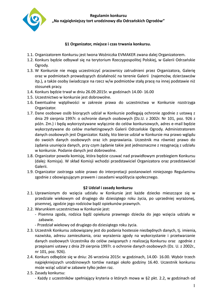 Regulamin konkursu „Na najpiękniejszy tort urodzinowy dla Odrzańskich Ogrodów” §1 Organizator, miejsce i czas trwania konkursu. 1.1. Organizatorem Konkursu jest Iwona Woźniczka EVMAKER zwana dalej Organizatorem. 1.2. Konkurs będzie odbywał się na terytorium Rzeczypospolitej Polskiej, w Galerii Odrzańskie Ogrody. 1.3. W Konkursie nie mogą uczestniczyć pracownicy zatrudnieni przez Organizatora, Galerię oraz w podmiotach prowadzących działalność na terenie Galerii (najemców, dzierżawców itp.), a także osoby świadczące na rzecz w/w podmiotów stałą pracę na innej podstawie niż stosunek pracy. 1.4. Konkurs będzie trwał w dniu 26.09.2015r. w godzinach 14.00- 16.00 1.5. Uczestnictwo w konkursie jest dobrowolne. 1.6. Ewentualne wątpliwości w zakresie prawa do uczestnictwa w Konkursie rozstrzyga Organizator. 1.7. Dane osobowe osób biorących udział w Konkursie podlegają ochronie zgodnie z ustawą z dnia 29 sierpnia 1997r. o ochronie danych osobowych (Dz.U. z 2002r. Nr 101, poz. 926 z późn. Zm.) i będą wykorzystywane wyłącznie do celów konkursowych, adres e-mail będzie wykorzystywane do celów marketingowych Galerii Odrzańskie Ogrody. Administratorem danych osobowych jest Organizator. Każdy, kto bierze udział w Konkursie ma prawo wglądu do swoich danych osobowych oraz ich poprawiania. Uczestnik ma również prawo do żądania usunięcia danych, przy czym żądanie takie jest jednoznaczne z rezygnacją z udziału w konkursie. Podanie danych jest dobrowolne. 1.8. Organizator powoła komisję, która będzie czuwać nad prawidłowym przebiegiem Konkursu (dalej: Komisja). W skład Komisji wchodzi przedstawiciel Organizatora oraz przedstawiciel Galerii. 1.9. Organizator zastrzega sobie prawo do interpretacji postanowień niniejszego Regulaminu zgodnie z obowiązującym prawem i zasadami współżycia społecznego. §2 Udział i zasady konkursu 2.1. Uprawnionym do wzięcia udziału w Konkursie jest każde dziecko mieszczące się w przedziale wiekowym od drugiego do dziesiątego roku życia, po uprzedniej wyrażonej, pisemnej, zgodzie jego rodziców bądź opiekunów prawnych. 2.2. Warunkiem uczestnictwa w Konkursie jest: - Pisemna zgoda, rodzica bądź opiekuna prawnego dziecka do jego wzięcia udziału w zabawie. - Przedział wiekowy od drugiego do dziesiątego roku życia. 2.3. Uczestnik Konkursu zobowiązany jest do podania hostessie niezbędnych danych, tj. imienia, nazwiska, adresu zamieszkania, oraz wyrażenia zgody na wykorzystanie i przetwarzanie danych osobowych Uczestnika do celów związanych z realizacją Konkursu oraz zgodnie z przepisami ustawy z dnia 29 sierpnia 1997r. o ochronie danych osobowych (Dz. U. z 2002r., nr 101, poz. 926). 2.4. Konkurs odbędzie się w dniu: 26 września 2015r. w godzinach, 14.00- 16.00. Wybór trzech najpiękniejszych urodzinowych tortów nastąpi około godziny 16.40. Uczestnik konkursu może wziąć udział w zabawie tylko jeden raz. 2.5. Zasady konkursu: - Każdy z uczestników spełniający kryteria o których mowa w §2 pkt. 2.2, w godzinach od 1 Regulamin konkursu „Na najpiękniejszy tort urodzinowy dla Odrzańskich Ogrodów” 14.00- 16.00 na terenie Galerii Odrzańskie Ogrody w specjalnie przygotowanym kąciku będzie tworzyć za pomocą materiałów dostarczonych przez Organizatora urodzinowy tort. - Organizator powoła komisję, która będzie czuwać nad prawidłowym przebiegiem Konkursu (dalej: Komisja). W skład Komisji wchodzi przedstawiciel Organizatora oraz dwóch przedstawicieli Galerii. - Wyboru najpiękniejszego urodzinowego tortu dokonuje komisja. W skład Komisji wchodzi przedstawiciel Organizatora oraz dwóch przedstawicieli Galerii. - Rozstrzygnięcie konkursu oraz ogłoszenie wyników nastąpi około godziny 16.40 §3 Nagrody 3.1. Nagrodami w konkursie są: I miejsce bon o wartości 500,00 zł do salonu SMYK, mieszczącego się na terenie Galerii Odrzańskie Ogrody, wraz z dodatkową nagrodą pieniężną, którą Fundator w całości potrąca na poczet zryczałtowanego podatku od wygranej o łącznej wartości 55,00 zł II miejsce bon o wartości 300,00 zł do salonu SMYK, mieszczącego się na terenie Galerii Odrzańskie Ogrody, wraz z dodatkową nagrodą pieniężną, którą Fundator w całości potrąca na poczet zryczałtowanego podatku od wygranej o łącznej wartości 34,00 zł III miejsce bon o wartości 200,00 zł do salonu SMYK, mieszczącego się na terenie Galerii Odrzańskie Ogrody, wraz z dodatkową nagrodą pieniężną, którą Fundator w całości potrąca na poczet zryczałtowanego podatku od wygranej o łącznej wartości 22,00 zł Nagroda specjalna bon o wartości 150,00 zł do wykorzystania na desery dla całej rodziny w Carte d'Or. Fundatorem nagrody jest Carte d'Or. 3.2. Dodatkowe nagrody pieniężne zostaną pobrane przez fundatora, jako płatnika 10% ryczałtowego podatku dochodowego od osób fizycznych od przekazanych w konkursie nagród (art. 30 ust. 1 pkt 2 Ustawy o podatku dochodowym od osób fizycznych) i przekazana do właściwego urzędu skarbowego. Potrącenie 10% podatku zryczałtowanego od łącznej wartości nagrody oznacza, że pieniężna część nagrody nie będzie wydawana zwycięzcy. 3.3. Prawa do nagrody nie można przenieść na osobę trzecią. 3.4. Fundatorem nagród miejsc I,II,III są Odrzańskie Ogrody Sp. z o.o. §4 Realizacja nagród 4.1. Zwycięzca, któremu przyznano nagrodę, ma prawo zrzec się prawa do przyznanej mu nagrody, składając Organizatorowi na piśmie stosowne oświadczenie w tym zakresie. W takim przypadku dokonuje się ponownego ustalenia zwycięskiego urodzinowego tortu z pominięciem tortu zgłoszonego przez pierwotnego zwycięzcę. 4.2. Warunkiem uzyskania nagrody jest: osobista obecność podczas ogłoszenia wyników, osobiste odebranie nagrody przez zwycięzcę oraz kompletne wypełnienie i podpisanie protokołu odbioru nagrody przez rodzica bądź opiekuna prawnego (imię, nazwisko, adres zameldowania, numer dow