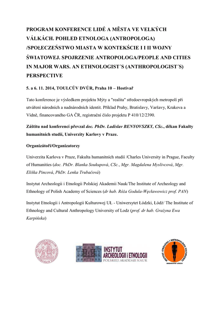 PROGRAM KONFERENCE LIDÉ A MĚSTA VE VELKÝCH VÁLKÁCH. POHLED ETNOLOGA (ANTROPOLOGA) /SPOŁECZEŃSTWO MIASTA W KONTEKŚCIE I I II WOJNY ŚWIATOWEJ. SPOJRZENIE ANTROPOLOGA/PEOPLE AND CITIES IN MAJOR WARS. AN ETHNOLOGIST´S (ANTHROPOLOGIST´S) PERSPECTIVE 5. a 6. 11. 2014, TOULCŮV DVŮR, Praha 10 − Hostivař Tato konference je výsledkem projektu Mýty a "realita" středoevropských metropolí při utváření národních a nadnárodních identit. Příklad Prahy, Bratislavy, Varšavy, Krakova a Vídně, financovaného GA ČR, registrační číslo projektu P 410/12/2390. Záštitu nad konferencí převzal doc. PhDr. Ladislav BENYOVSZKY, CSc., děkan Fakulty humanitních studií, Univerzity Karlovy v Praze. Organizátoři/Organizatorzy Univerzita Karlova v Praze, Fakulta humanitních studií /Charles University in Prague, Faculty of Humanities (doc. PhDr. Blanka Soukupová, CSc., Mgr. Magdalena Myslivcová, Mgr. Eliška Pincová, PhDr. Lenka Trubačová) Instytut Archeologii i Etnologii Polskiej Akademii Nauk/The Institute of Archeology and Ethnology of Polish Academy of Sciences (dr hab. Róża Godula-Węcławowicz prof. PAN) Instytut Etnologii i Antropologii Kulturowej UŁ - Uniwersytet Łódzki, Łódź/ The Institute of Ethnology and Cultural Anthropology University of Lodz (prof. dr hab. Grażyna Ewa Karpińska) PROGRAM KONFERENCE LIDÉ A MĚSTA VE VELKÝCH VÁLKÁCH. POHLED ETNOLOGA (ANTROPOLOGA) Antonín Soukup (14. 6. 1882 Přechovice − 7. 4. 1944 Volyně), v roce 1916 ? jako svobodník, samaritán vojenského vlaku Středa/Środa 5. 11. 2014 9.30 − 10.00 prezence 10.00 − 10.15 Blanka Soukupová, Róża Godula Węcławowicz, Grażyna Ewa Karpińska − zahájení konference/otwarcie konferencji VÁLKA A MĚSTO I/WOJNA A MIASTO I • Moderuje dr hab. Róża Godula Węcławowicz prof. PAN 10.15 − 10.35 Válka a město jako badatelský problém (prof. PhDr. Miroslav Hroch, DrSc., Univerzita Karlova v Praze, Fakulta humanitních studií) 10.35 − 10.55 Urban symbolism of WWII in Moscow. Expression of glory, peace and inevitability of wars (Зиновьева Ольга Андреевна, доцент факультета искусств МГУ им. М. В. Ломоносова − prof. Olga Zinovieva, Lomonosov Moscow State University) 10.55 − 11.15 Společnost a město po velkých válkách. Sny, rituály, symboly, „realita“ v okamžiku historické změny (Příklad Prahy) (doc. PhDr. Blanka Soukupová, CSc.) 11.15 – 11.45 přestávka na kávu/przerwa kawowa VÁLKA A MĚSTO II/WOJNA A MIASTO II: TRADICE, MÍSTA PAMĚTI/TRADYCJA, MIEJCE PAMIĘCI • Moderuje prof. nadzw. dr hab. Grażyna Ewa Karpińska 11.45 − 12.05 Tradycja wynaleziona z traumy wojny (dr hab. Róża Godula-Węcławowicz prof. PAN) 12.05 – 12.25 Pamięć o wojnach i prześladowaniach. Muzea Buriackie i Mongolskie (prof. dr hab. Ewa Nowicka, Collegium Civitatitis, Uniwersytet Warszawski) 12.25 − 12.45 Konflikty wokól miejsc pamięci mniejszości narodowych w Polsce (prof. dr hab. Anita Adamczyk, Uniwersytet im. Adama Mickiewicza Poznań, Wydział Nauk Politycznych i Dziennikarstwa) 12.45 – 13.00 diskuse/dyskusja 13.00 – 15.00 přestávka na oběd/przerwa obiadowa, procházka po Toulcově dvoře/spacer po Toulcowym Dworze VÁLKA A MĚSTO III/WOJNA A MIASTO III: TRADICE, MÍSTA PAMĚTI/TRADYCJA, MIEJCE PAMIĘCI • Moderuje prof. nadzw. dr hab. Tomasz Węcławowicz, Krakowska Akademia Andrzeja Frycza Mordzewskiego 15.00 – 15.20 Ikonoklasmus po prvej svetovej vojne (príklad južné Slovensko) (doc. PhDr. József Liszka, PhD., Univerzita J. Selyeho, Výskumné centrum európskej etnológie v Komárne) 15.20 – 15.40 Vplyv Veľkej vojny na kultúru sviatkov a ich pamäť v Uhorsku (na príklade verejného prostoru Banskej Bystrice) (Mgr. Alica Kurhajcová, PhD., Univerzita Mateja Bela v Banskej Bystrici, Filozofická fakulta) 15.40 – 16.00 Od charity k iredentizmu. Zmena funkcie jedného typu objektov z prvej svetovej vojny (Ilona L. Juhász, PhD., Výskumné centrum európskej etnológie v Komárne) 16.00 − 16.20 Lokalne narracje o przestrzeni miejskiej Krzeszowic (dr Maria Godyń, Instytut Archeologii i Etnologii Polskiej Akademii Nauk) 16.20 – 16.40 přestávka na kávu/przerwa kawowa VÁLKA A MĚSTO III/WOJNA A MIASTO IV: TRADICE, MÍSTA PAMĚTI, ZMĚNY/TRADYCJA, MIEJCE PAMIĘCI, ZMIANY • Moderuje prof. dr hab. Andrzej Paweł Wejland 16.40 – 17.00 Vězení na ulici Sterlinga v Lodži v časech druhé světové války − relikty paměti a místa (Olgierd Ławrynowicz, Ph.D., Uniwersytet Łódzki, Instytut Archeologii, Mgr. Michal Rak, Ph.D., Západočeská univerzita v Plzni, Fakulta filozofická) 17.00 – 17.20 Wojna i pokój Katalończyków (mgr Blanka Rzewuska, Uniwersytet Warszawski) 17.20 − 17.40 A Nation Found in the War: New Minsk and Its Industrial Settlements, 1944−1974 (Mgr. Natallia Linitskaya, Univerzita Karlova v Praze, Filozofická fakulta) 17.40 – 18.00 Malé město ve velké válce. Na příkladu Písku (Mgr. Magdalena Myslivcová, Univerzita Karlova v Praze, Fakulta humanitních studií) 18.00 – 18.20 Násilné etnické a sociální změny v průběhu čtyřicátých let 20. století a jejich vliv na dlouhodobý vývoj lokality. Případová studie vyloučené oblasti ve středu Brna (Mgr. et Mgr. Klára Brožovičová, Ph.D., Masarykova univerzita v Brně, Filozofická fakulta, Ústav evropské etnologie) 18.20 – 18.40 diskuse/dyskusja 18.40 – 19.30 banket/bankiet Čtvrtek (Czwartek) 6. 11. 2014 9.30 – 10.00 prezence VÁLKA V TRADICÍCH MYŠLENÍ/WOJNA W TRADYCJACH MYŚLENIA • Moderuje doc. PhDr. Blanka Soukupová, CSc. 10.00 − 10.20 „Velká válka“ v židovských liturgických textech (ThDr. Pavla Damohorská, Th.D., Univerzita Karlova v Praze, Husitská teologická fakulta) 10.20 − 10.40 II wojna światowa i jej miejsce w konstruowaniu europejskiej pamięci zbiorowej (dr Lesiewicz Elżbieta, Uniwersytet im. Adama Mickiewicza P