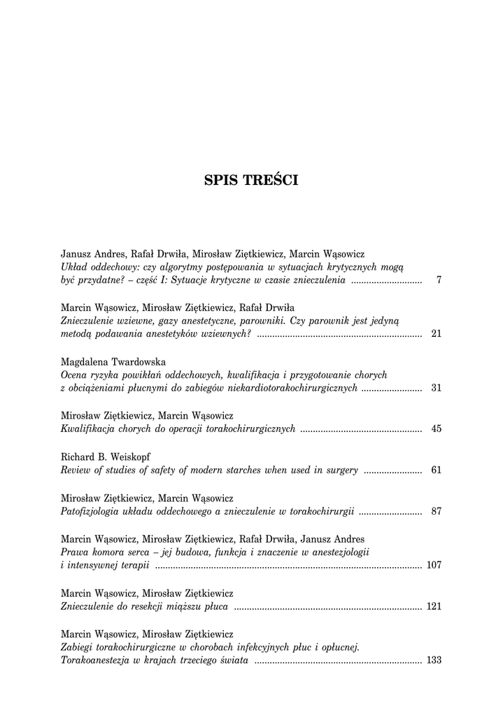 SPIS TREŚCI Janusz Andres, Rafał Drwiła, Mirosław Ziętkiewicz, Marcin Wąsowicz Układ oddechowy: czy algorytmy postępowania w sytuacjach krytycznych mogą być przydatne? – część I: Sytuacje krytyczne w czasie znieczulenia ............................ 7 Marcin Wąsowicz, Mirosław Ziętkiewicz, Rafał Drwiła Znieczulenie wziewne, gazy anestetyczne, parowniki. Czy parownik jest jedyną metodą podawania anestetyków wziewnych? ................................................................. 21 Magdalena Twardowska Ocena ryzyka powikłań oddechowych, kwalifikacja i przygotowanie chorych z obciążeniami płucnymi do zabiegów niekardiotorakochirurgicznych ........................ 31 Mirosław Ziętkiewicz, Marcin Wąsowicz Kwalifikacja chorych do operacji torakochirurgicznych ................................................ 45 Richard B. Weiskopf Review of studies of safety of modern starches when used in surgery ....................... 61 Mirosław Ziętkiewicz, Marcin Wąsowicz Patofizjologia układu oddechowego a znieczulenie w torakochirurgii ......................... 87 Marcin Wąsowicz, Mirosław Ziętkiewicz, Rafał Drwiła, Janusz Andres Prawa komora serca – jej budowa, funkcja i znaczenie w anestezjologii i intensywnej terapii ......................................................................................................... 107 Marcin Wąsowicz, Mirosław Ziętkiewicz Znieczulenie do resekcji miąższu płuca .......................................................................... 121 Marcin Wąsowicz, Mirosław Ziętkiewicz Zabiegi torakochirurgiczne w chorobach infekcyjnych płuc i opłucnej. Torakoanestezja w krajach trzeciego świata .................................................................. 133 Artur Szlubowski, Mirosław Ziętkiewicz Techniki bronchoskopowe w OIT ..................................................................................... 143 Mirosław Ziętkiewicz, Małgorzata Urbańczyk-Zawadzka, Robert Banyś Radiologia klatki piersiowej w OIT ................................................................................ 151 Mirosław Ziętkiewicz, Marcin Wąsowicz, Rafał Drwiła, Janusz Andres Obrzęk płuc ........................................................................................................................ 181 Rafał Drwiła, Mirosław Ziętkiewicz, Karol Wierzbicki, Janusz Andres Pooperacyjna niewydolność oddechowa ........................................................................... 211 Rafał Drwiła, Karol Wierzbicki, Janusz Andres VAP – patofizjologia, algorytm postępowania według ATS .......................................... 223 Rafał Drwiła, Mirosław Ziętkiewicz, Karol Wierzbicki Nieinwazyjna wentylacja – rola w leczeniu okołooperacyjnej niewydolności oddechowej oraz w innych wskazaniach ......................................................................... 237 Mirosław Ziętkiewicz, Marcin Wąsowicz, Rafał Drwiła, Janusz Andres Terapia wentylacyjna pacjentów z zaostrzeniem chorób obturacyjnych ...................... 245 Dariusz Maciejewski Współczesne tryby wentylacji mechanicznej – w poszukiwaniu wiarygodnych dowodów na kliniczne preferowanie jednego z nich ...................................................... 261 Dariusz Maciejewski ARDS – nowa definicja i wybrane strategie leczenia ze szczególnym uwzględnieniem terapii wentylacyjnej ............................................................................. 273 Wiesław Królikowski Ostra niewydolność oddechowa typu ARDS – system opieki nad chorym z ciężką hipoksemią. Nowe wyzwania – grypa A/H1N1 i możliwości ECMO .......................... 289 Waldemar Machała Urazy klatki piersiowej ..................................................................................................... 295 Tomasz Źródłowski Ból w chirurgii klatki piersiowej ..................................................................................... 325 Marcin Wąsowicz, Mirosław Ziętkiewicz, Rafał Drwiła Przeszczep płuc a anestezjolog ......................................................................................... 337