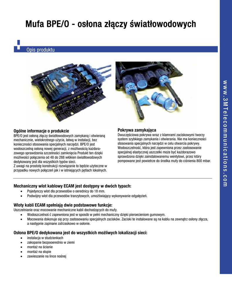 Mufa BPE/O - osłona złączy światłowodowych Opis produktu Pokrywa zamykająca BPE/O jest osłoną złączy światłowodowych zamykaną i otwieraną mechanicznie, wielokrotnego użycia, łatwą w instalacji, bez konieczności stosowania specjalnych narzędzi. BPE/O jest wodoszczelną osłoną nowej generacji, z możliwością każdorazowego sprawdzenia szczelności zamknięcia Produkt ten dzięki możliwości połączenia od 48 do 288 włókien światłowodowych dedykowany jest dla wszystkich typów sieci. Z uwagi na prostotę konstrukcji rozwiązanie to będzie użyteczne w przypadku nowych połączeń jak i w istniejących pętlach lokalnych. Dwuczęściowa pokrywa wraz z klamrami zaciskowymi tworzy system szybkiego zamykania i otwierania. Nie ma konieczności stosowania specjalnych narzędzi w celu otwarcia pokrywy. Wodoszczelność, która jest zapewniona przez zastosowanie specjalnej elastycznej uszczelki może być każdorazowo sprawdzona dzięki zainstalowanemu wentylowi, przez który pompowane jest powietrze do środka mufy do ciśnienia 800 mbar. Mechaniczny wlot kablowy ECAM jest dostępny w dwóch typach: • • Pojedynczy wlot dla przewodów o oerednicy do 18 mm. Podwójny wlot dla przewodów tranzytowych, umożliwiający wykonywanie odgałęzień. Wloty kabli ECAM spełniają dwie podstawowe funkcje: Uszczelnianie oraz mocowanie mechaniczne kabli dochodzących do mufy. • Wodoszczelnoś ć zapewniona jest w sposób w pełni mechaniczny dzięki pieroecieniom gumowym. • Mocowania dokonuje się przy zastosowaniu specjalnych zacisków. Zaciski te instalowane są na kablu na zewnątrz osłony złącza, a następnie zapinane zatrzaskowo w osłonie. Osłona BPE/O dedykowana jest do wszystkich możliwych lokalizacji sieci: • • • • • instalacja w studzienkach zakopanie bezpooerednio w ziemi montaż na ścianie montaż na słupie zawieszanie na lince nośnej www.3MTelecommunications.com Ogólne informacje o produkcie Mufa BPE/O - osłona złączy światłowodowych Informacje techniczne Materiały Obudowa i kasety Elementy systemu prowadzenia kabli Śruby tworzywo termoplastyczne tworzywo termoplastyczne stal nierdzewna Wodoszczelność (IP 68-NF EN 60 529) Stałe ciśnienie; 80 mbar (IK 10 EN 50 102) 20 dżuli 100 daN Odporność udarowa Odporność na działanie siły rozciągającej Rozmiar i pojemność kabla Wymiary gabarytowe: • Bez wlotów Zastosowanie i pojemność światłowodu (rozmiar T1) 326x204x92 mm Typ Zastosowania 349x204x92 mm Pojemność spawów 4 pojedyncze wloty 1 wlot podwójny 2 wloty pojedyncze Średnica pojedynczego wlotu ECAM (średnica kabla) Średnica podwójnego wlotu ECAM (średnica kabla) • Z wlotami Ilość otworów wejściowych Liczba kaset BPE/O T1−4C12 łączenie, odgałęzianie 48 pojedynczych spawów 4 BPE/O T1−4C12 PAS łączenie, odgałęzianie, przelotowo 48 pojedynczych spawów 4 Rodzaj kasety 12 OF 12 OF luźna tuba 5-18 mm Strefa magazynowania nie tak 4-20 mm Łączenie na styk tak tak Nazwa produktu BPE/O T1−4C12 4 kasety (12 włókien światłowodowych) 2 pojedyncze wloty kablowe ECAM 2 zaślepki BPE/O T1−4C12 PAS 4 kasety (12 włókien światłowodowych) 1 podwójny wlot kablowy ECAM 2 pojedyncze wloty kablowe ECAM 1 zaślepka Akcesoria dodatkowe ECAM D5−18 S – pojedynczy wlot kablowy zestaw uziemiający zestaw do montazu naściennego zestaw do montaźu na słupie zestaw do zawieszenia na lince nośnej Numer ref. N501198A0000 N501199A0000 N721059A0000 N151064A0000 N151359A0000 www.3MTelecommunications.com Parametry