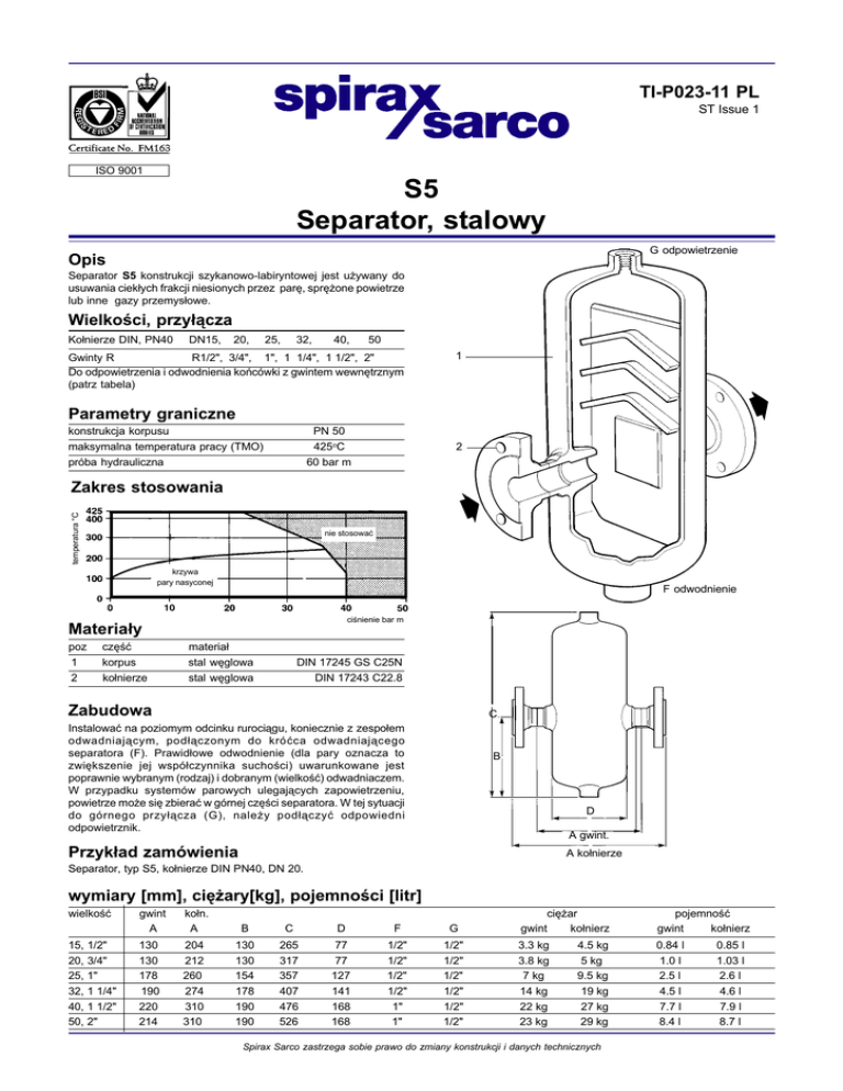 TI-P023-11 PL ST Issue 1 ISO 9001 S5 Separator, stalowy G odpowietrzenie Opis Separator S5 konstrukcji szykanowo-labiryntowej jest u¿ywany do usuwania ciek³ych frakcji niesionych przez parê, sprê¿one powietrze lub inne gazy przemys³owe. Wielkoci, przy³¹cza Ko³nierze DIN, PN40 DN15, 20, 25, 32, 40, 50 Gwinty R R1/2", 3/4", 1", 1 1/4", 1 1/2", 2" Do odpowietrzenia i odwodnienia koñcówki z gwintem wewnêtrznym (patrz tabela) 1 Parametry graniczne konstrukcja korpusu maksymalna temperatura pracy (TMO) próba hydrauliczna PN 50 425oC 60 bar m 2 temperatura °C Zakres stosowania nie stosowaæ krzywa pary nasyconej F odwodnienie cinienie bar m Materia³y poz czêæ materia³ 1 korpus stal wêglowa DIN 17245 GS C25N 2 ko³nierze stal wêglowa DIN 17243 C22.8 Zabudowa C Instalowaæ na poziomym odcinku ruroci¹gu, koniecznie z zespo³em odwadniaj¹cym, pod³¹czonym do króæca odwadniaj¹cego separatora (F). Prawid³owe odwodnienie (dla pary oznacza to zwiêkszenie jej wspó³czynnika suchoci) uwarunkowane jest poprawnie wybranym (rodzaj) i dobranym (wielkoæ) odwadniaczem. W przypadku systemów parowych ulegaj¹cych zapowietrzeniu, powietrze mo¿e siê zbieraæ w górnej czêci separatora. W tej sytuacji do górnego przy³¹cza (G), nale¿y pod³¹czyæ odpowiedni odpowietrznik. B D A gwint. Przyk³ad zamówienia A ko³nierze Separator, typ S5, ko³nierze DIN PN40, DN 20. wymiary [mm], ciê¿ary[kg], pojemnoci [litr] wielkoæ 15, 1/2" 20, 3/4" 25, 1" 32, 1 1/4" 40, 1 1/2" 50, 2" gwint A ko³n. A B C D F G 130 130 178 190 220 214 204 212 260 274 310 310 130 130 154 178 190 190 265 317 357 407 476 526 77 77 127 141 168 168 1/2" 1/2" 1/2" 1/2" 1" 1" 1/2" 1/2" 1/2" 1/2" 1/2" 1/2" ciê¿ar gwint ko³nierz pojemnoæ gwint ko³nierz 3.3 kg 3.8 kg 7 kg 14 kg 22 kg 23 kg 0.84 l 1.0 l 2.5 l 4.5 l 7.7 l 8.4 l 4.5 kg 5 kg 9.5 kg 19 kg 27 kg 29 kg Spirax Sarco zastrzega sobie prawo do zmiany konstrukcji i danych technicznych 0.85 l 1.03 l 2.6 l 4.6 l 7.9 l 8.7 l ( Uwaga: liczby wystêpuj¹ce na nomogramach w nawiasach, odpowiadaj¹ jednostkom brytyjskim, np [lb/h]) Przyk³ad doboru - para nasycona 1. Przy za³o¿eniu parametrów pary: cinienie 12 bar man, przep³yw 500 kg/h znajdujemy punkt A o wspó³rzêdnych j.w. i rysujemy pionow¹ liniê A-D. 2. Z punktu A rysujemy liniê poziom¹ A-B. 3. Znajdujemy punkt(y) przeciêcia siê linii A-B z krzywymi separatora(ów). Punktom le¿¹cym w obszarze zaciemnionym odpowiadaj¹ wielkoci separatorów gwarantuj¹ce blisko 100%-ow¹ sprawnoæ. 4. Prêdkoæ przep³ywu pary w ruroci¹gu okrela pionowa linia B-C (np.18m/s dla ruroci¹gu DN32). 5. Strata cinienia na separatorze jest okrelona przez punkt przeciêcia siê linii C-D i A-D. W naszym przyk³adzie le¿y on w obszarze spadków mniejszych ni¿ 0.05 bar. wielkoæ separatora przep³yw masowy [ kg/h] Nomogram doboru dla pary cinienie [ bar man] prêdkoæ przep³ywu[m/s] spadek cinienia na separatorze [bar] Przyk³ad doboru - powietrze wielkoæ separatora przep³yw objêtociowy [ Nl/s] Nomogram doboru dla powietrza cinienie [bar man] prêdkoæ przep³ywu [m/s] 1. Przy za³o¿eniu parametrów powietrza: cinienie 8 bar man, przep³yw 100 Nl/s rysujemy pionow¹ liniê L-L. 2. Z punktu L rysujemy liniê poziom¹ L-M. 3. Znajdujemy punkt(y) przeciêcia siê linii L-M z krzywymi separatora(ów). Punktom le¿¹cym w obszarze zaciemnionym odpowiadaj¹ wielkoci separatorów gwarantuj¹ce blisko 100%-ow¹ sprawnoæ. 4. Prêdkoæ przep³ywu powietrza w ruroci¹gu okrela pionowa liniaM-N (np.10m/s dla ruroci¹gu DN32). 5. Strata cinienia na separatorze jest okrelona przez punkt przeciêcia siê linii M-N i L-N. W naszym przyk³adzie le¿y on w obszarze spadków mniejszych ni¿ 0.02 bar. Uwaga: separatory powinny byæ dobierane na zasadzie najlepszego kompromisu, uwzglêdniaj¹cego rednicê ruroci¹gu, wynikaj¹c¹ z tej rednicy prêdkoæ liniow¹ pary/gazu i dopuszczaln¹ stratê cinienia. Przy doborze separatorów dla innych gazów przemys³owych polecamy bezp³atne konsultacje u specjalistów Spirax Sarco. Prosimy wtedy o podanie nastêpuj¹cych informacji o gazie: nazwa gazu, cinienie pracy, przep³yw objêtociowy, prêdkoæ liniowa oraz gêstoæ. Zapraszamy do wspó³pracy, dziêkujemy ! spadek cinienia na separatorze [bar] S5 Separator, stalowy TI-P023-11 PL ST Issue 1