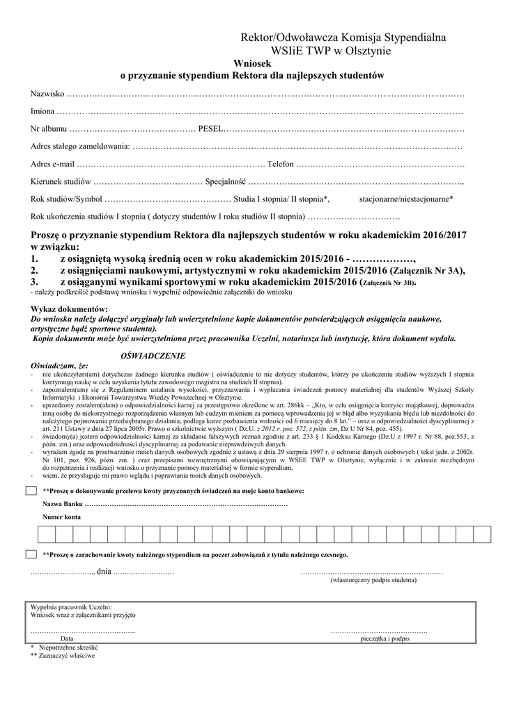 Rektor/Odwoławcza Komisja Stypendialna WSIiE TWP w Olsztynie Wniosek o przyznanie stypendium Rektora dla najlepszych studentów Nazwisko …………………………………………………………………………………………………………………………… Imiona ……………………………………………………………………………………………………………………………… Nr albumu ……………………………………… PESEL…………………………………………………..……………………… Adres stałego zameldowania: ……………………………………………………………………………………………………… Adres e-mail …………………………………………………………. Telefon …………………………………………………… Kierunek studiów ………………………………… Specjalność ………………………………………………………………….. Rok studiów/Symbol ……………………………………… Studia I stopnia/ II stopnia*, stacjonarne/niestacjonarne* Rok ukończenia studiów I stopnia ( dotyczy studentów I roku studiów II stopnia) …………………………… Proszę o przyznanie stypendium Rektora dla najlepszych studentów w roku akademickim 2016/2017 w związku: 1. z osiągniętą wysoką średnią ocen w roku akademickim 2015/2016 - ………………, 2. z osiągnięciami naukowymi, artystycznymi w roku akademickim 2015/2016 (Załącznik Nr 3A), 3. z osiąganymi wynikami sportowymi w roku akademickim 2015/2016 (Załącznik Nr 3B). - należy podkreślić podstawę wniosku i wypełnić odpowiednie załączniki do wniosku Wykaz dokumentów: Do wniosku należy dołączyć oryginały lub uwierzytelnione kopie dokumentów potwierdzających osiągnięcia naukowe, artystyczne bądź sportowe studenta). Kopia dokumentu może być uwierzytelniona przez pracownika Uczelni, notariusza lub instytucję, która dokument wydała. OŚWIADCZENIE Oświadczam, że: - - - nie ukończyłem(am) dotychczas żadnego kierunku studiów ( oświadczenie to nie dotyczy studentów, którzy po ukończeniu studiów wyższych I stopnia kontynuują naukę w celu uzyskania tytułu zawodowego magistra na studiach II stopnia). zapoznałem(am) się z Regulaminem ustalania wysokości, przyznawania i wypłacania świadczeń pomocy materialnej dla studentów Wyższej Szkoły Informatyki i Ekonomii Towarzystwa Wiedzy Powszechnej w Olsztynie. uprzedzony zostałem(ałam) o odpowiedzialności karnej za przestępstwo określone w art. 286kk – „Kto, w celu osiągnięcia korzyści majątkowej, doprowadza inną osobę do niekorzystnego rozporządzenia własnym lub cudzym mieniem za pomocą wprowadzenia jej w błąd albo wyzyskania błędu lub niezdolności do należytego pojmowania przedsiębranego działania, podlega karze pozbawienia wolności od 6 miesięcy do 8 lat.” – oraz o odpowiedzialności dyscyplinarnej z art. 211 Ustawy z dnia 27 lipca 2005r. Prawo o szkolnictwie wyższym ( Dz.U. z 2012 r. poz. 572, z późn. zm, Dz U Nr 84, poz. 455). świadomy(a) jestem odpowiedzialności karnej za składanie fałszywych zeznań zgodnie z art. 233 § 1 Kodeksu Karnego (Dz.U z 1997 r. Nr 88, poz.553, z późn. zm.) oraz odpowiedzialności dyscyplinarnej za podawanie nieprawdziwych danych. wyrażam zgodę na przetwarzanie moich danych osobowych zgodnie z ustawą z dnia 29 sierpnia 1997 r. o ochronie danych osobowych ( tekst jedn. z 2002r. Nr 101, poz. 926, późn. zm. ) oraz przepisami wewnętrznymi obowiązującymi w WSIiE TWP w Olsztynie, wyłącznie i w zakresie niezbędnym do rozpatrzenia i realizacji wniosku o przyznanie pomocy materialnej w formie stypendium, wiem, że przysługuje mi prawo wglądu i poprawiania moich danych osobowych. **Proszę o dokonywanie przelewu kwoty przyznanych świadczeń na moje konto bankowe: Nazwa Banku ……………………………………………………………………………… Numer konta **Proszę o zarachowanie kwoty należnego stypendium na poczet zobowiązań z tytułu należnego czesnego. ………………………., dnia ……………………… ……………………………………………………… (własnoręczny podpis studenta) Wypełnia pracownik Uczelni: Wniosek wraz z załącznikami przyjęto ……………………………………….. Data * Niepotrzebne skreślić ** Zaznaczyć właściwe ……………………………………. pieczątka i podpis STWIERDZAM: kompletność złożonych dokumentów, brak wymaganych dokumentów …………………………………….…………………………….. ……………………………………………………………………………………………………… ……………………………………………………………………………………………………… wysłano informację o konieczności uzupełnienia wniosku .……………………………………....... ……………………………………………………………………………………………………… Olsztyn, dnia………………………… ……………………………………………… podpis pracownika administracyjnego Wypełnia Rektor/Odwoławcza Komisja Stypendialna Decyzja Rektor/Odwoławcza Komisja Stypendialna przyznaje/nie przyznaje* stypendium Rektora dla najlepszych studentów w wysokości ……………. zł w 9 ratach/ ………..ratach * Powód decyzji negatywnej ( szczegóły w decyzji administracyjnej): …………………………………………………………… …………………………………………………………………………………………………………………………………….. Uwagi: ……………………………………………………………………………………………………………………………. 